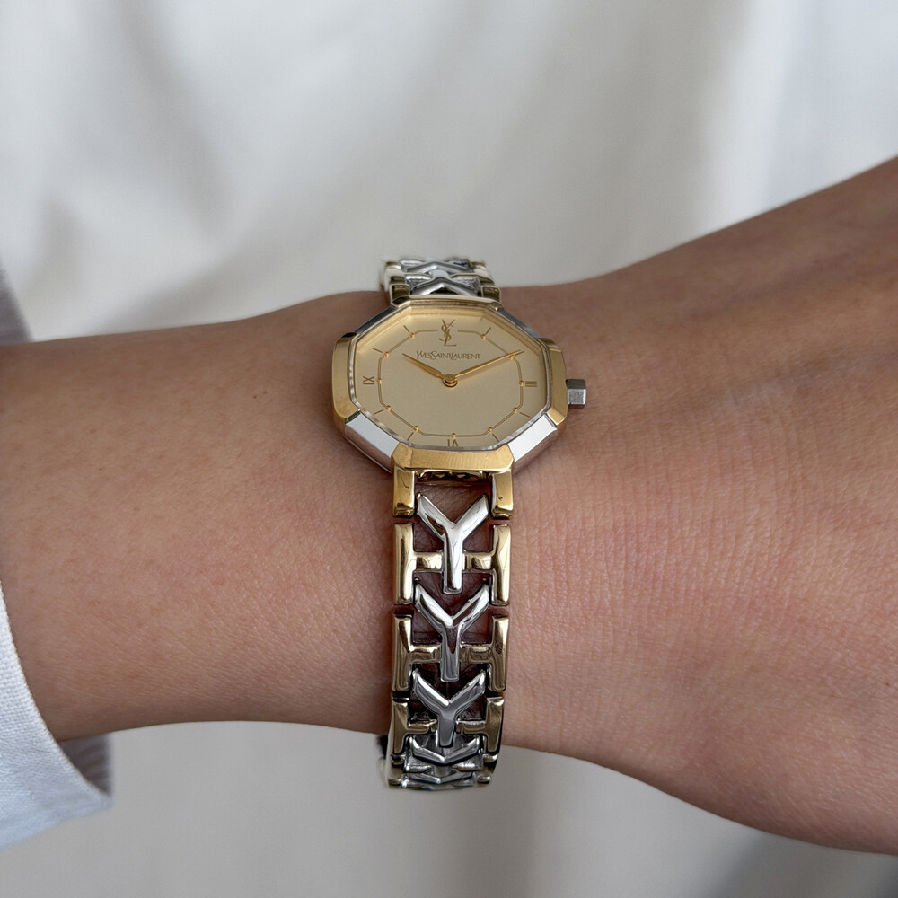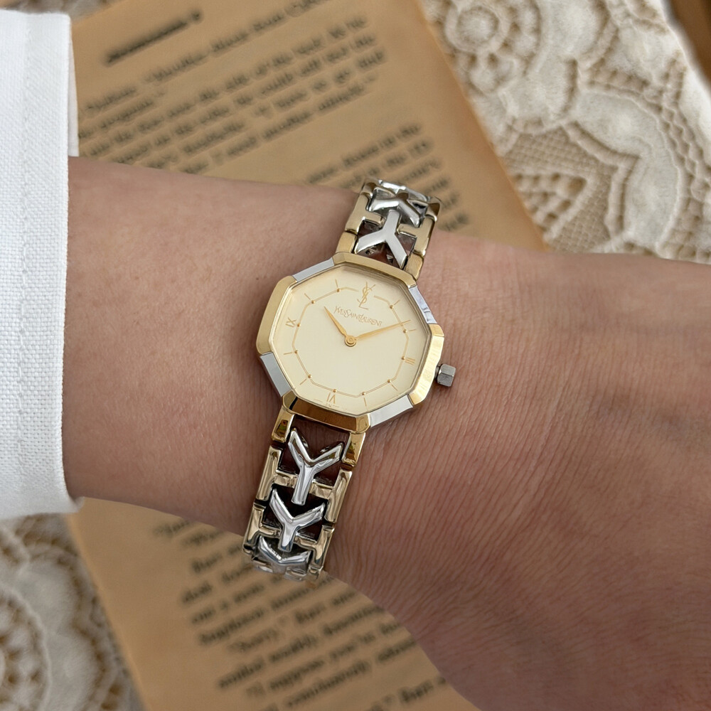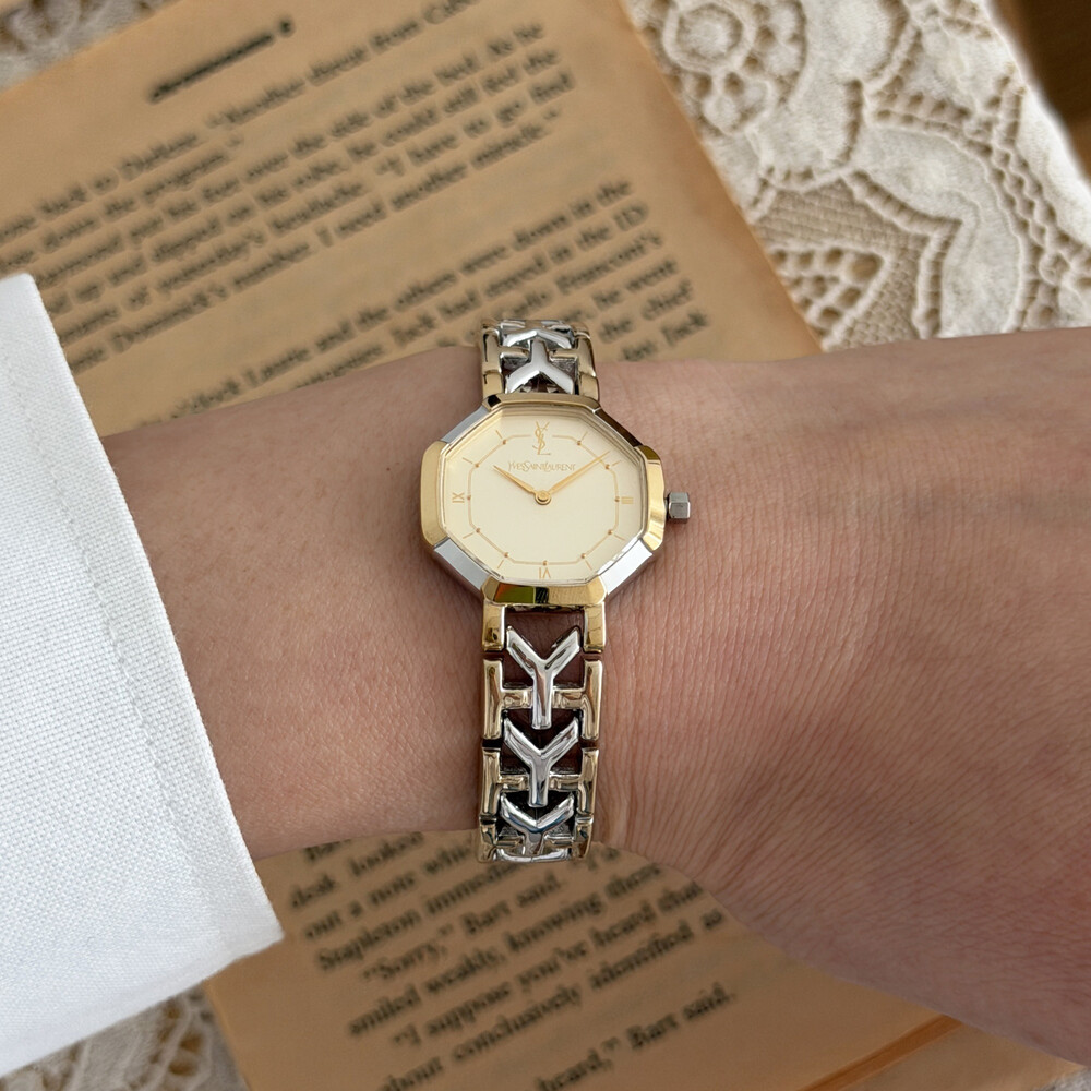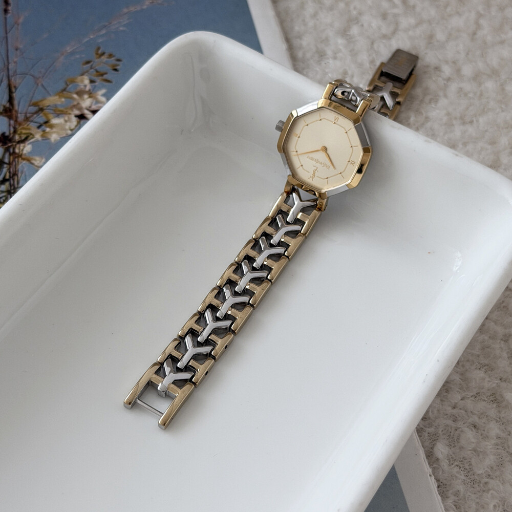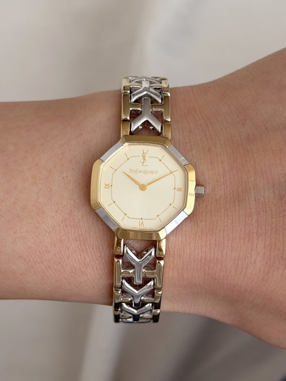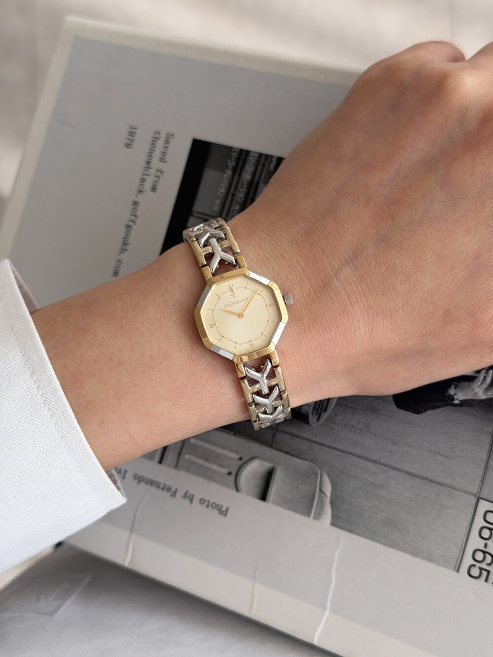 부드러운 골드&실버 투톤 컬러의 케이스와 샴페인톤 다이얼 위를 장식하는 생로랑 YSL 로고가