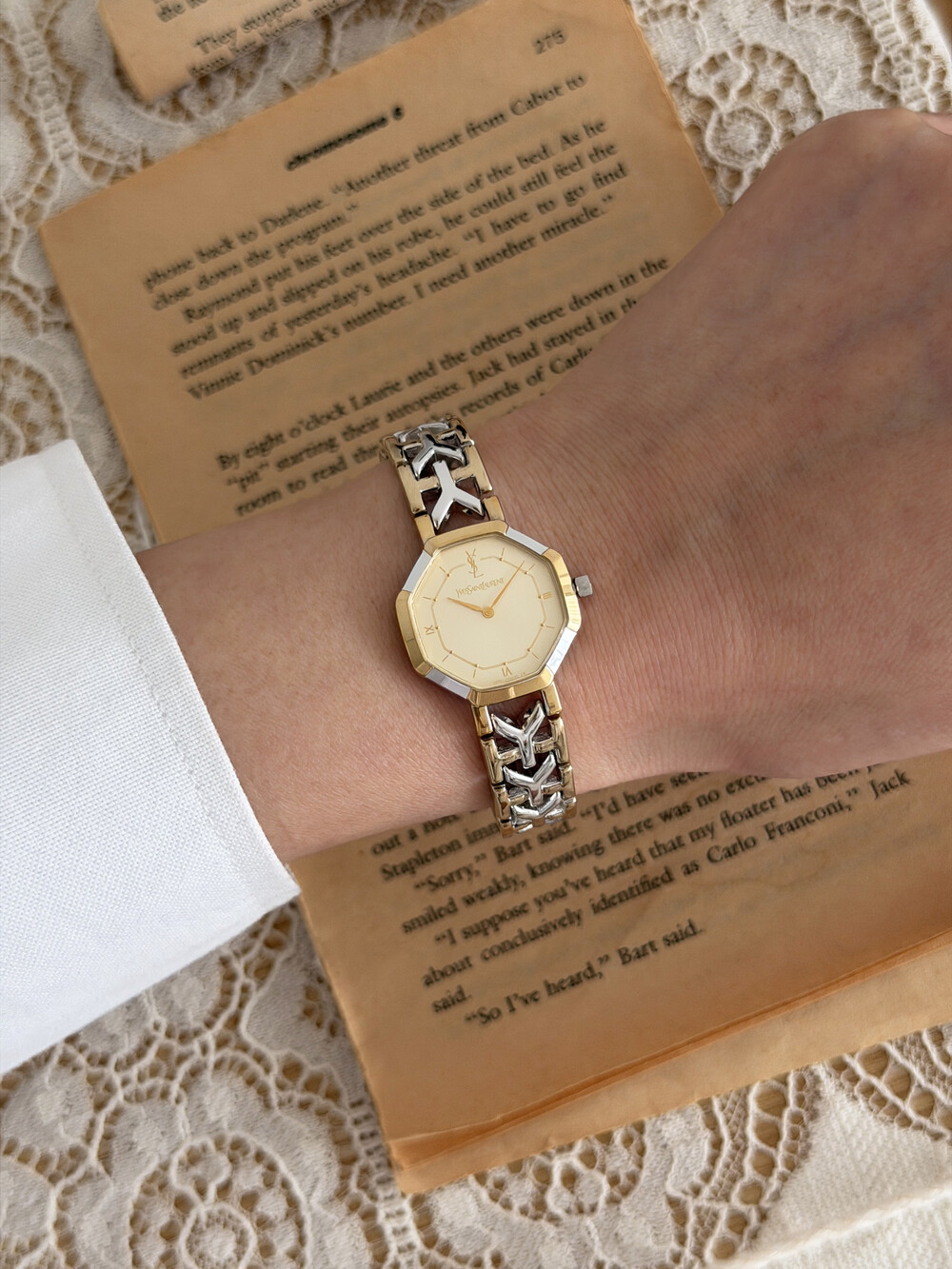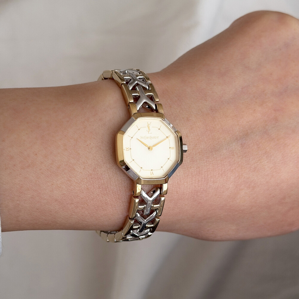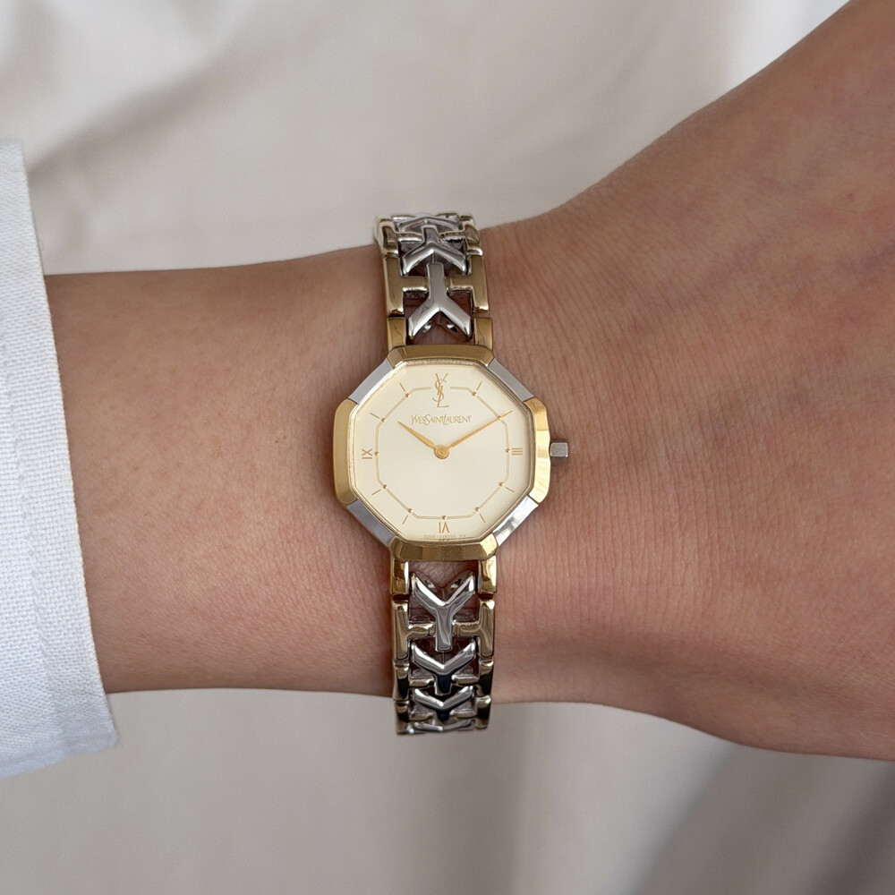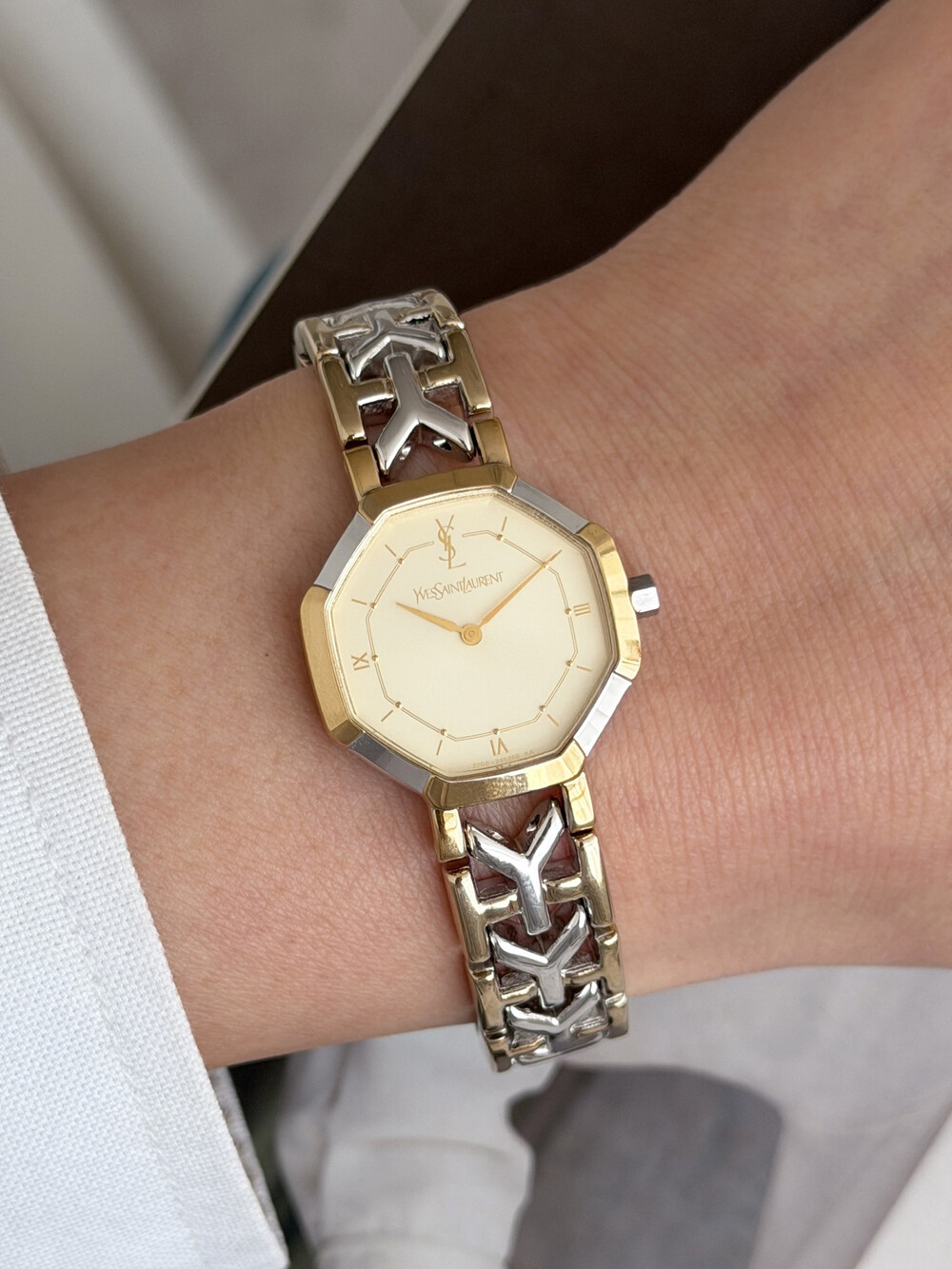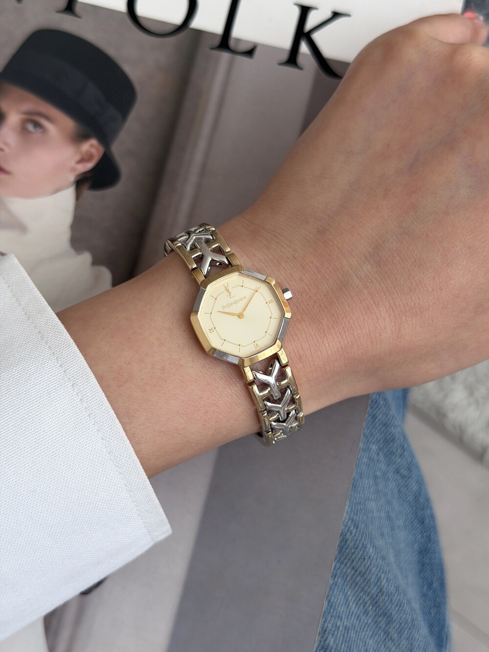 부드러운 골드&실버 투톤 컬러의 케이스와 샴페인톤 다이얼 위를 장식하는 생로랑 YSL 로고가