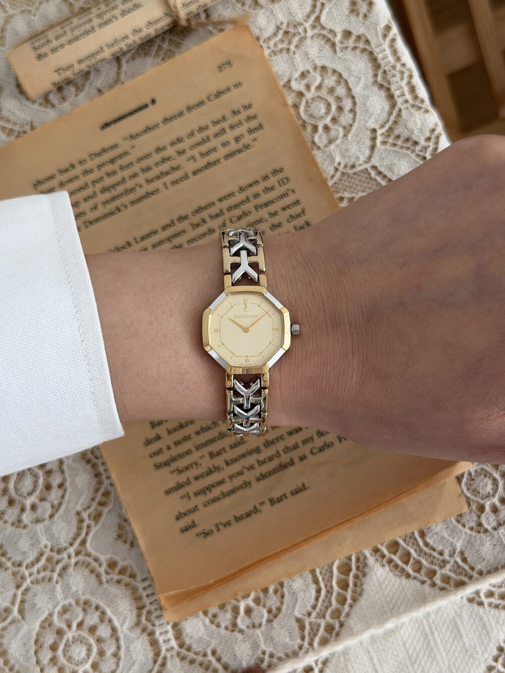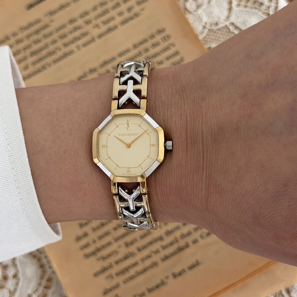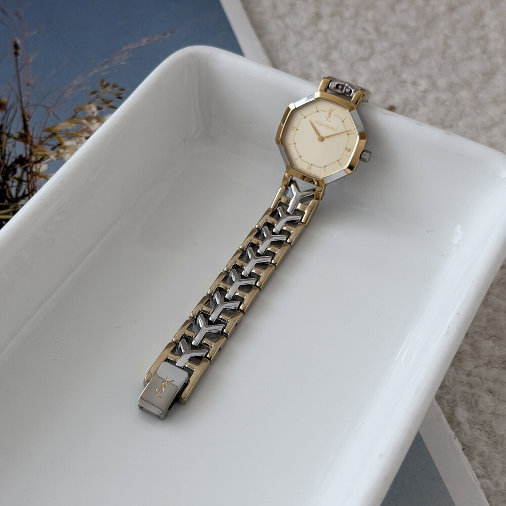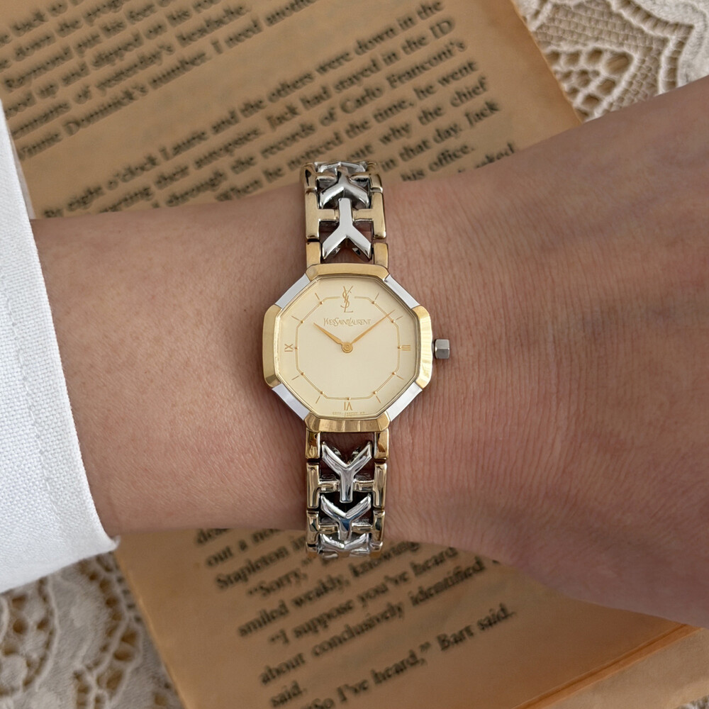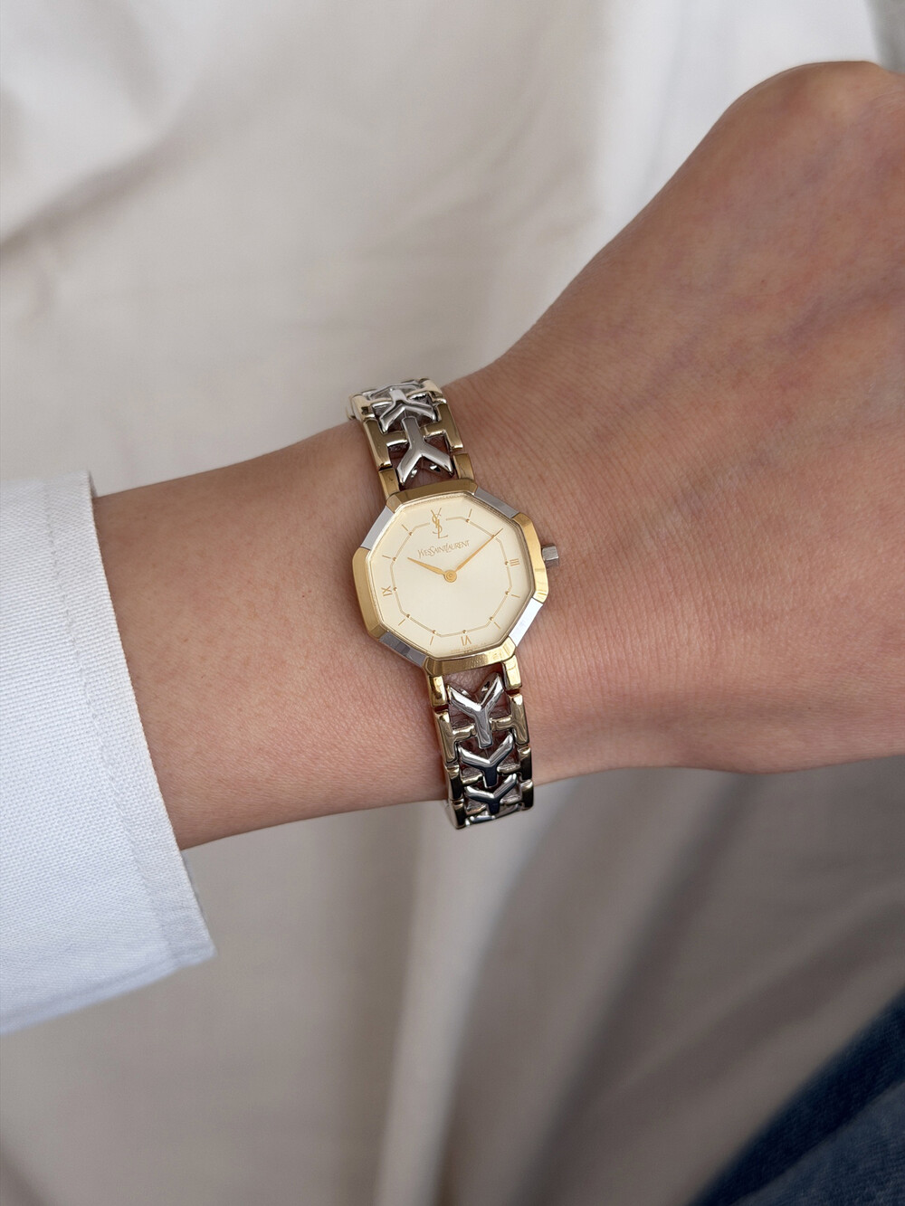 부드러운 골드&실버 투톤 컬러의 케이스와 샴페인톤 다이얼 위를 장식하는 생로랑 YSL 로고가