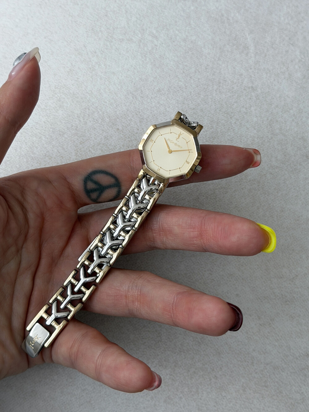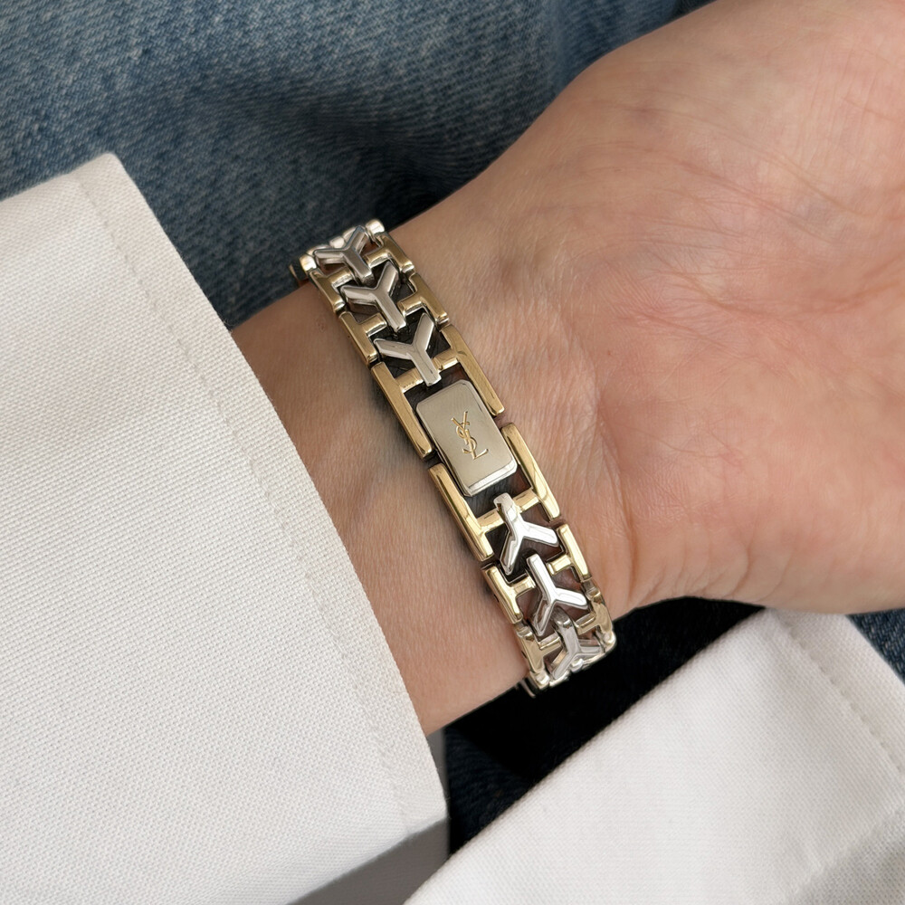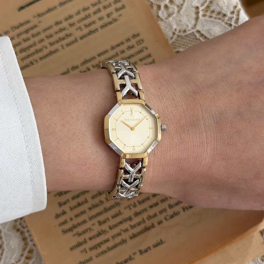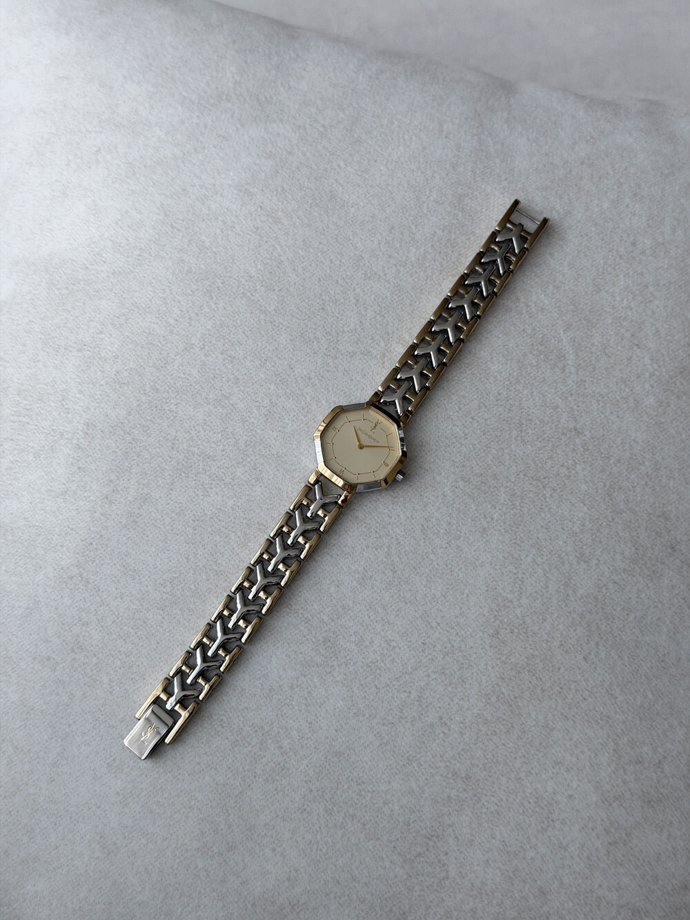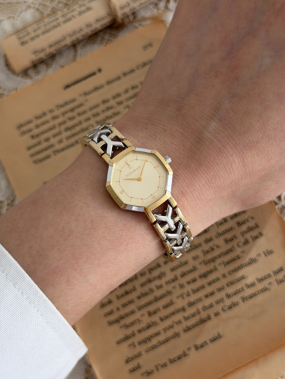 부드러운 골드&실버 투톤 컬러의 케이스와 샴페인톤 다이얼 위를 장식하는 생로랑 YSL 로고가