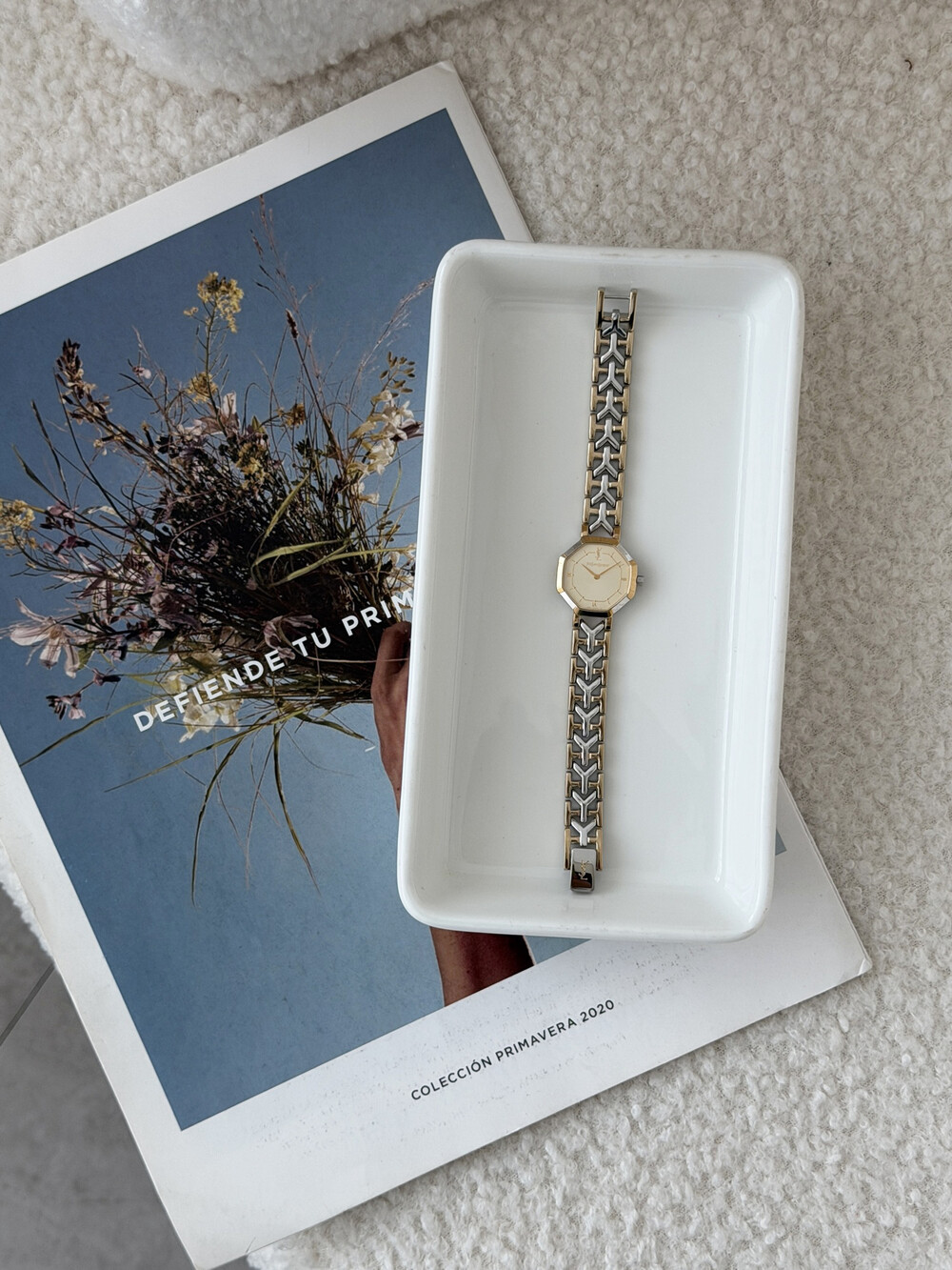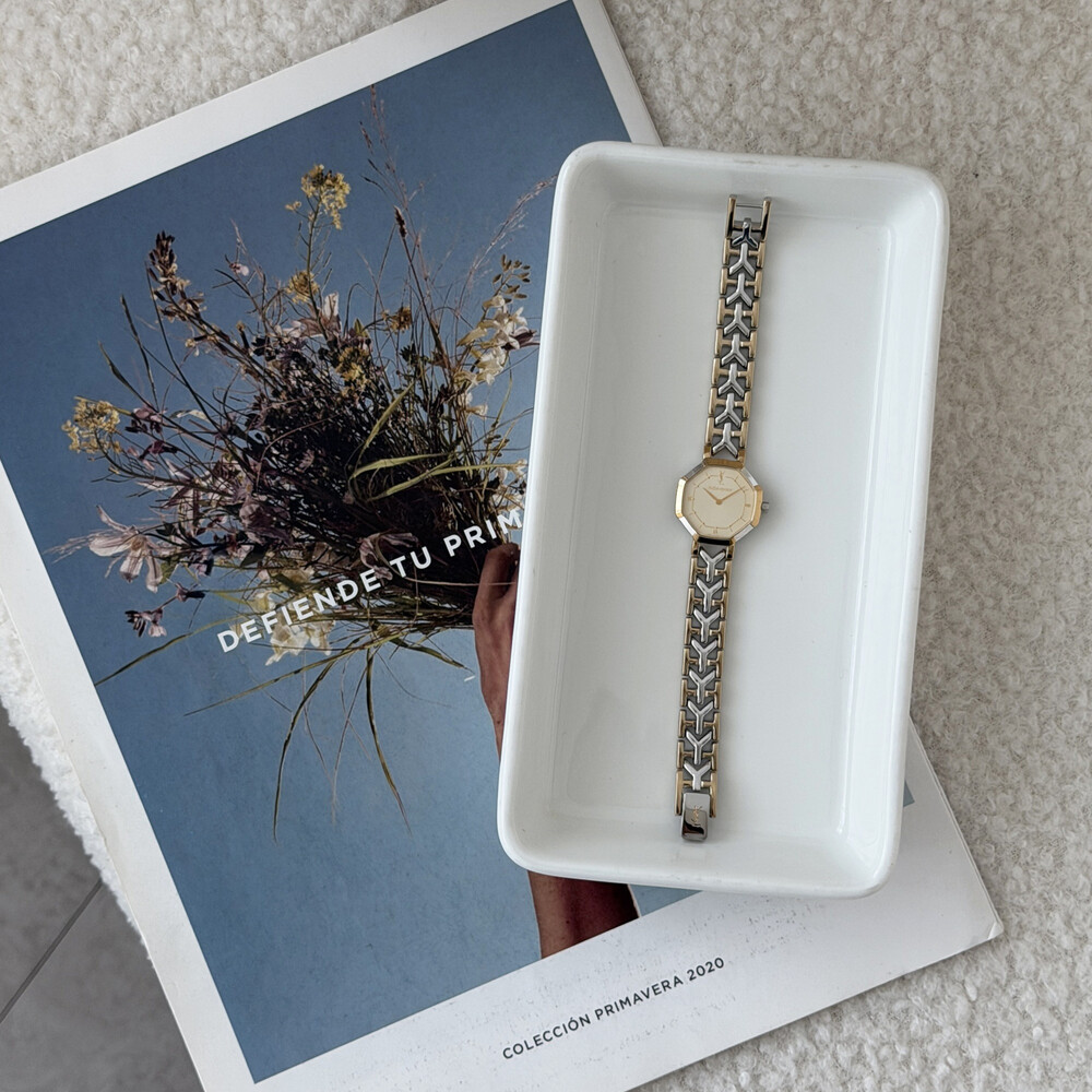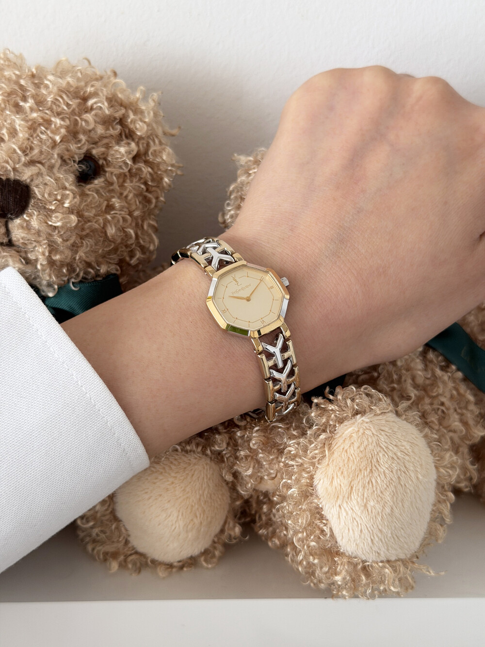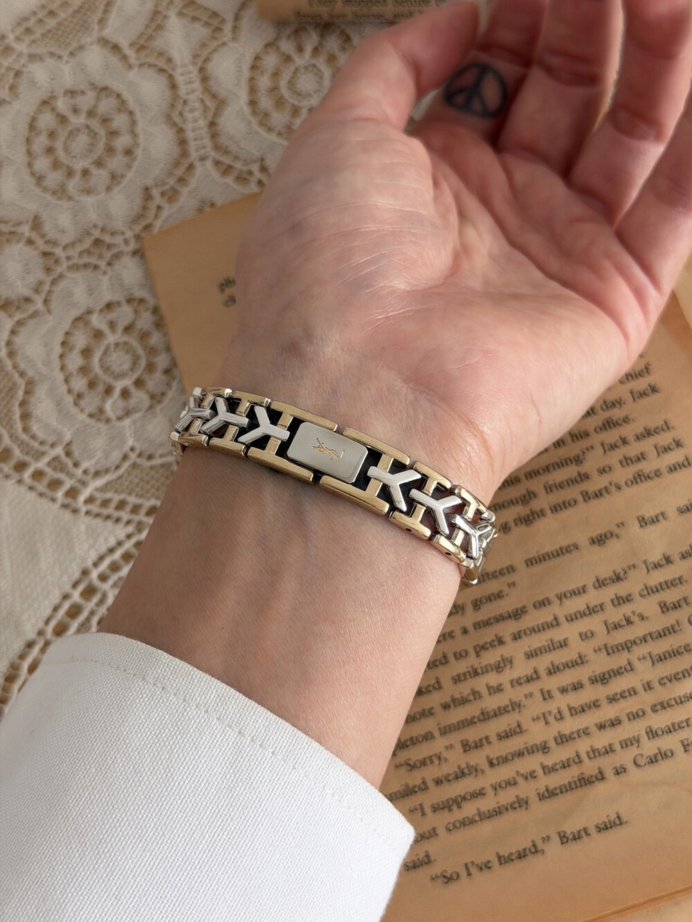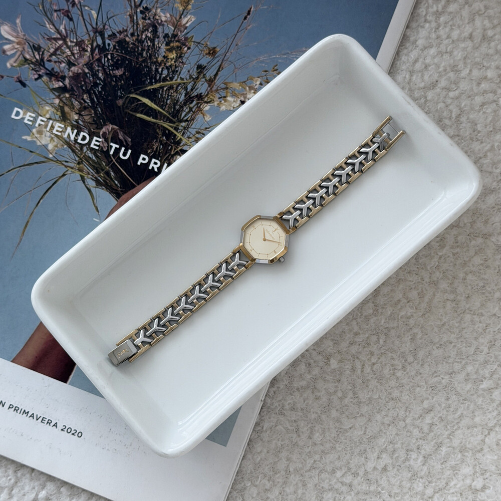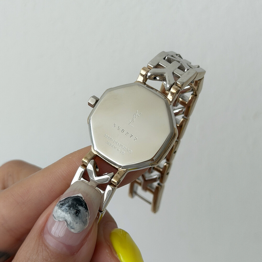 부드러운 골드&실버 투톤 컬러의 케이스와 샴페인톤 다이얼 위를 장식하는 생로랑 YSL 로고가