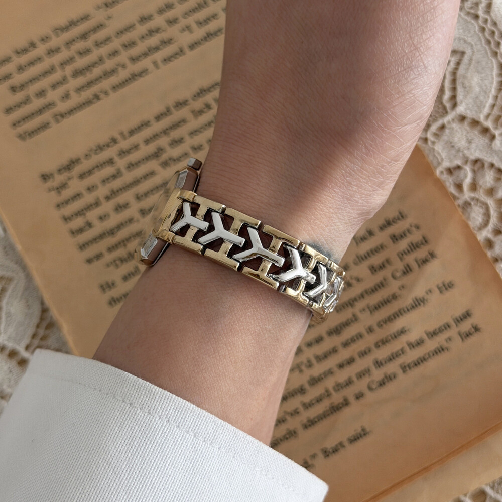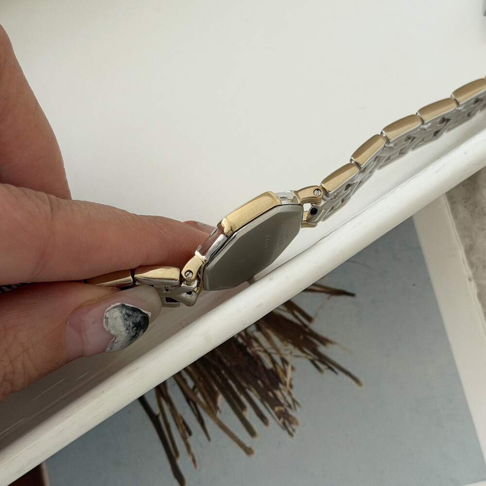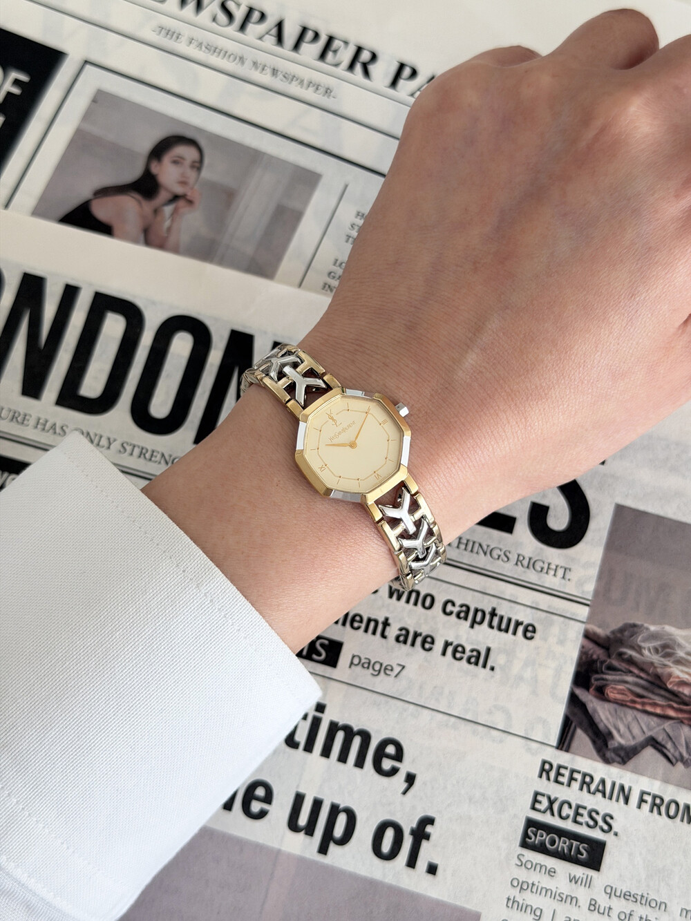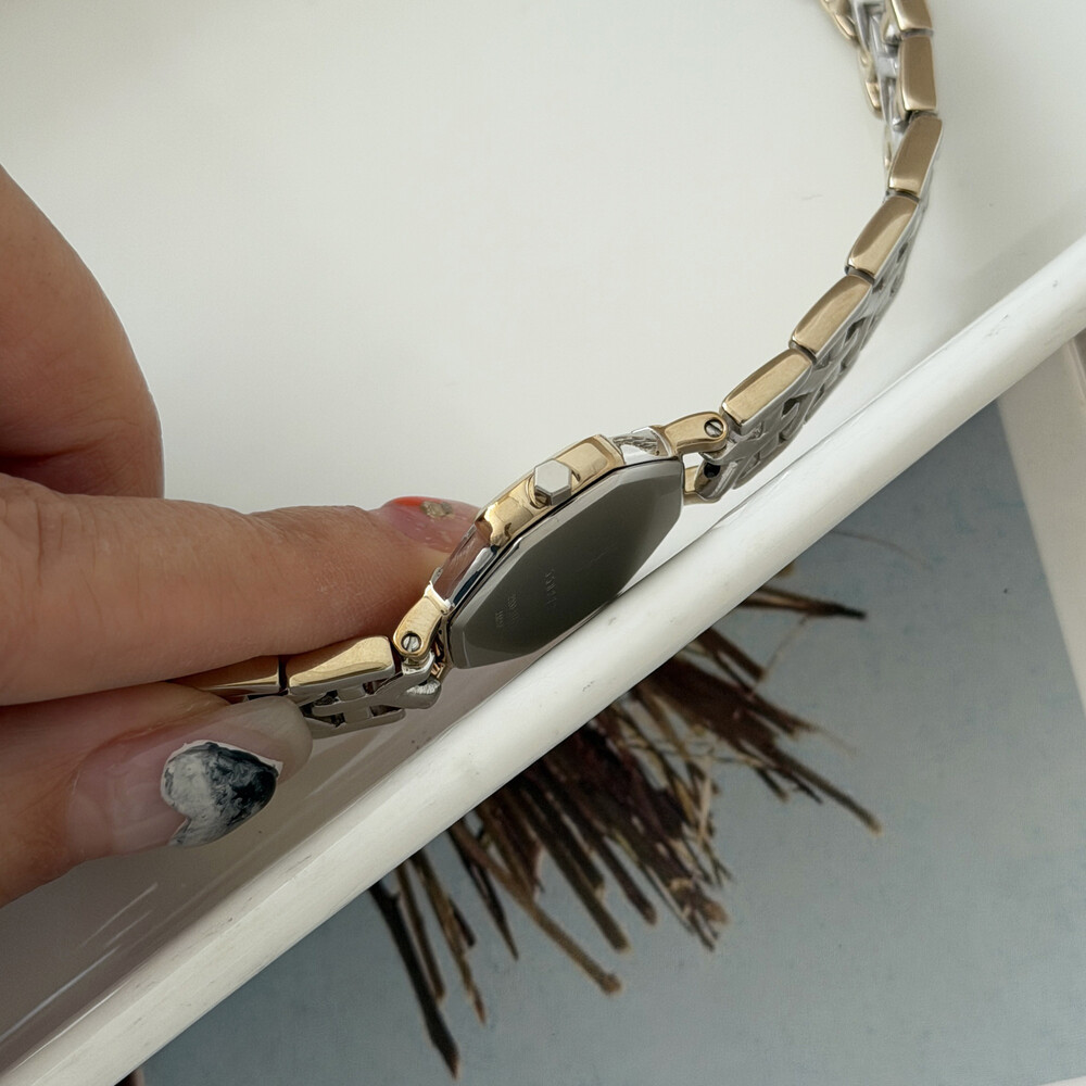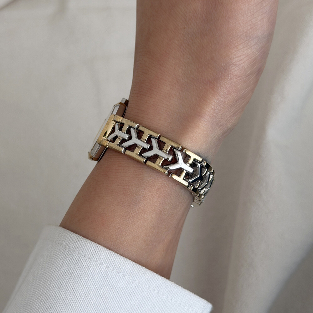 부드러운 골드&실버 투톤 컬러의 케이스와 샴페인톤 다이얼 위를 장식하는 생로랑 YSL 로고가