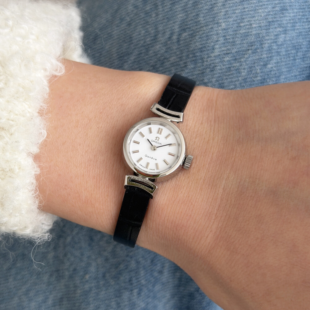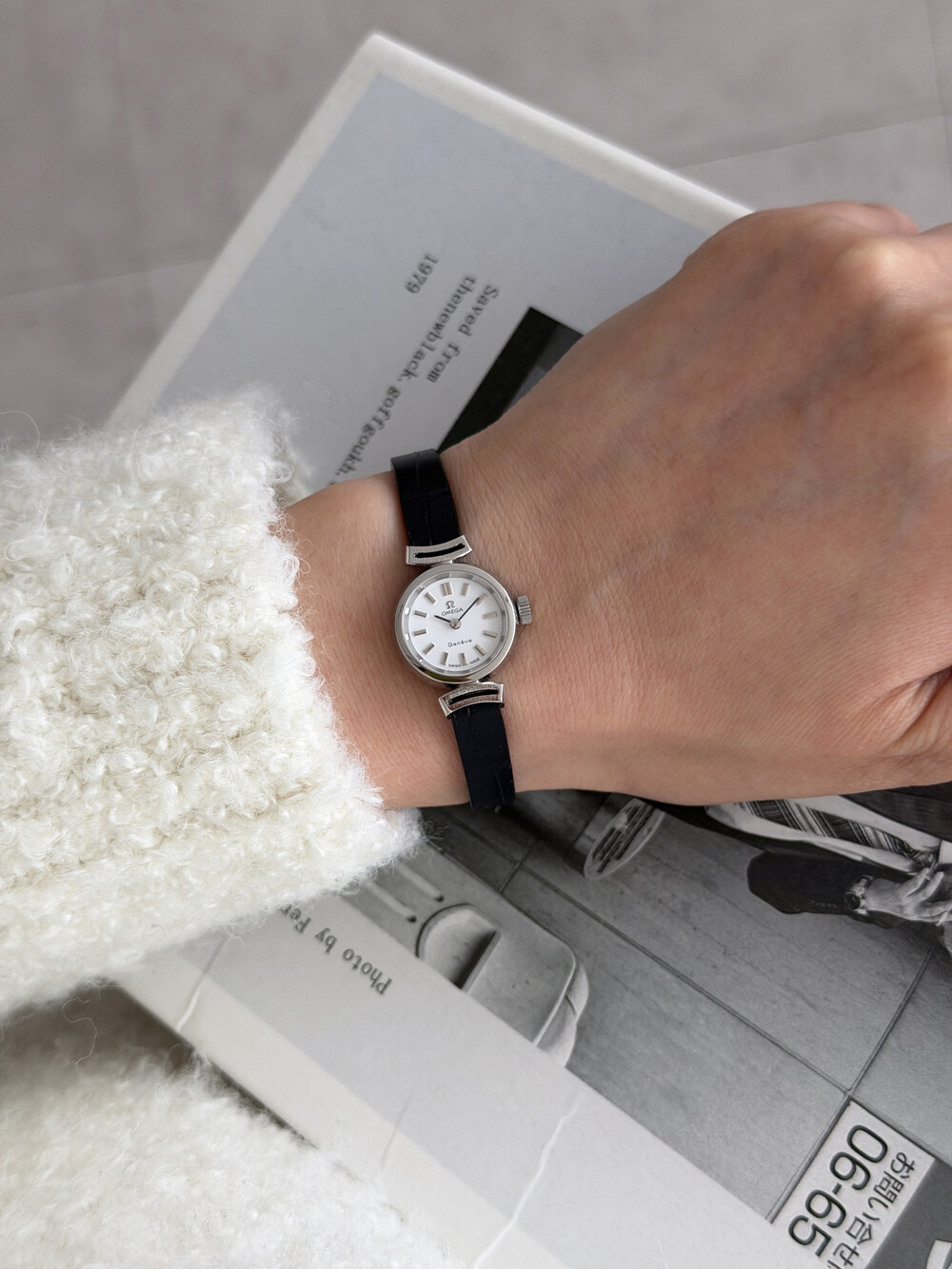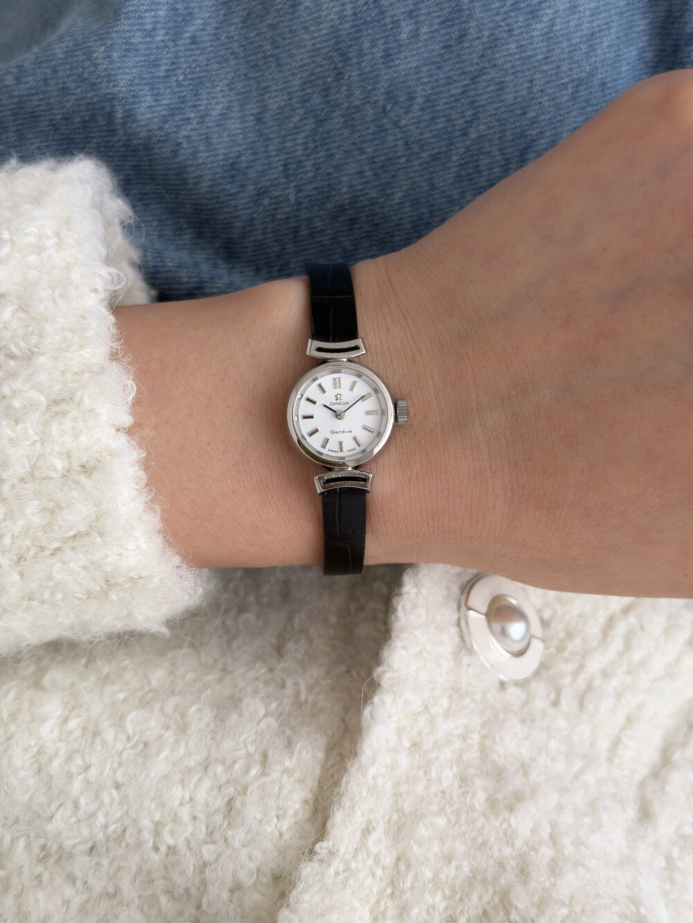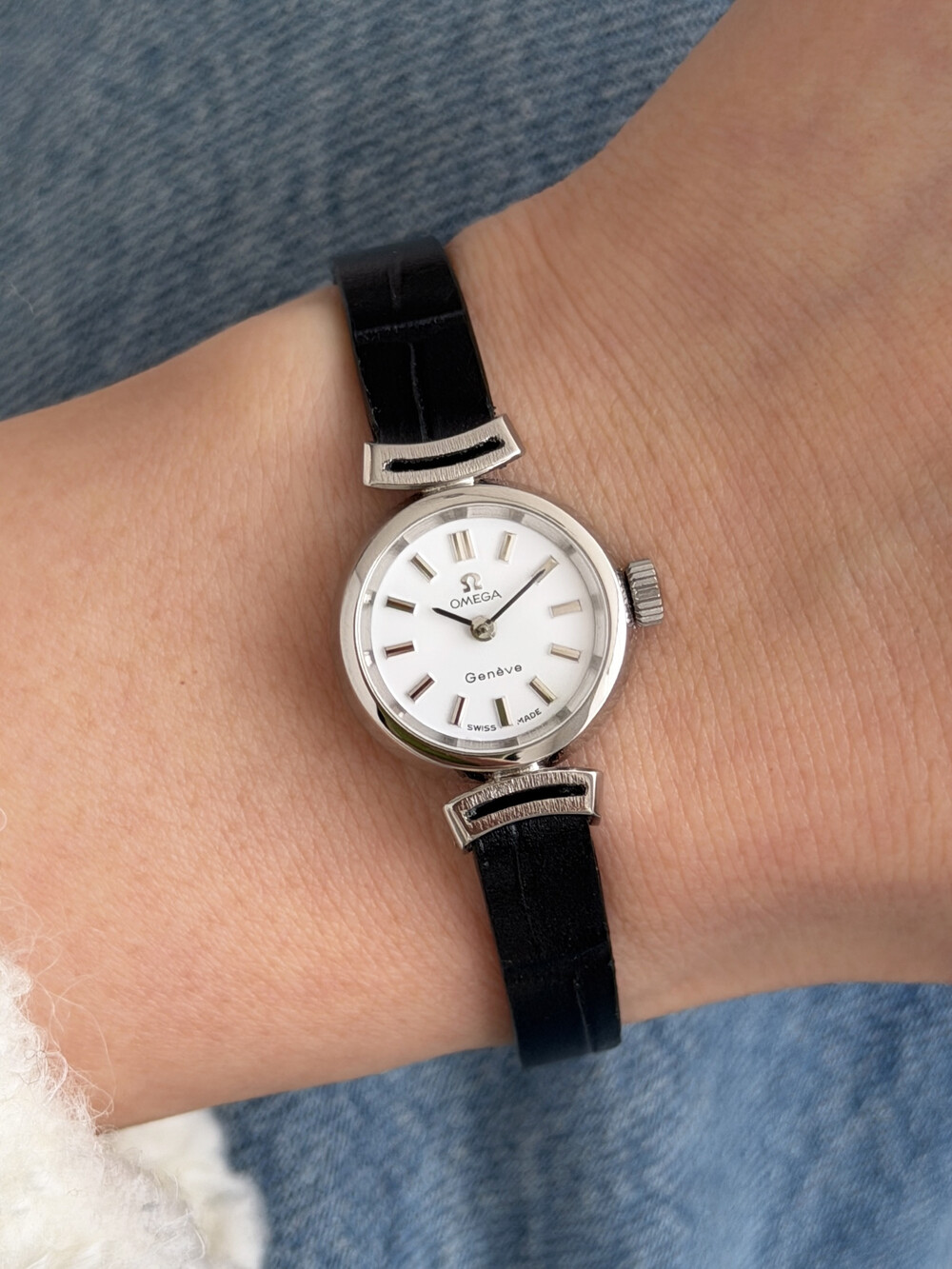 1969년도에 제작된 오메가 제네브 모델로 깔끔한 화이트 다이얼 위를 장식하는
