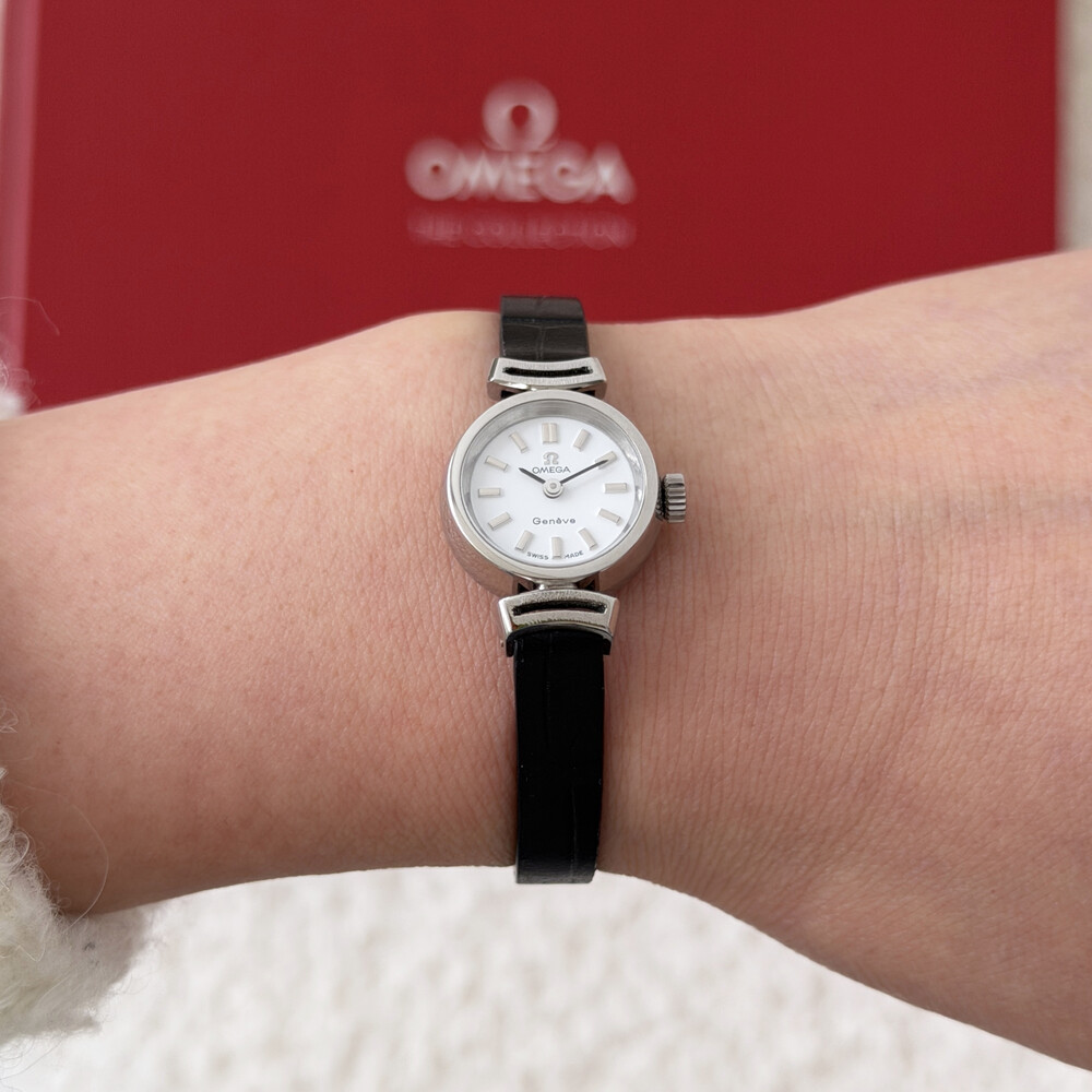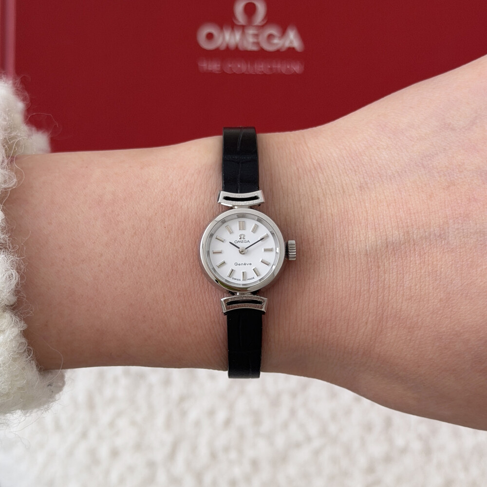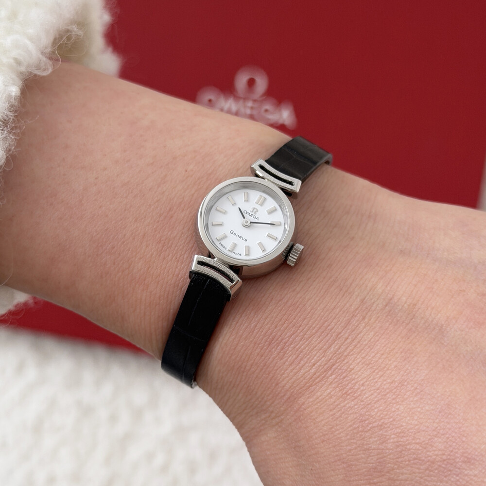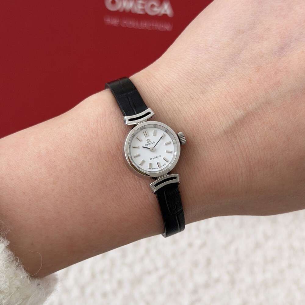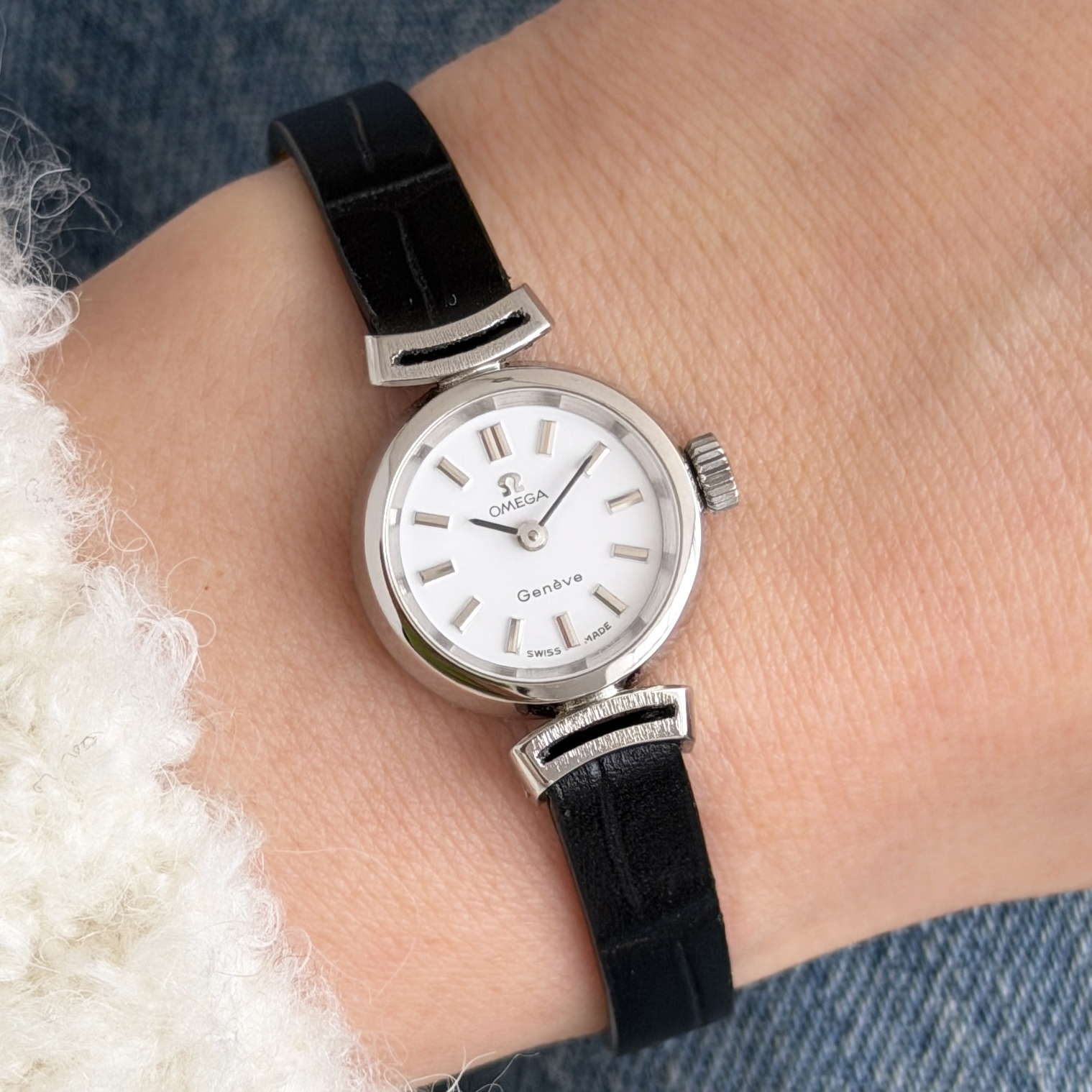 1969년도에 제작된 오메가 제네브 모델로 깔끔한 화이트 다이얼 위를 장식하는