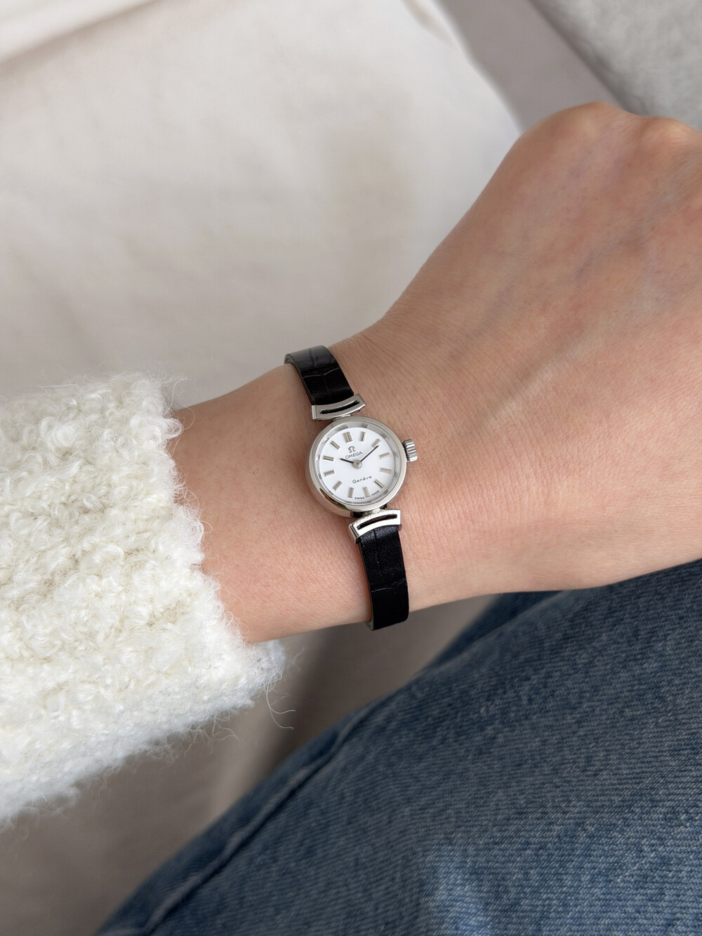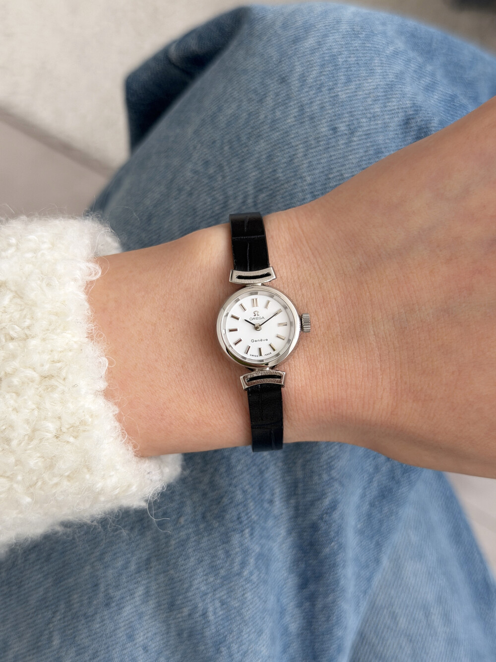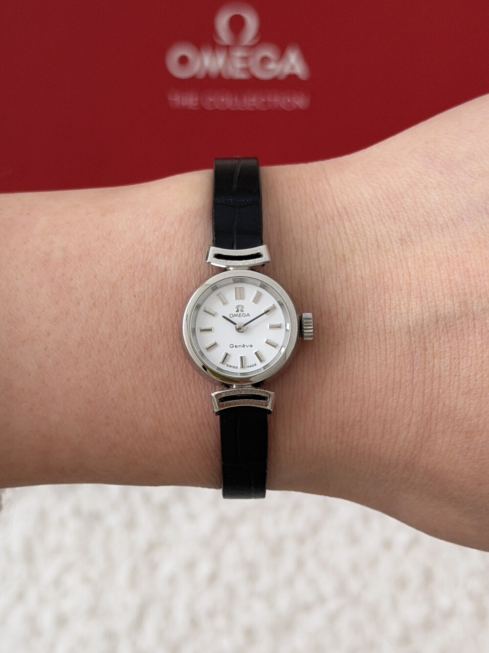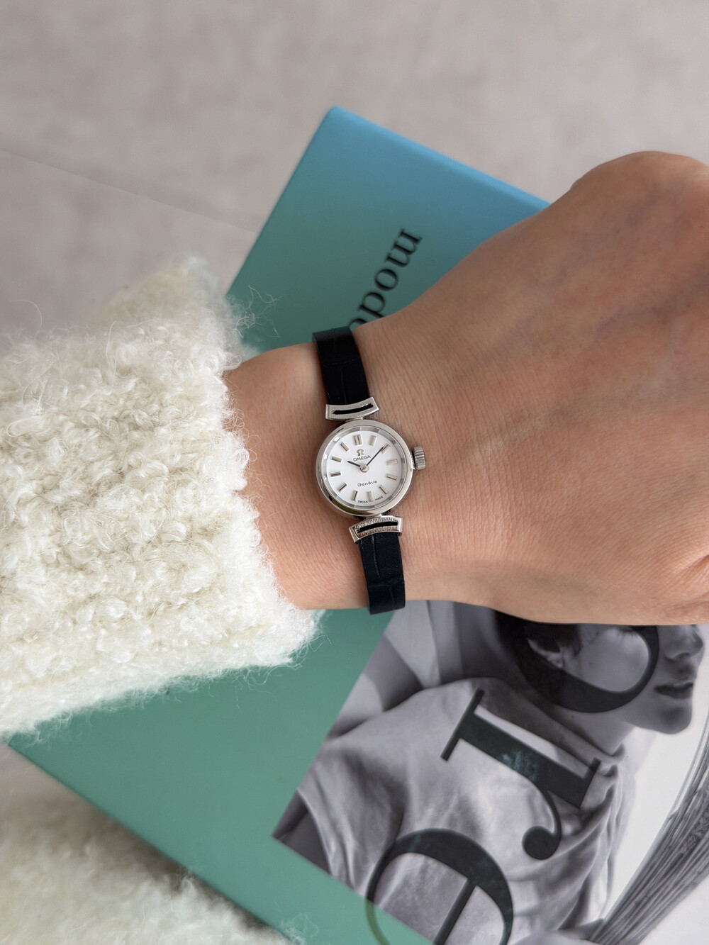 1969년도에 제작된 오메가 제네브 모델로 깔끔한 화이트 다이얼 위를 장식하는