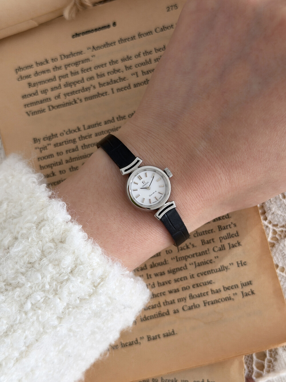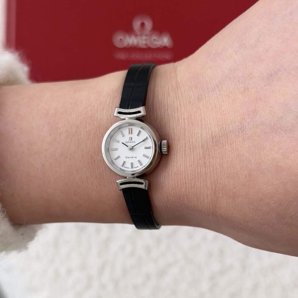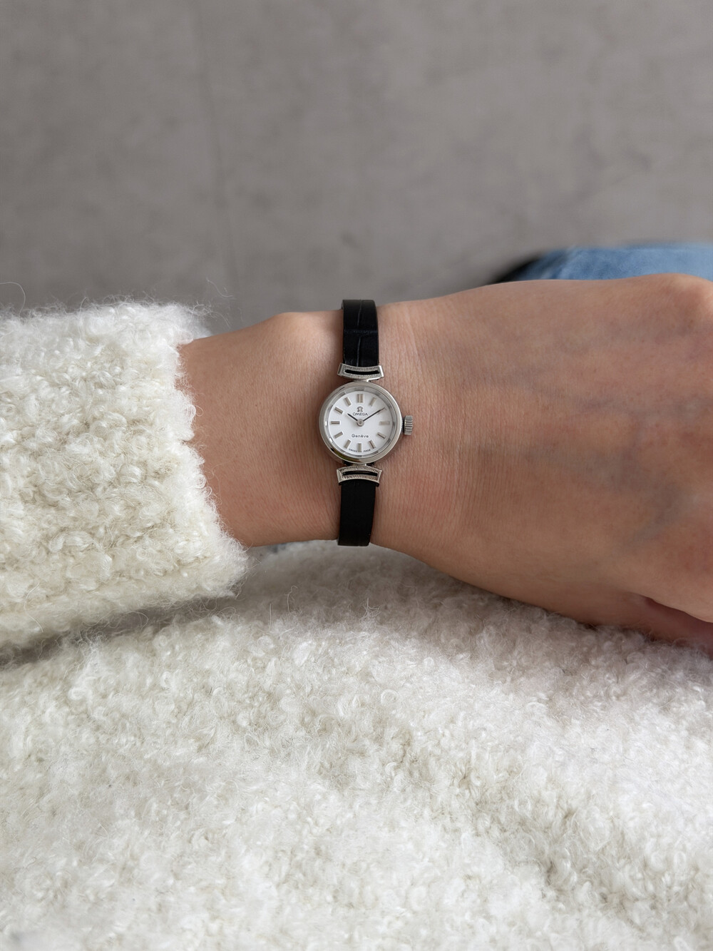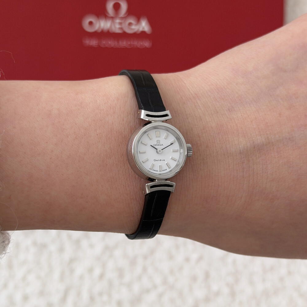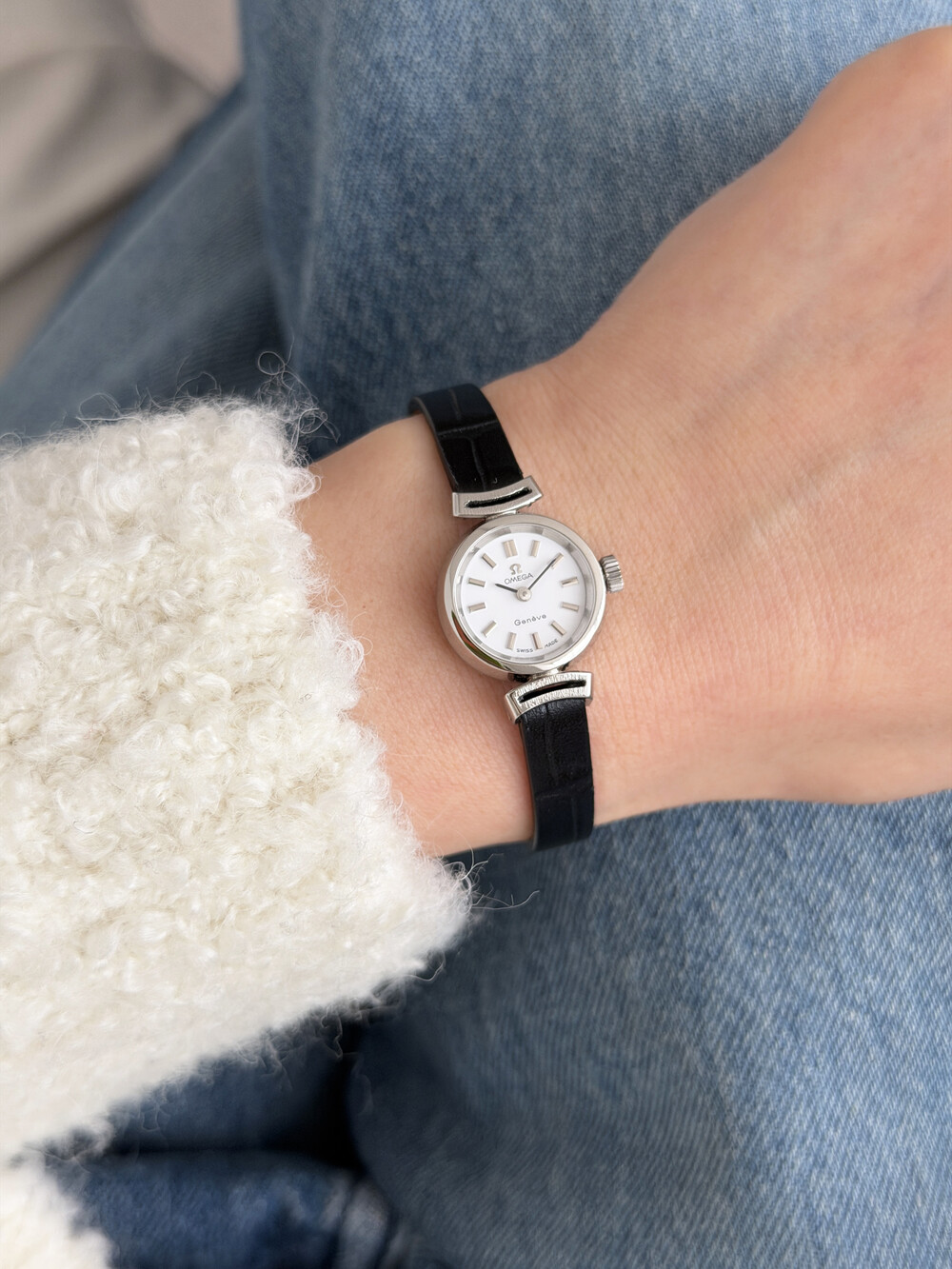 1969년도에 제작된 오메가 제네브 모델로 깔끔한 화이트 다이얼 위를 장식하는