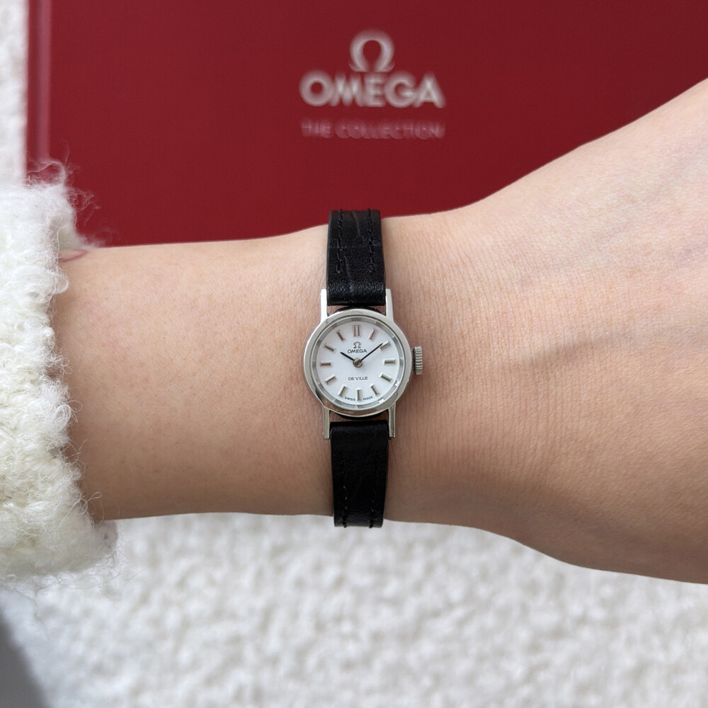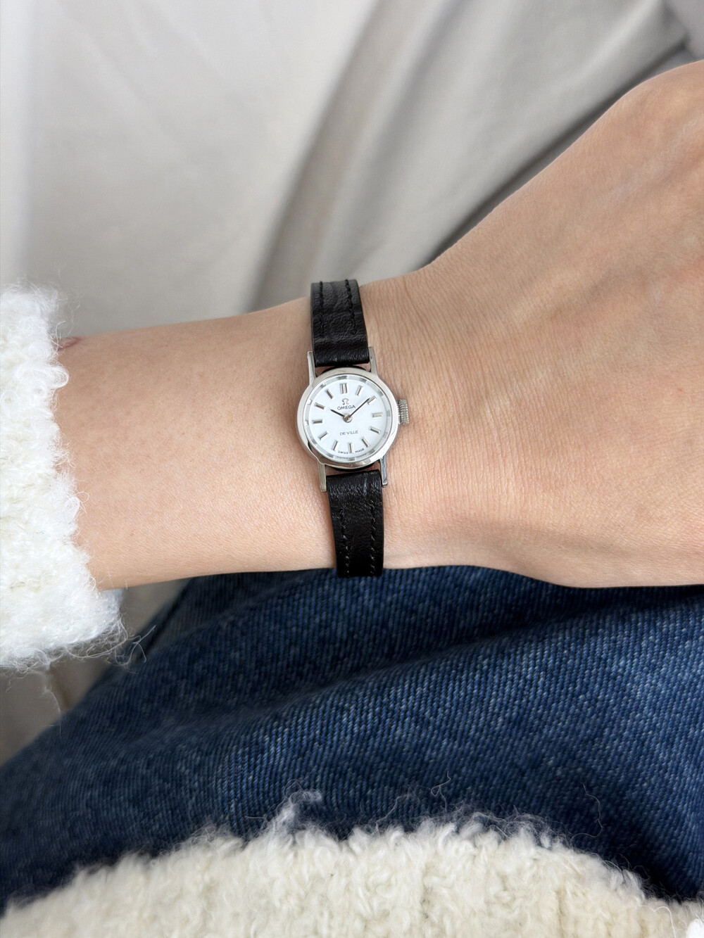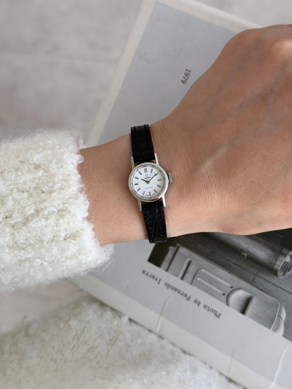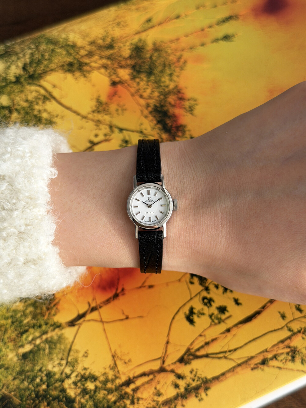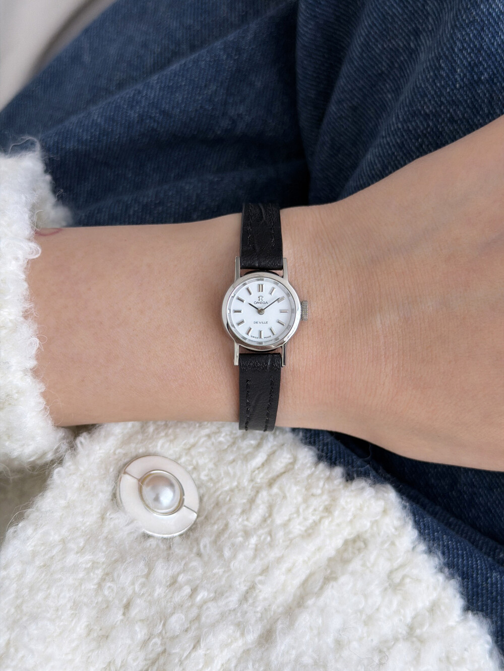 1969년도에 제작된 오메가 드빌 모델로 깔끔한 화이트 다이얼 위를 장식하는