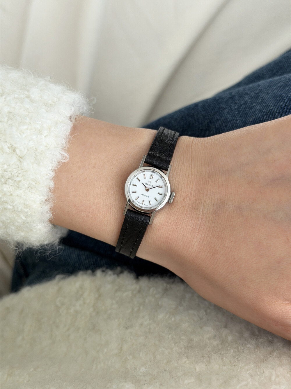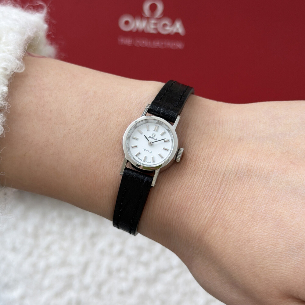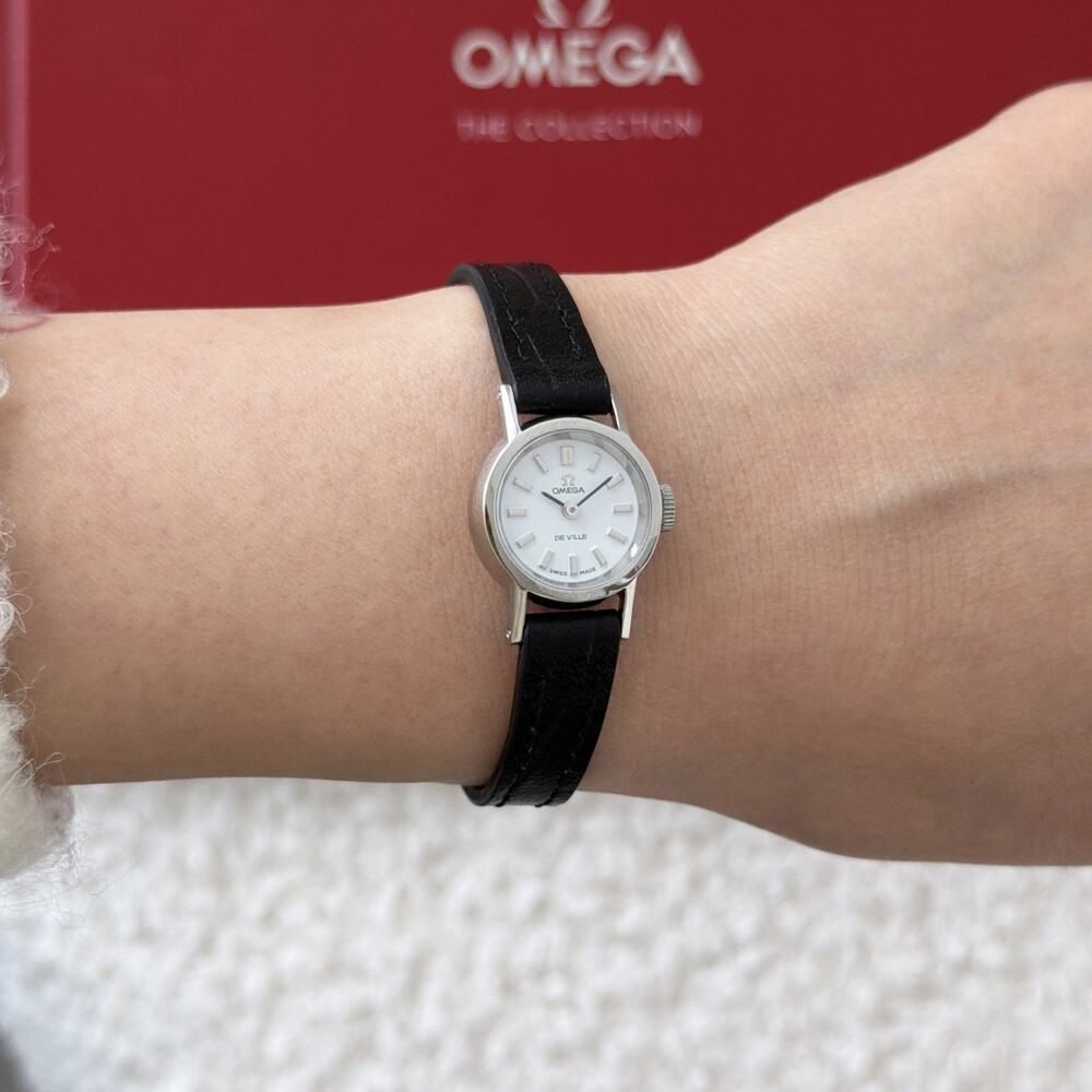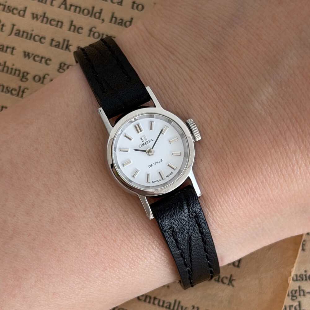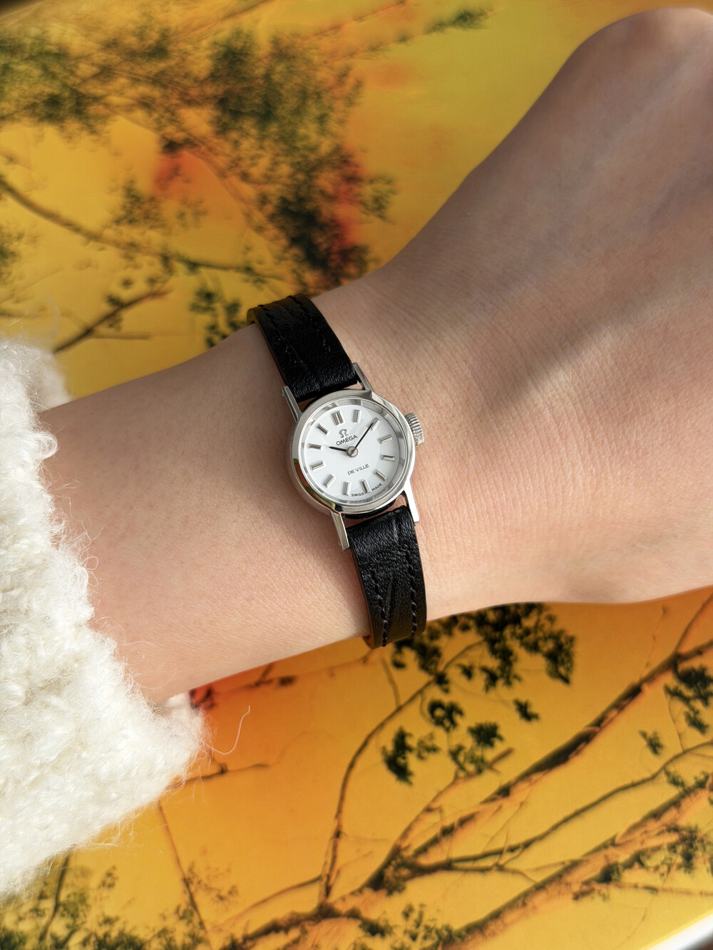 1969년도에 제작된 오메가 드빌 모델로 깔끔한 화이트 다이얼 위를 장식하는