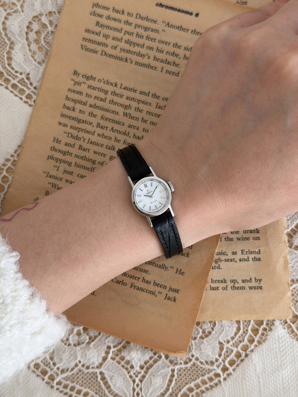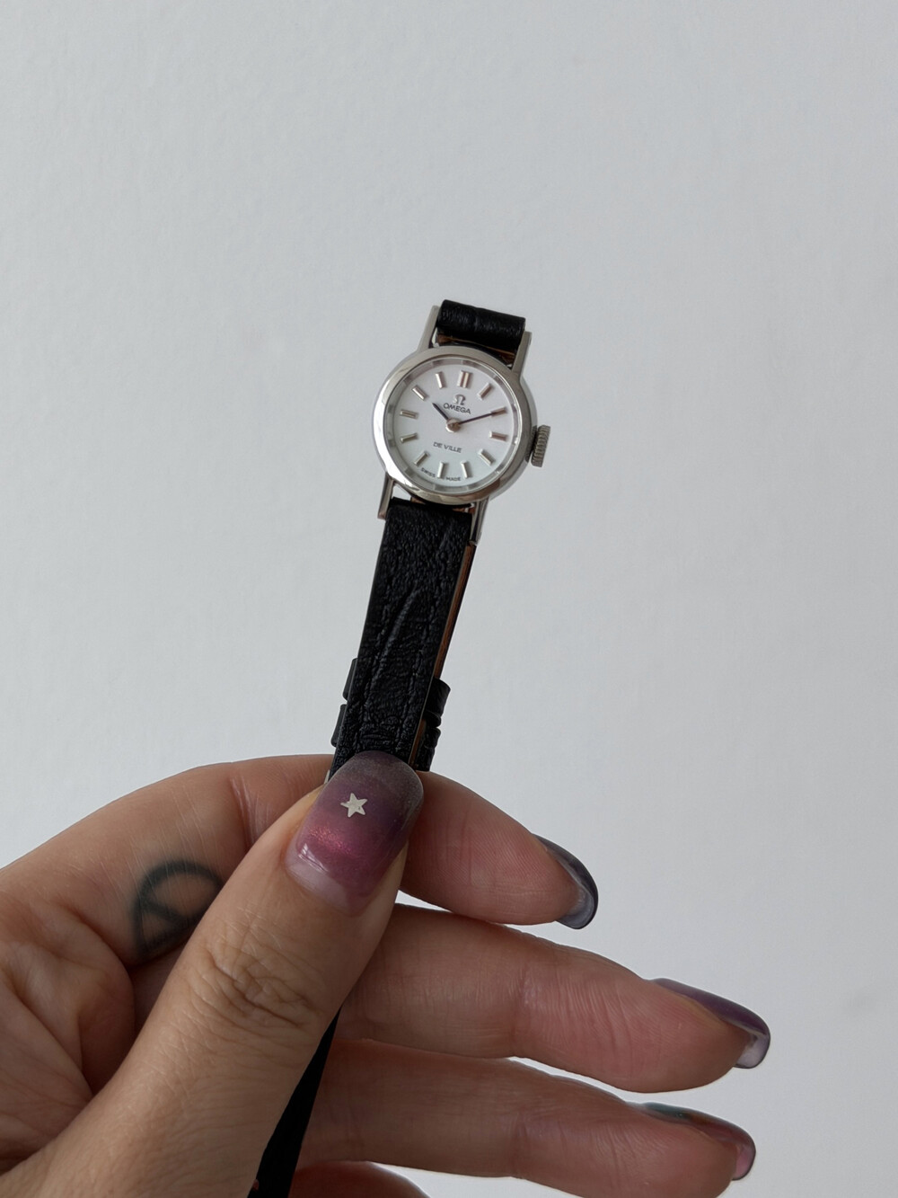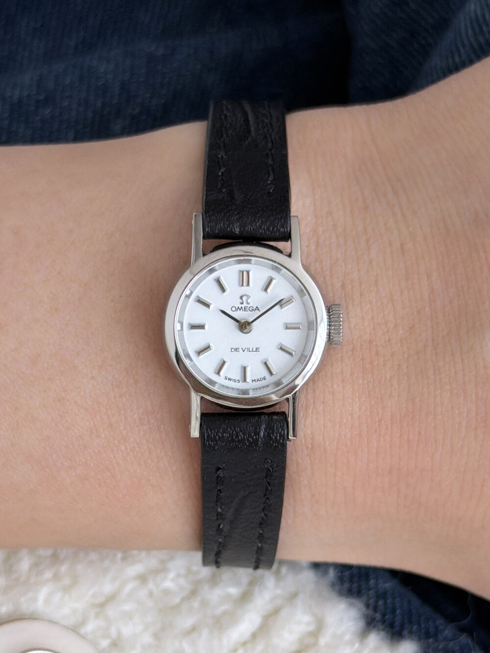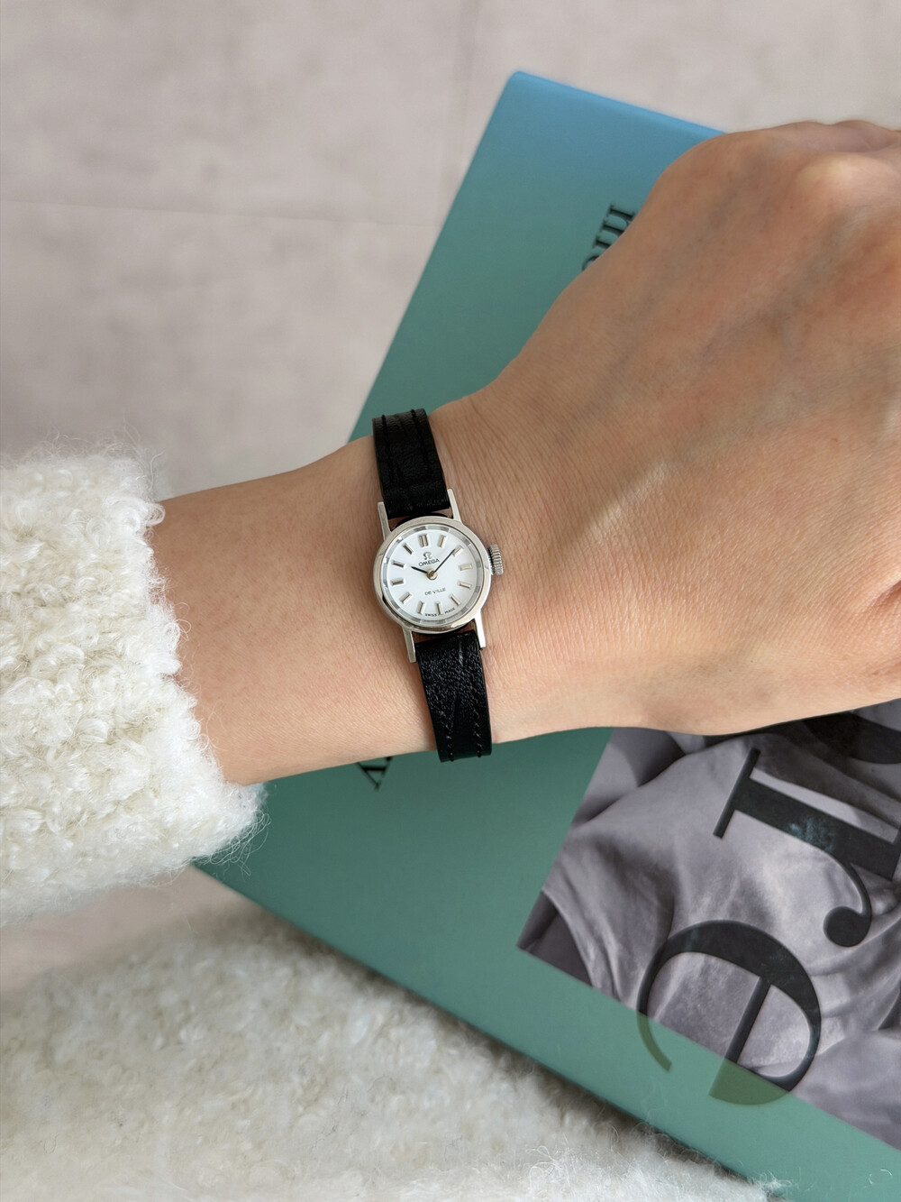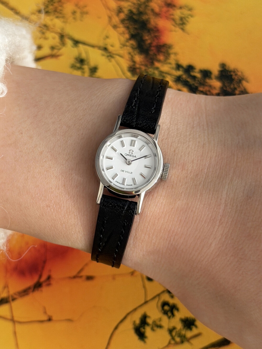 1969년도에 제작된 오메가 드빌 모델로 깔끔한 화이트 다이얼 위를 장식하는