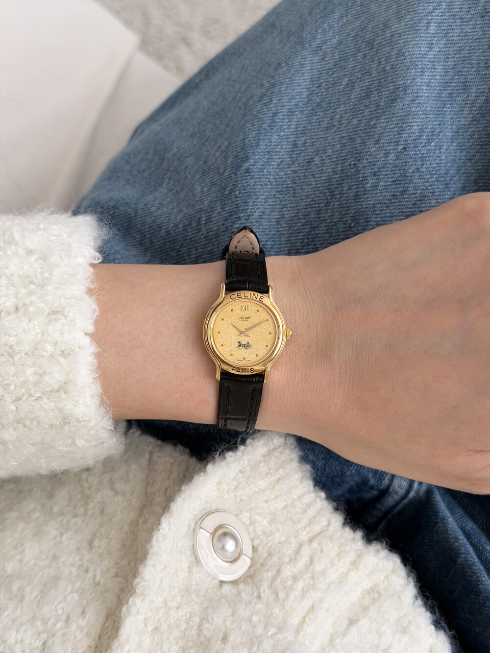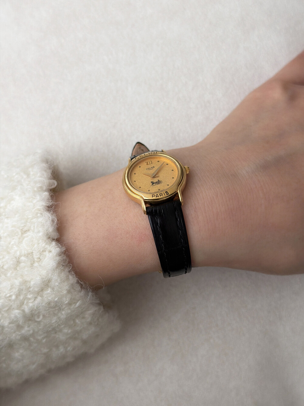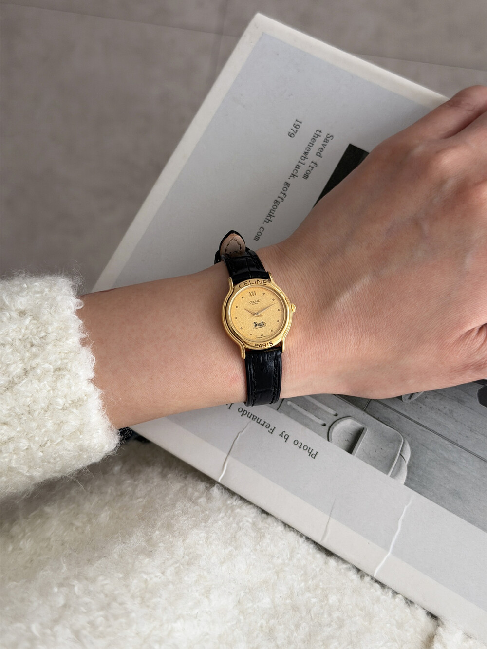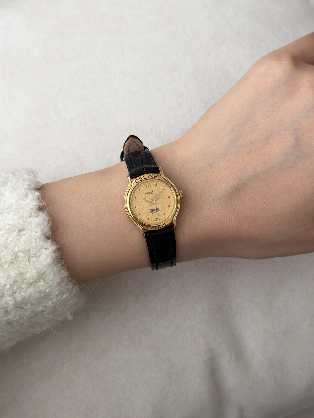 부드러운 골드 톤 케이스와 다이얼 위를 장식하는 셀린느 시그니처 마차 심볼이 매력적인 모델입니다.