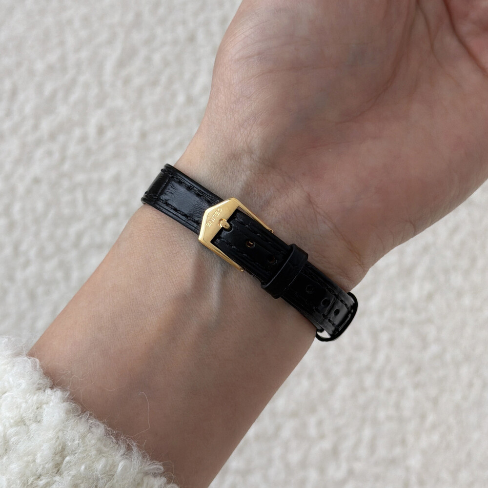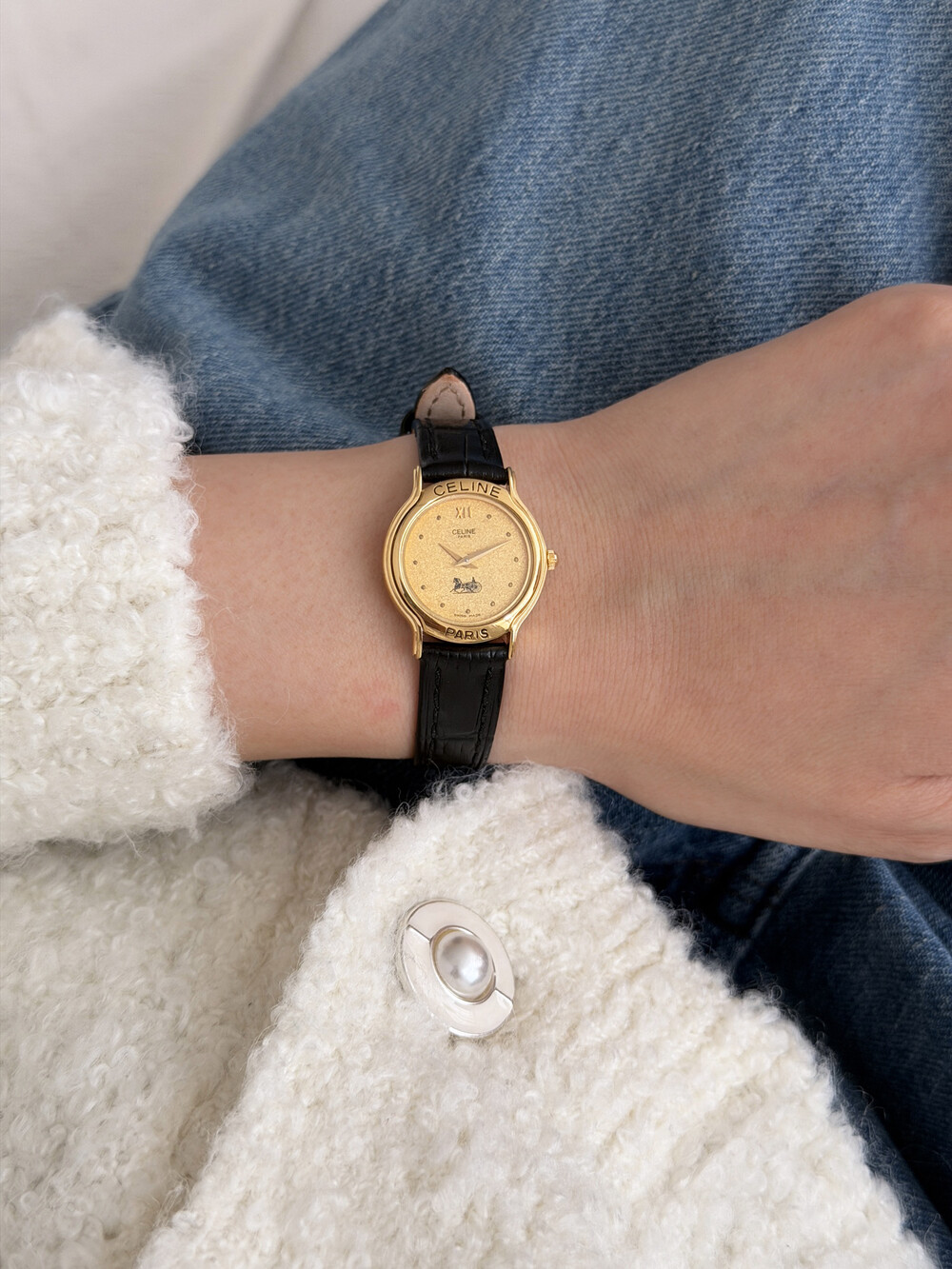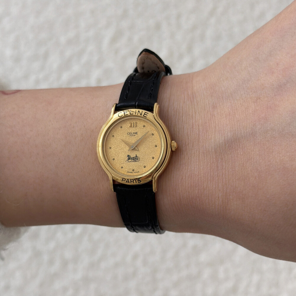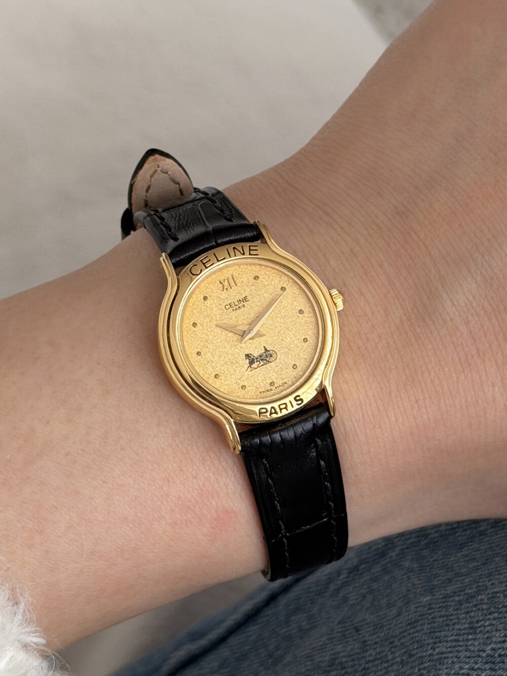부드러운 골드 톤 케이스와 다이얼 위를 장식하는 셀린느 시그니처 마차 심볼이 매력적인 모델입니다.
