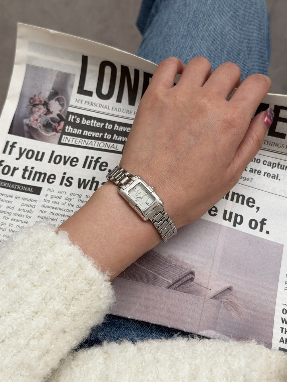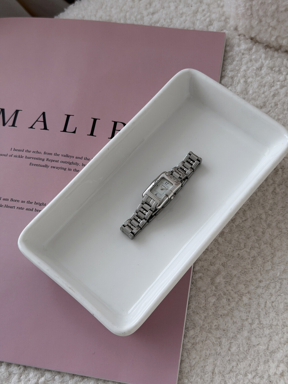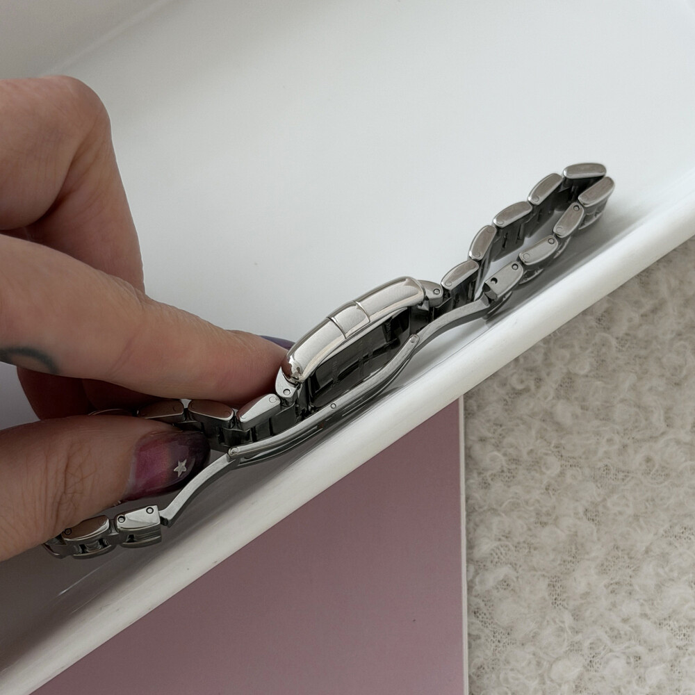 부드러운 곡선의 스퀘어 바디와 화이트 다이얼 위를 장식하는