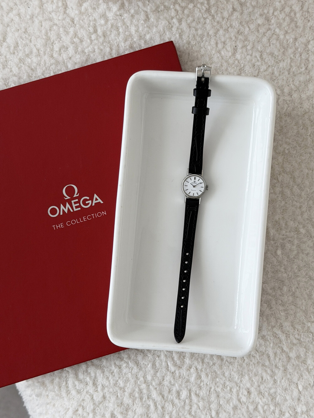 화이트 다이얼 위를 장식하는 오메가 심볼이 매력적인 모델입니다.