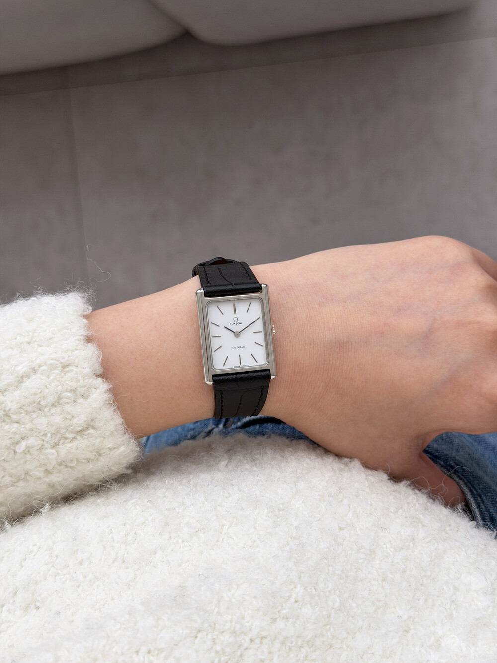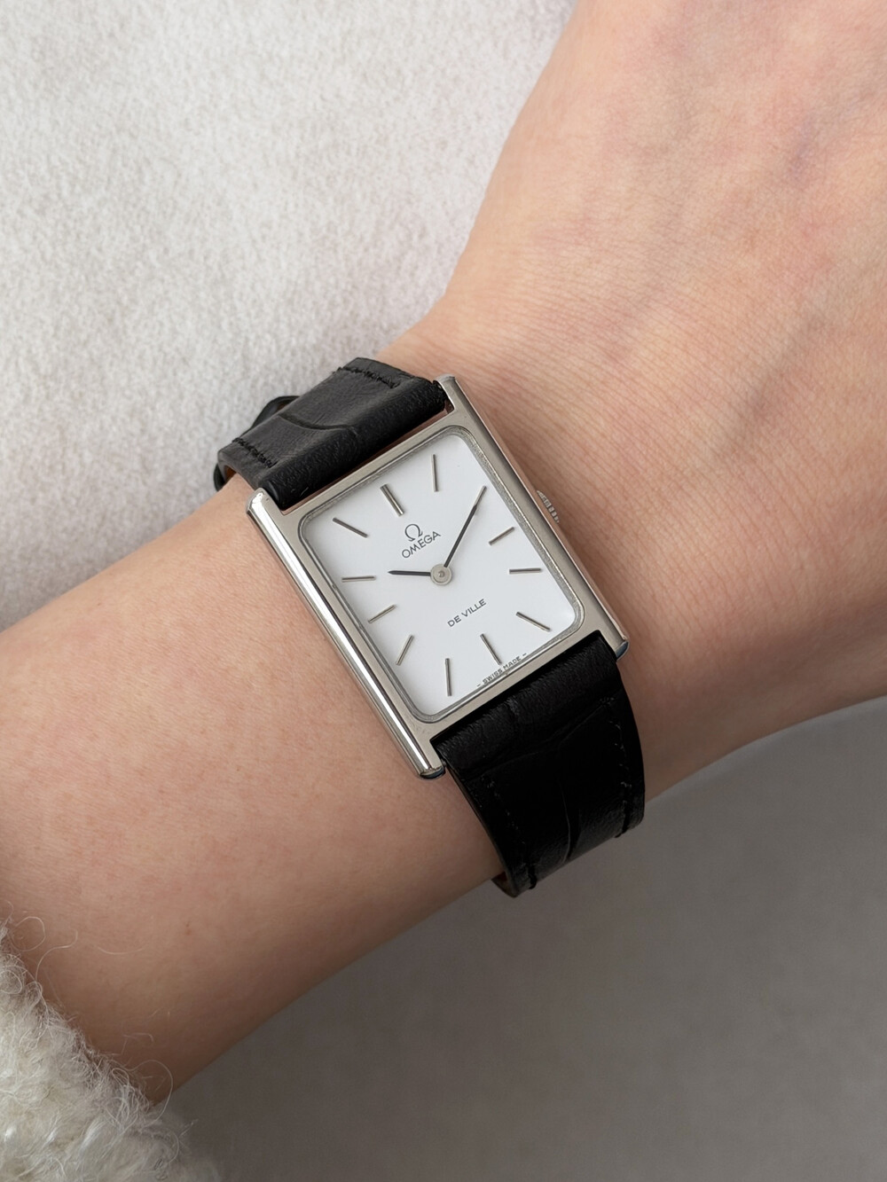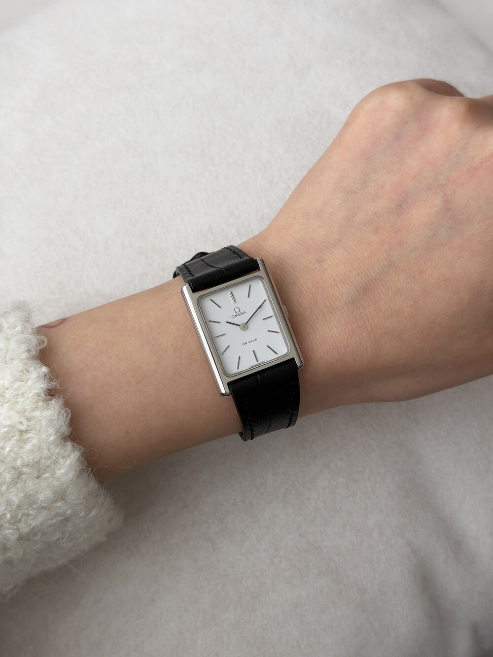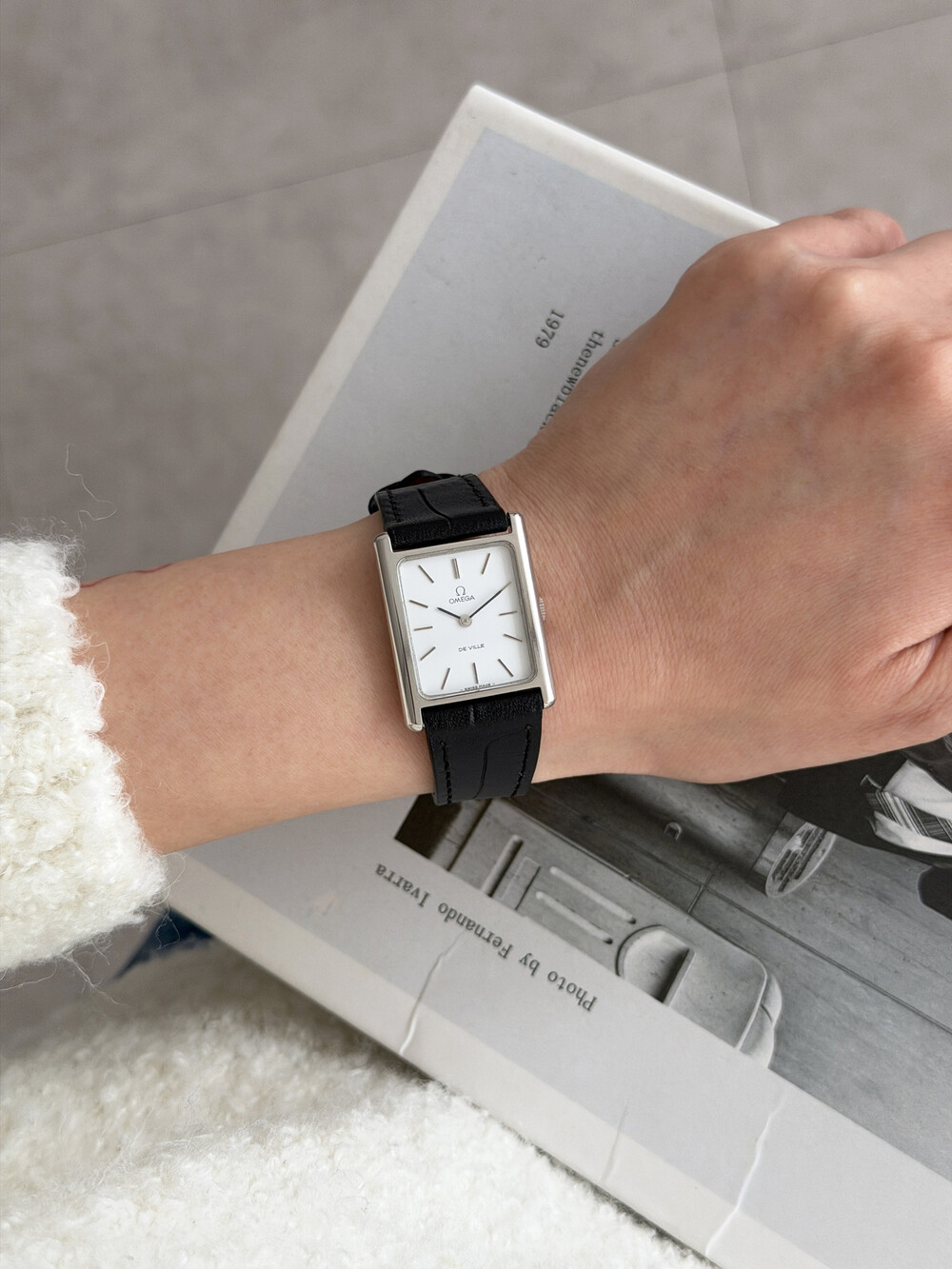 1978년도에 제작된 오메가 드빌 모델로 우아한 곡선의 실루엣과 화이트 다이얼 위를 장식하는