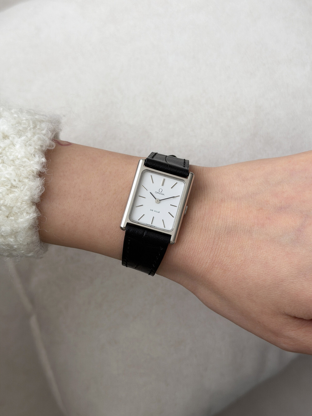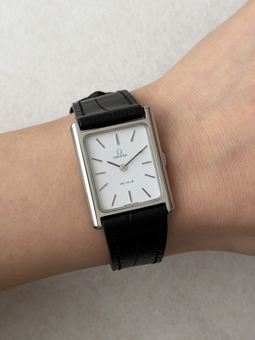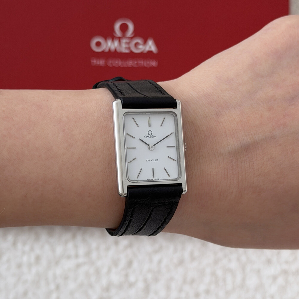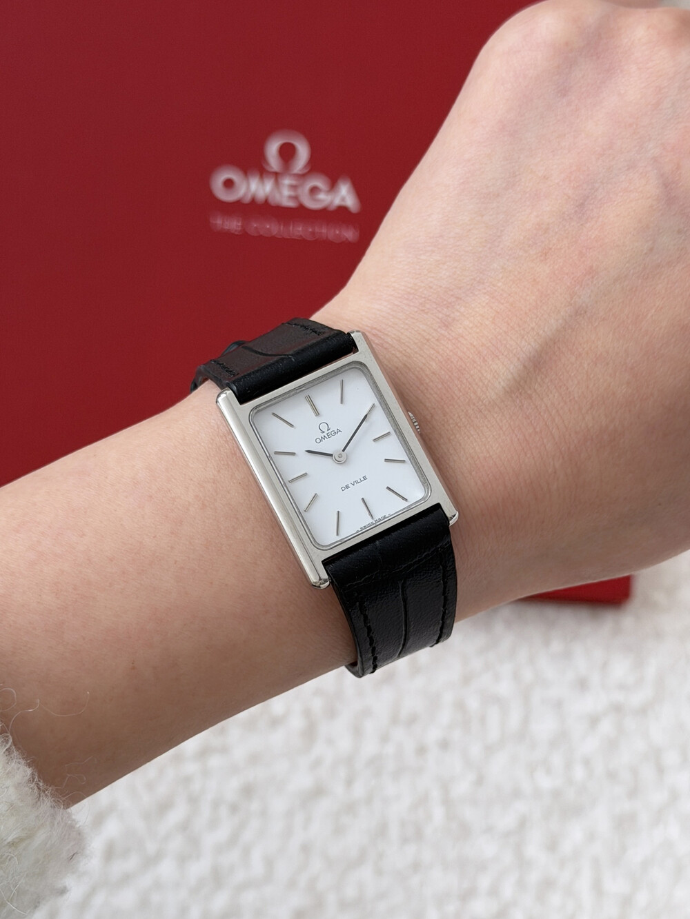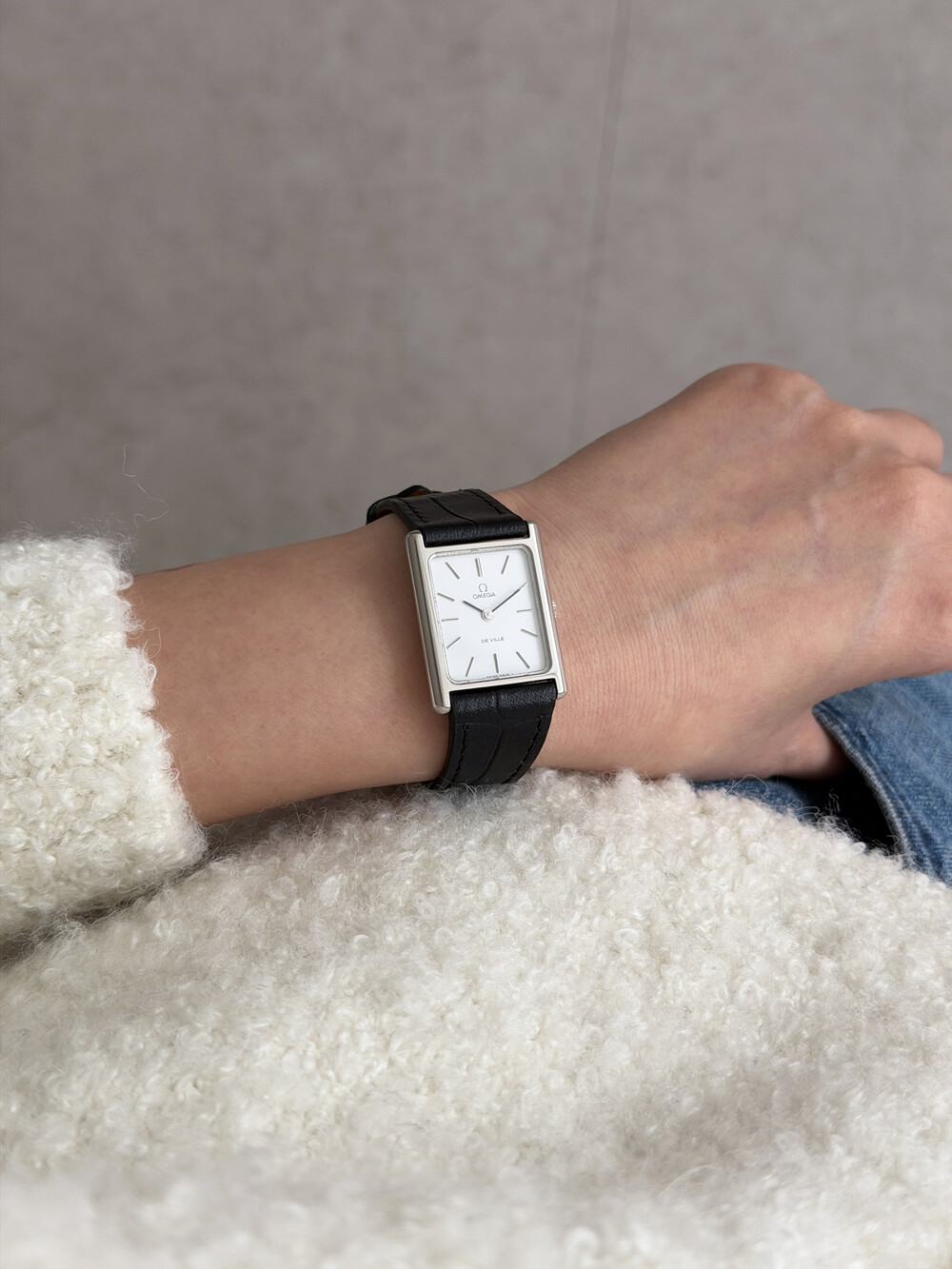 1978년도에 제작된 오메가 드빌 모델로 우아한 곡선의 실루엣과 화이트 다이얼 위를 장식하는