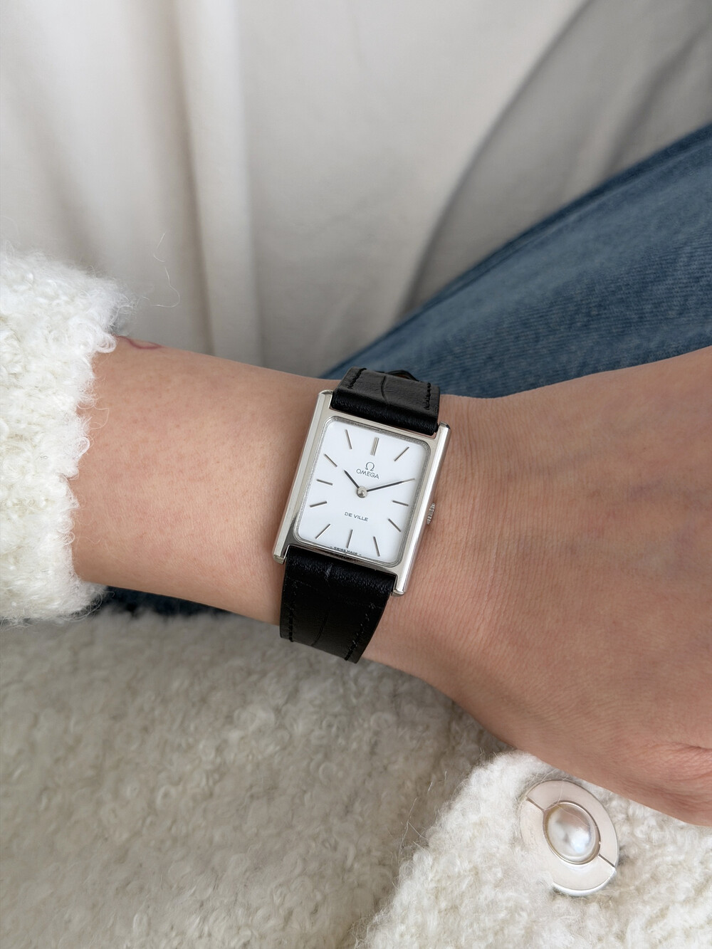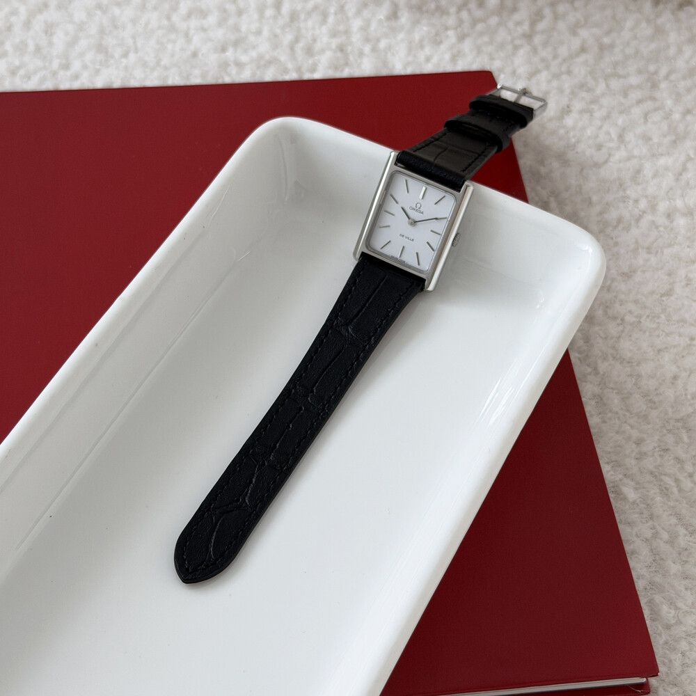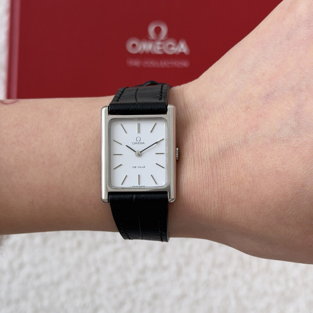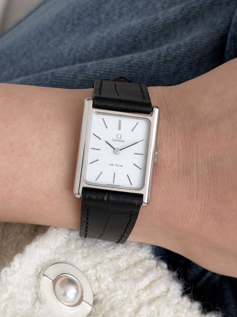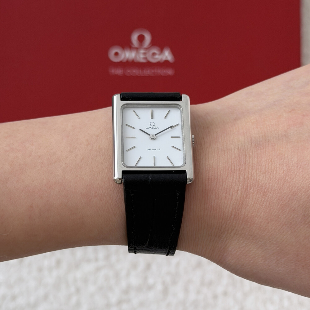 1978년도에 제작된 오메가 드빌 모델로 우아한 곡선의 실루엣과 화이트 다이얼 위를 장식하는