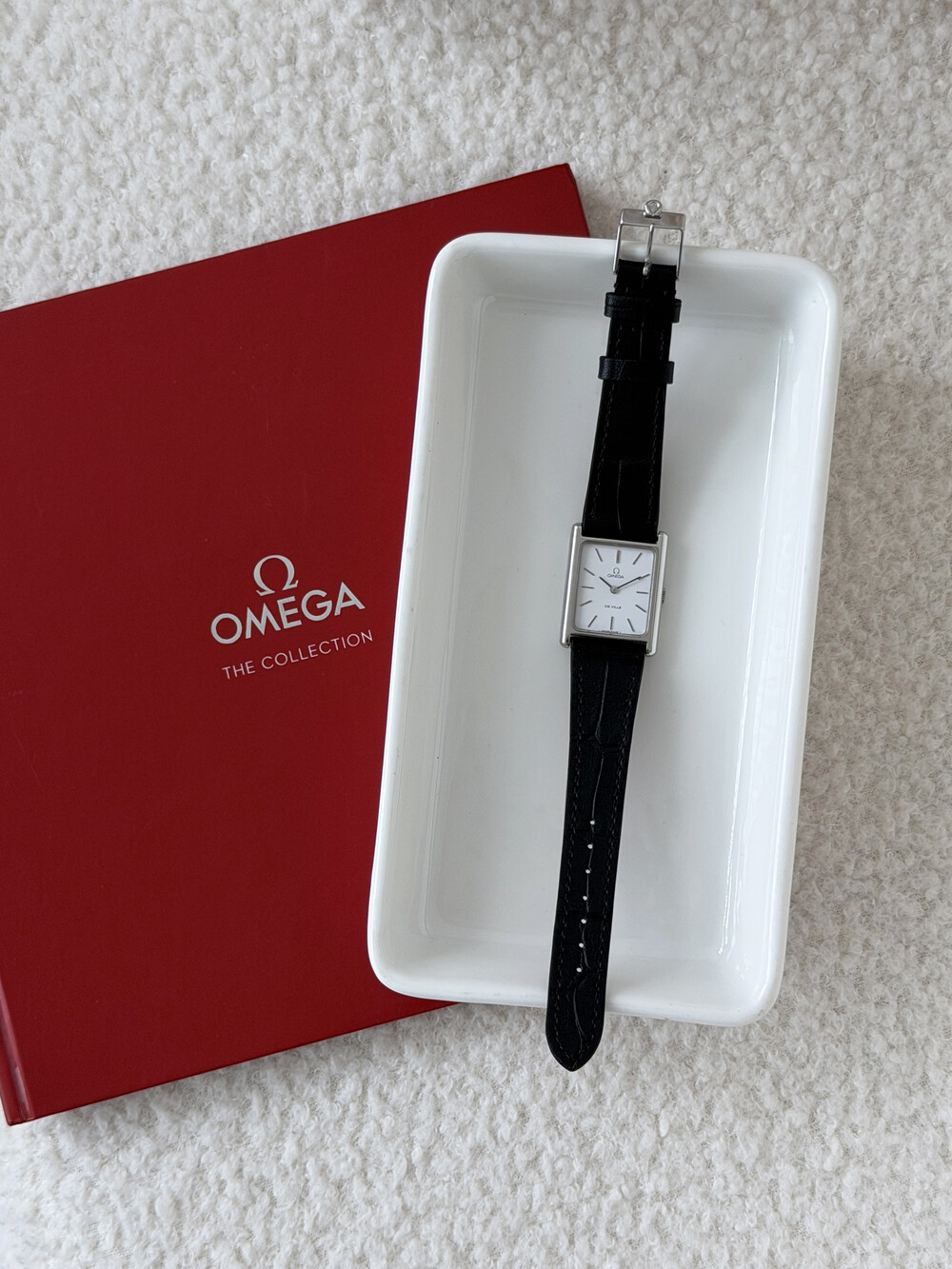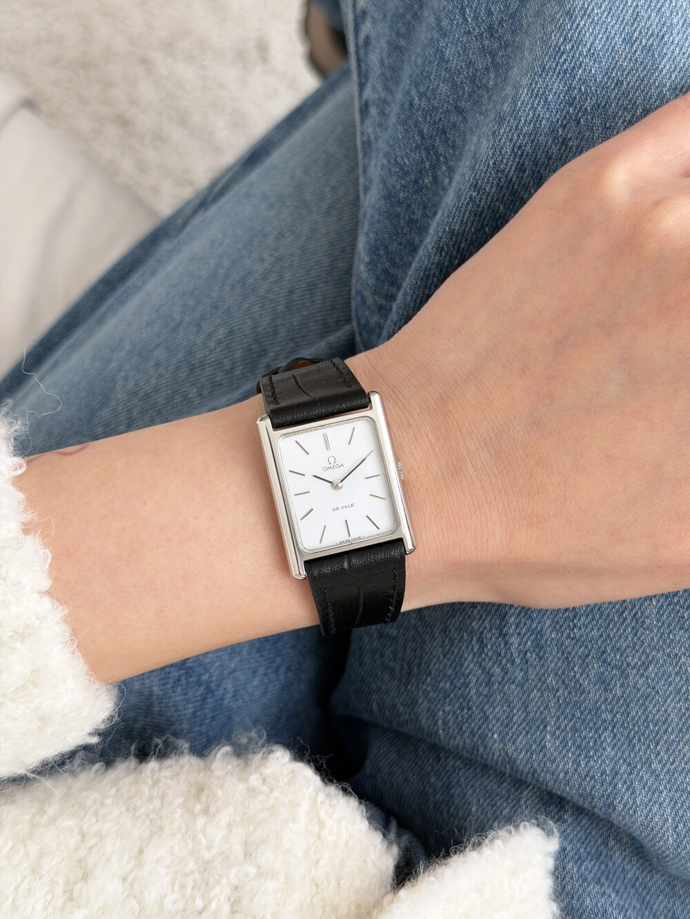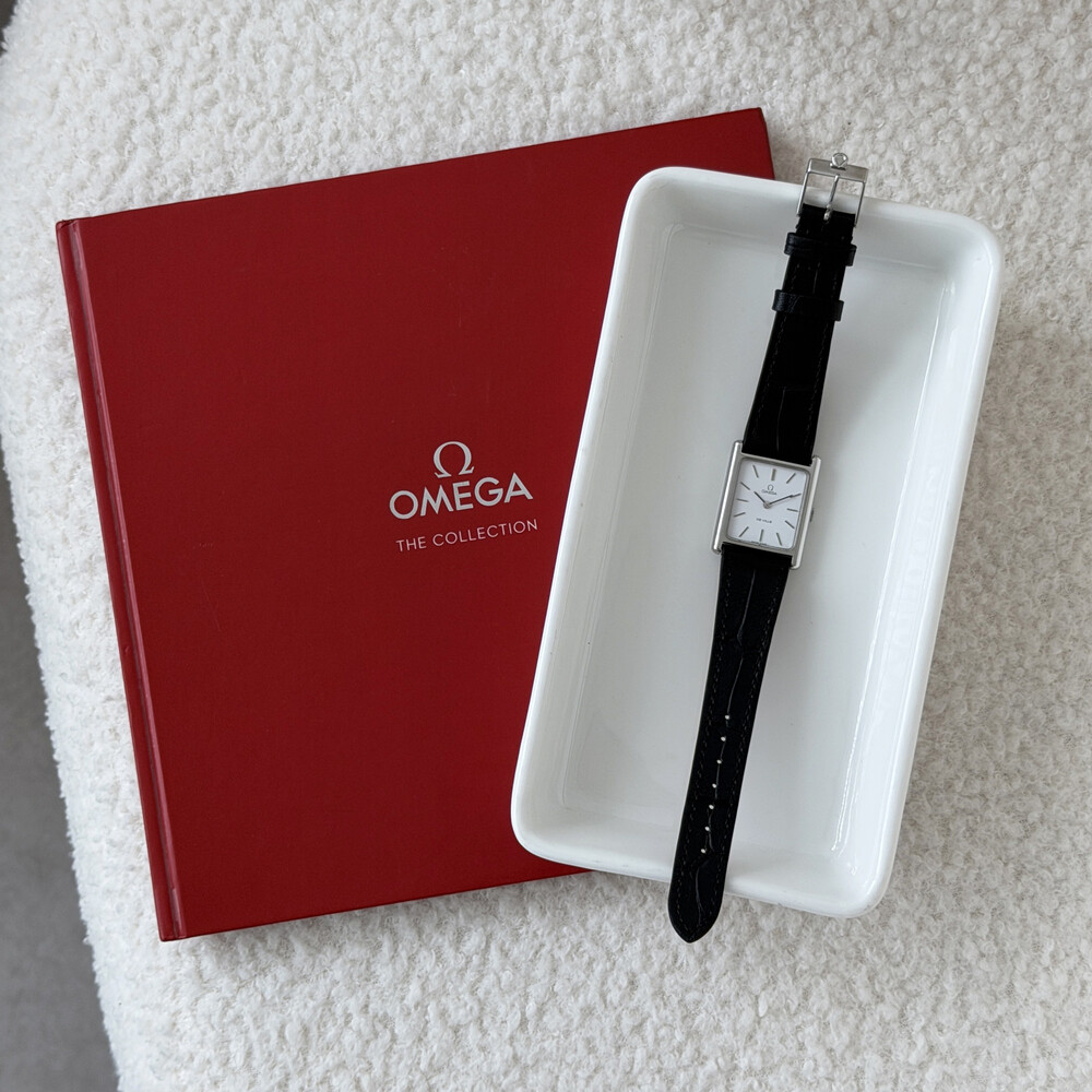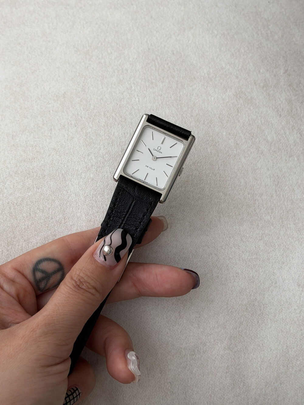 1978년도에 제작된 오메가 드빌 모델로 우아한 곡선의 실루엣과 화이트 다이얼 위를 장식하는