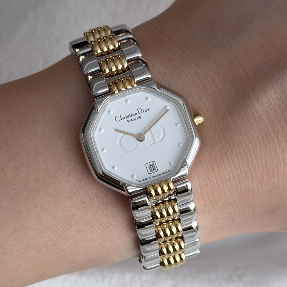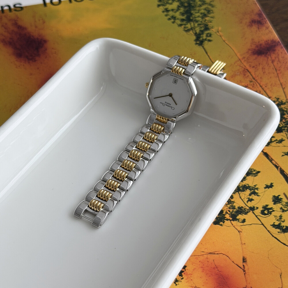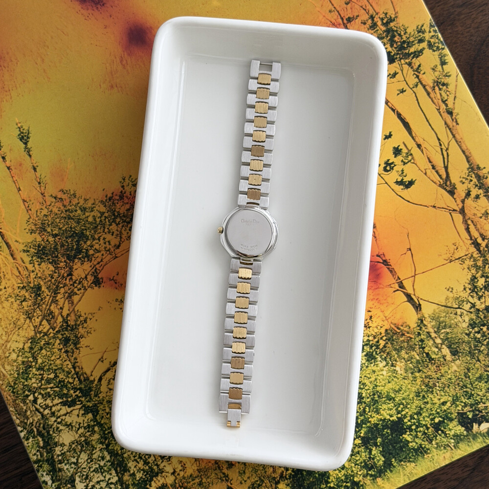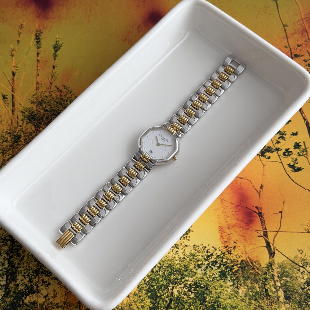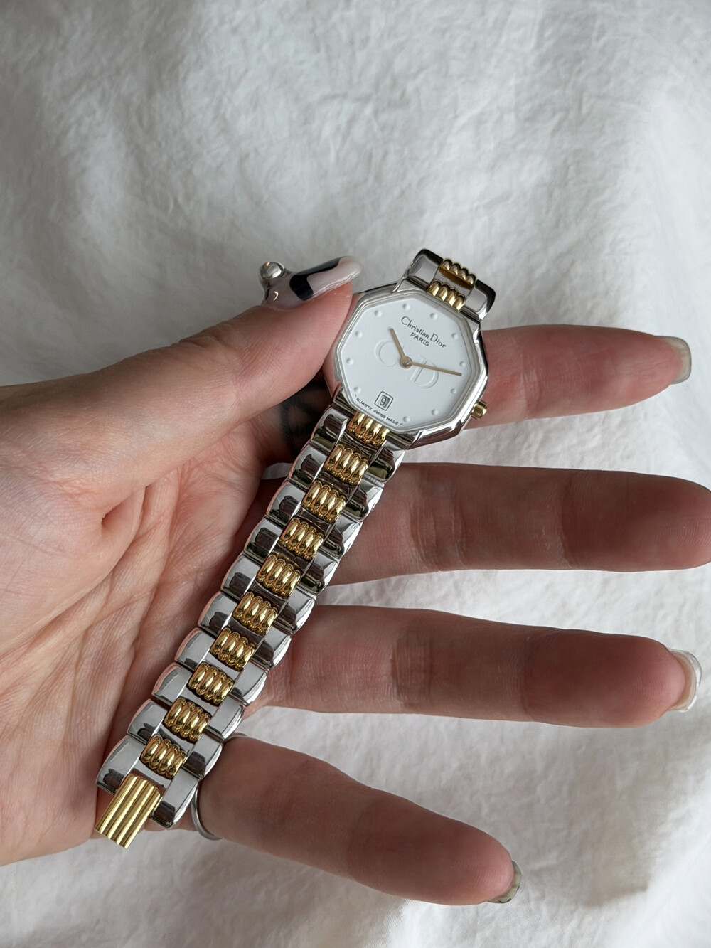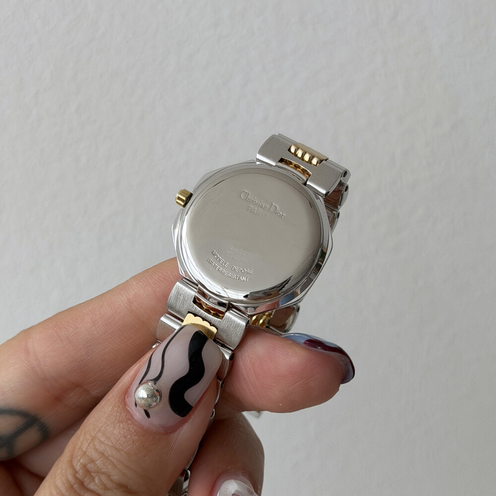 여성용으로 제작된 빈티지 디올 시계이며 스위스에서 생산된 쿼츠 무브먼트로 제작되었습니다.