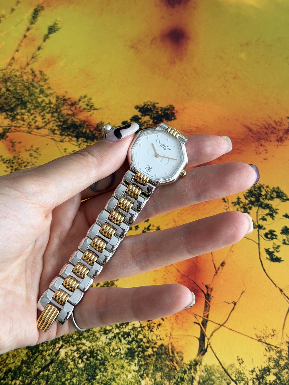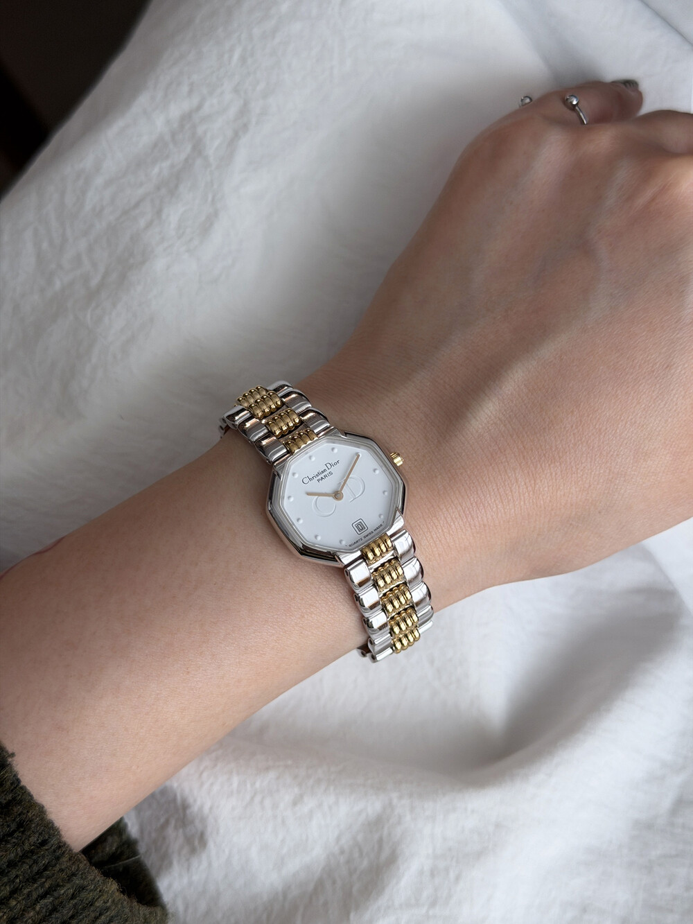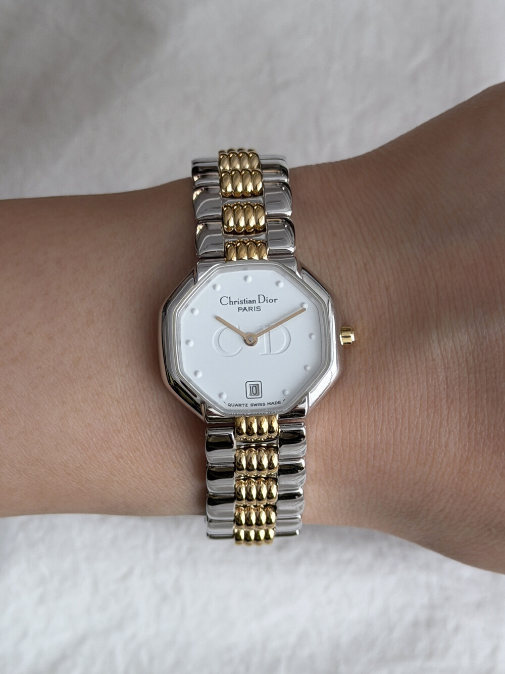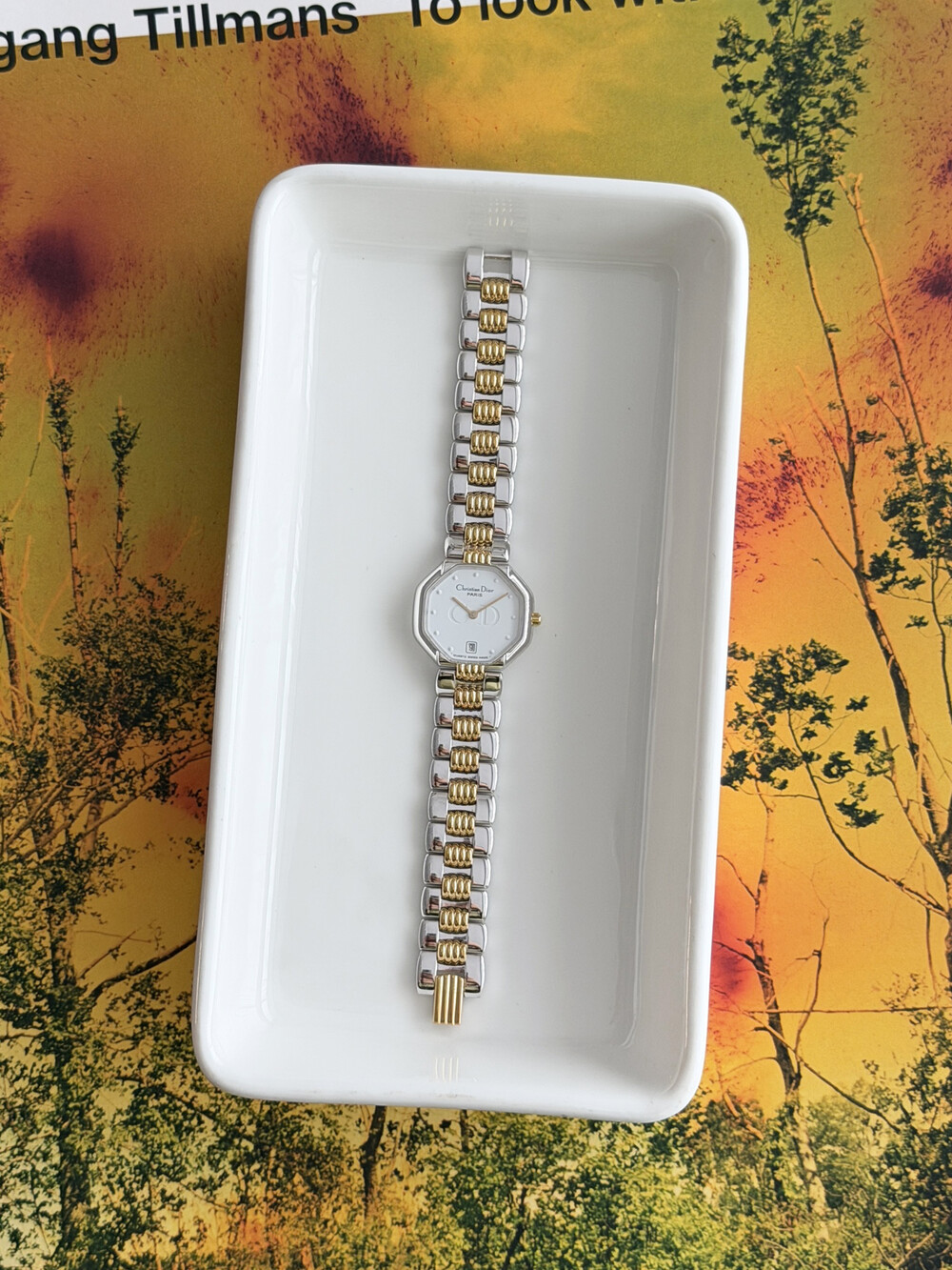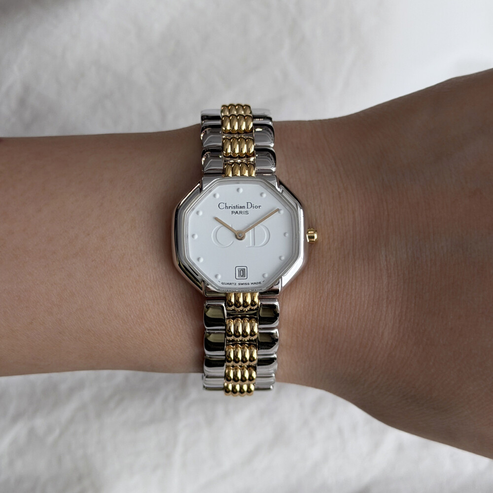 여성용으로 제작된 빈티지 디올 시계이며 스위스에서 생산된 쿼츠 무브먼트로 제작되었습니다.