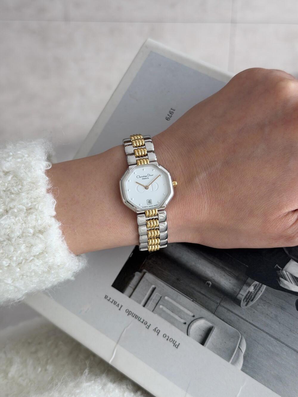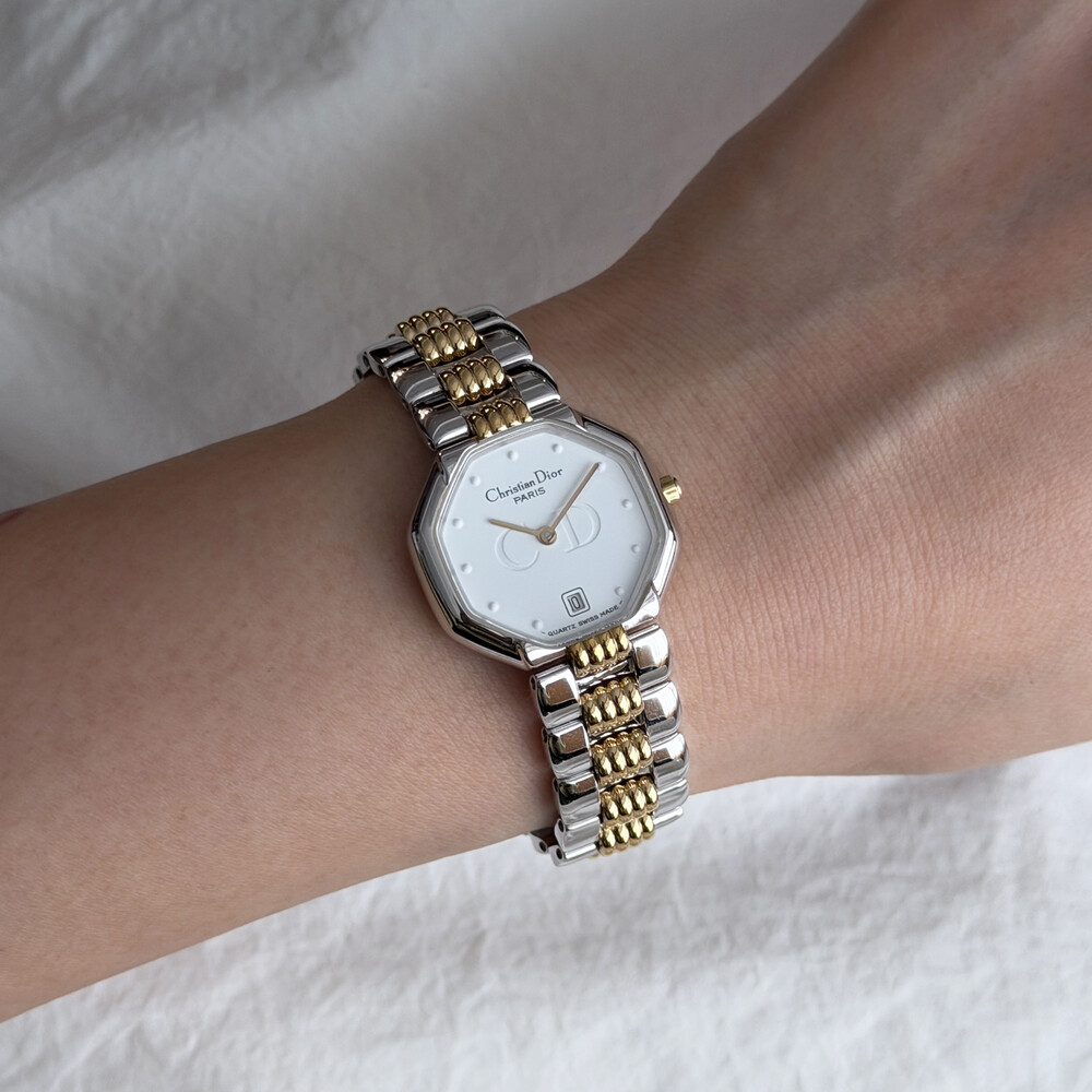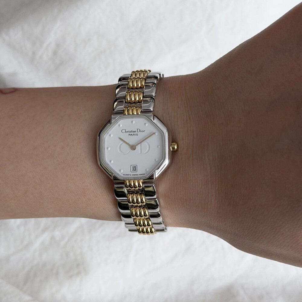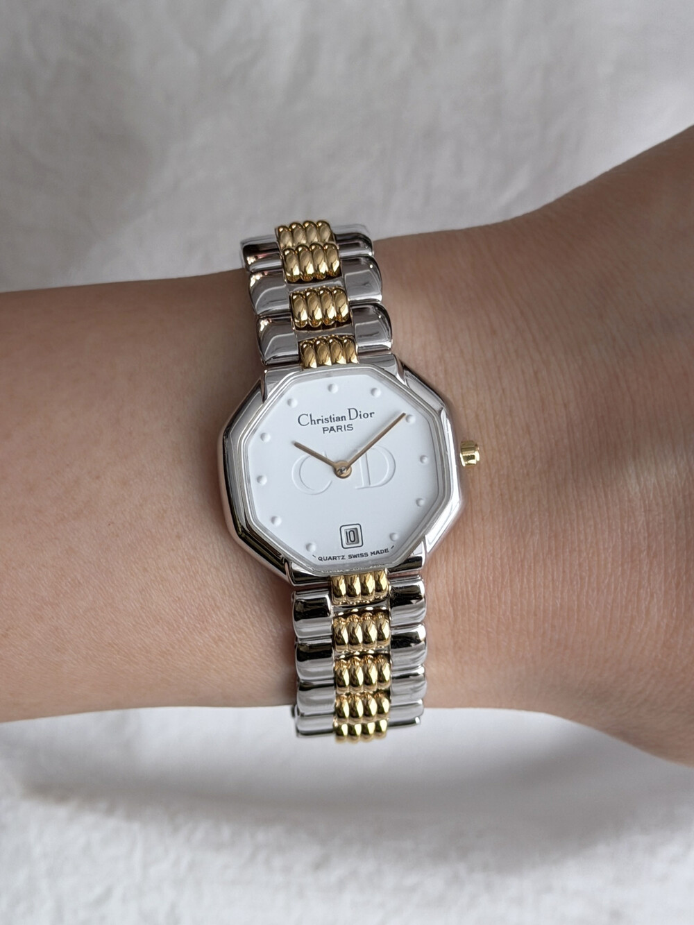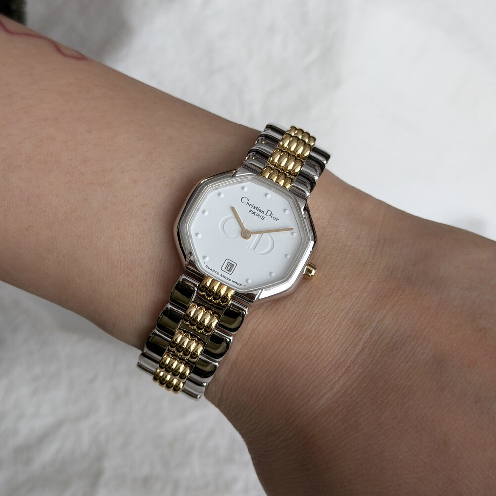 여성용으로 제작된 빈티지 디올 시계이며 스위스에서 생산된 쿼츠 무브먼트로 제작되었습니다.