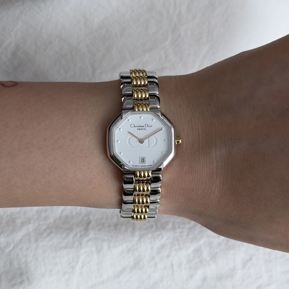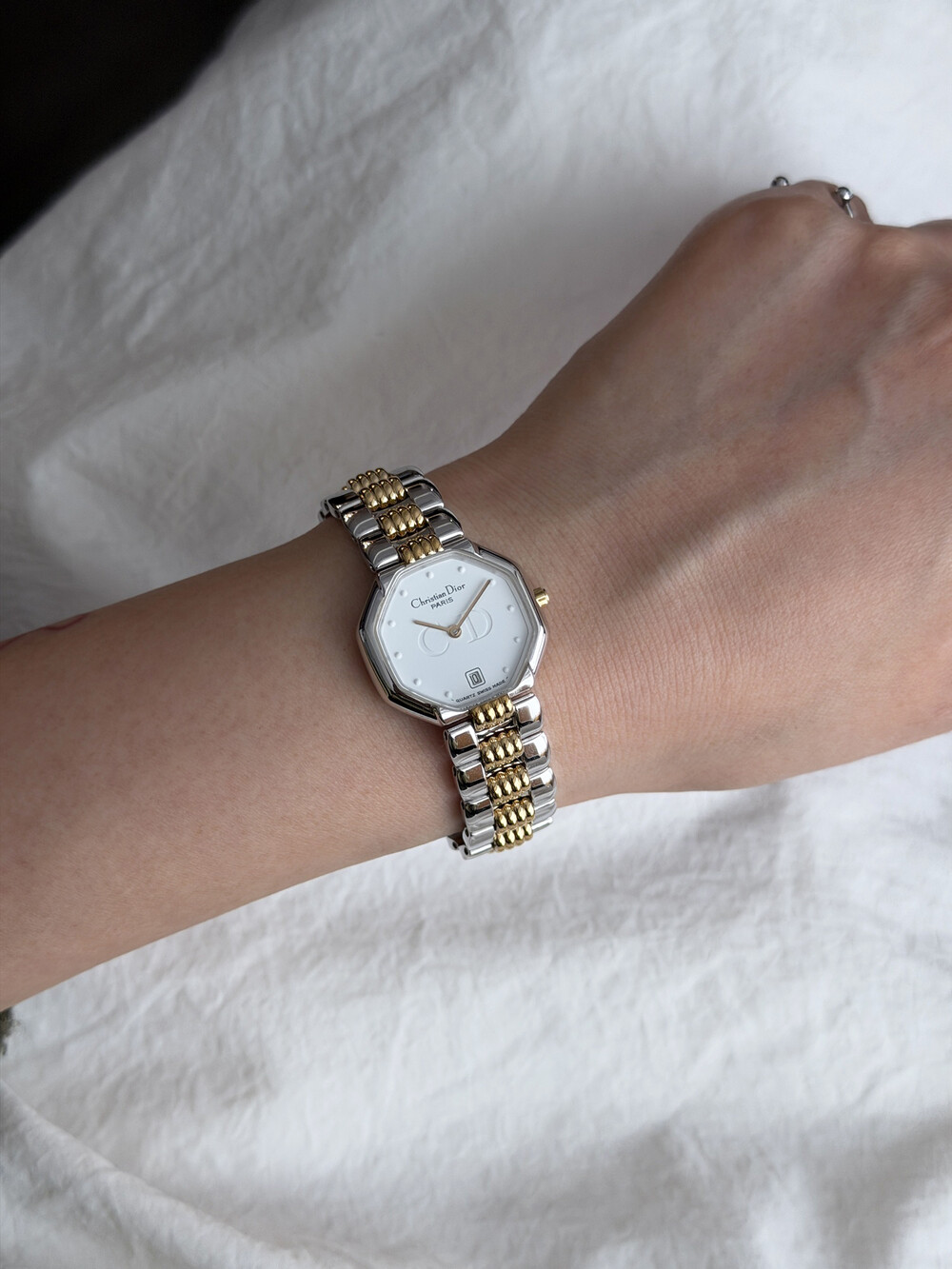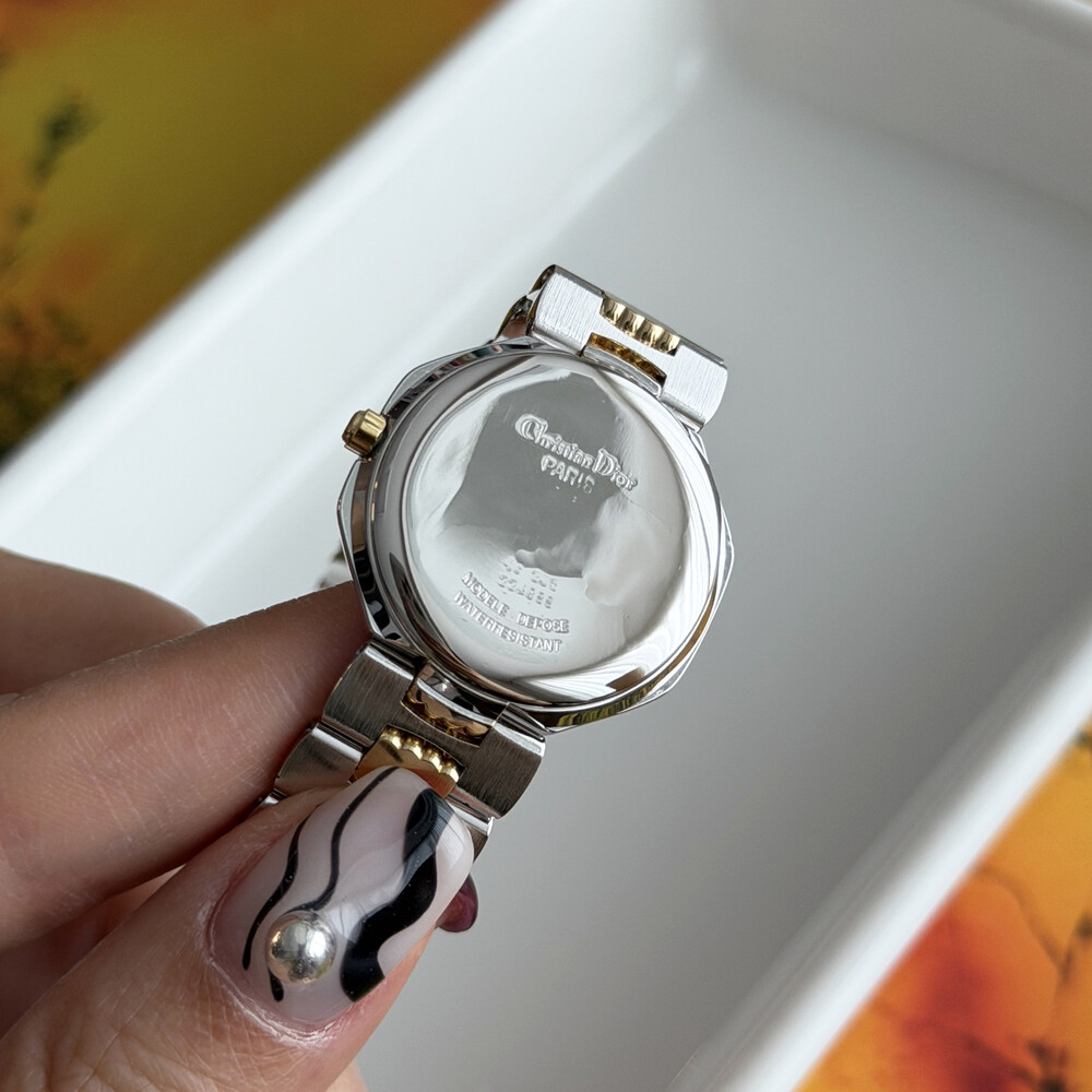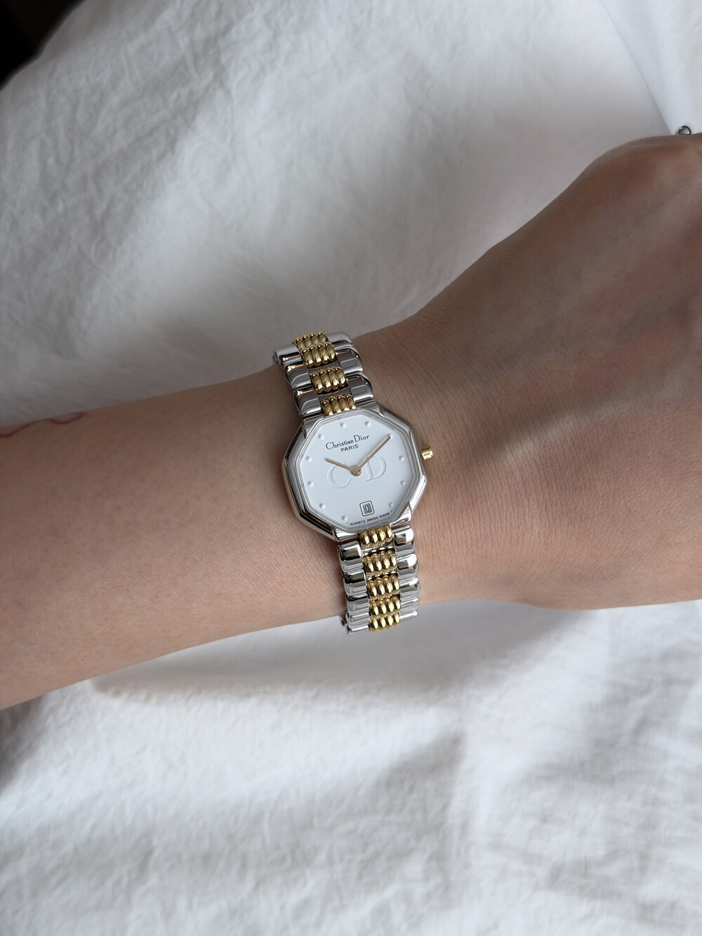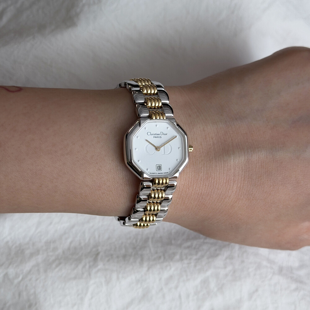 여성용으로 제작된 빈티지 디올 시계이며 스위스에서 생산된 쿼츠 무브먼트로 제작되었습니다.