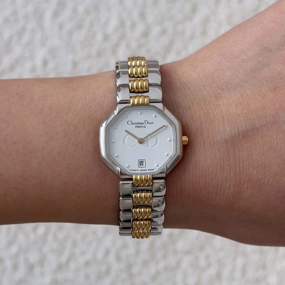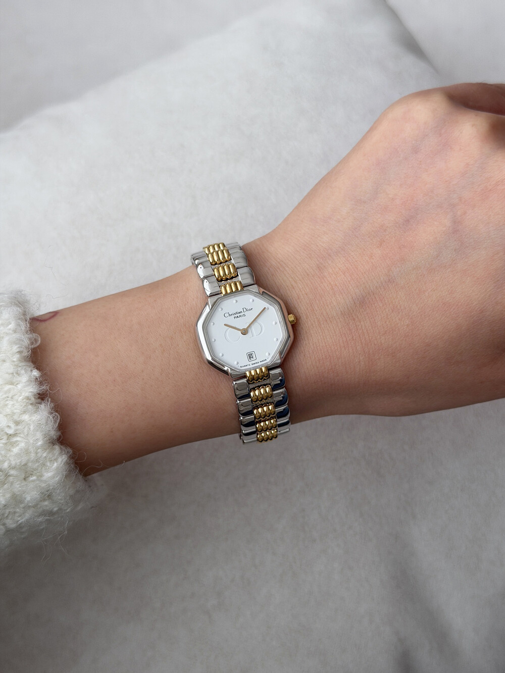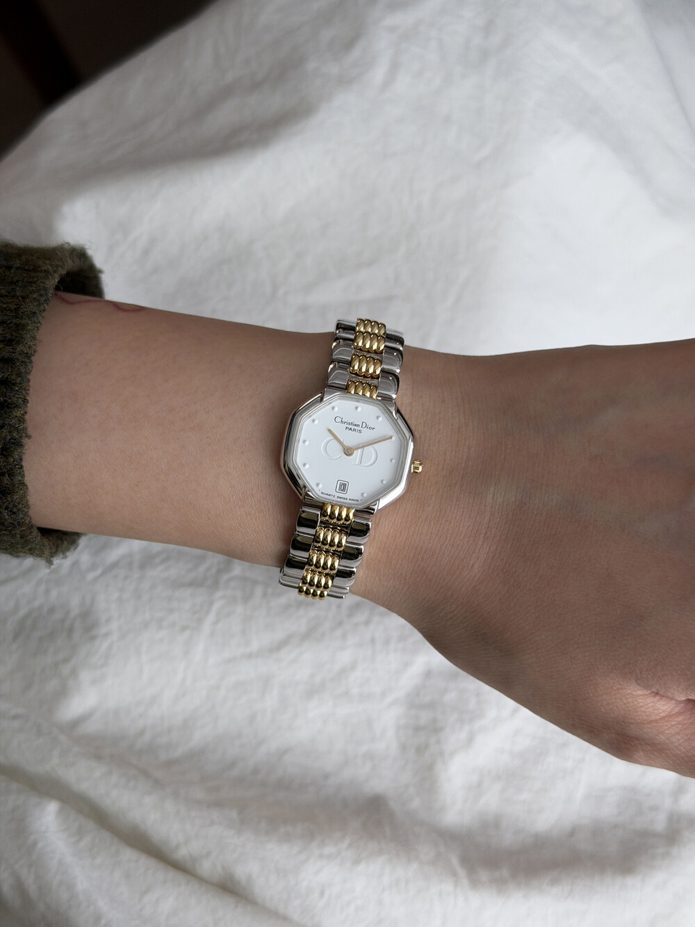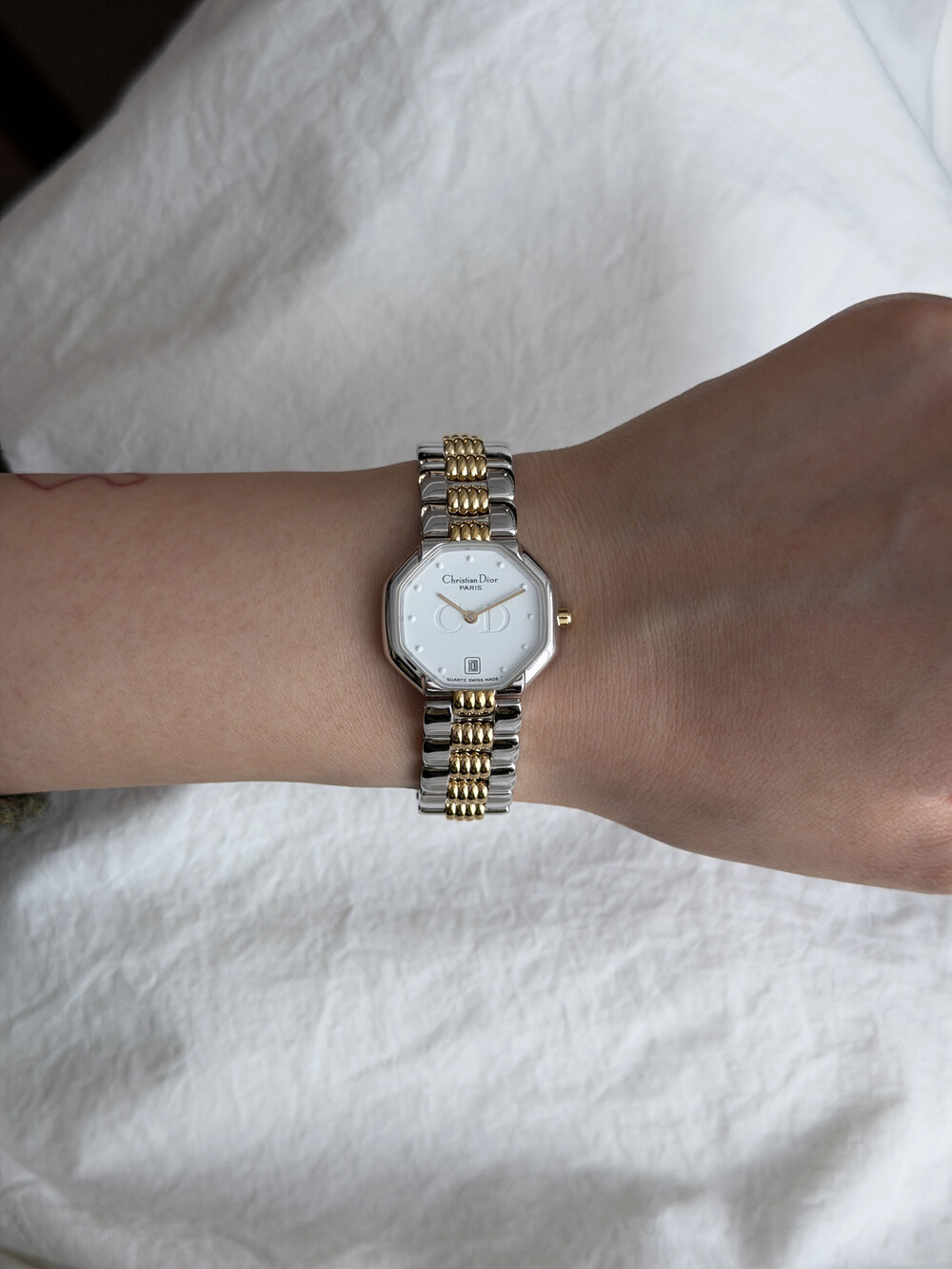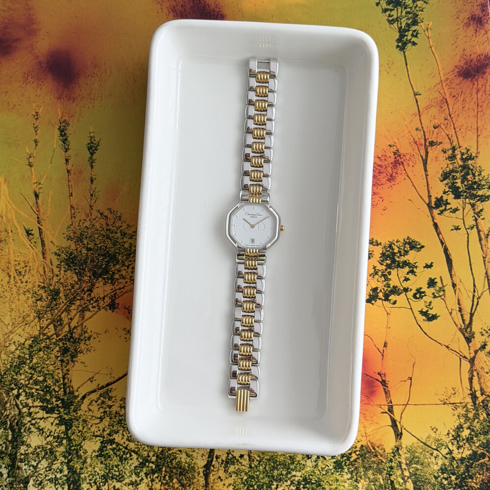 여성용으로 제작된 빈티지 디올 시계이며 스위스에서 생산된 쿼츠 무브먼트로 제작되었습니다.