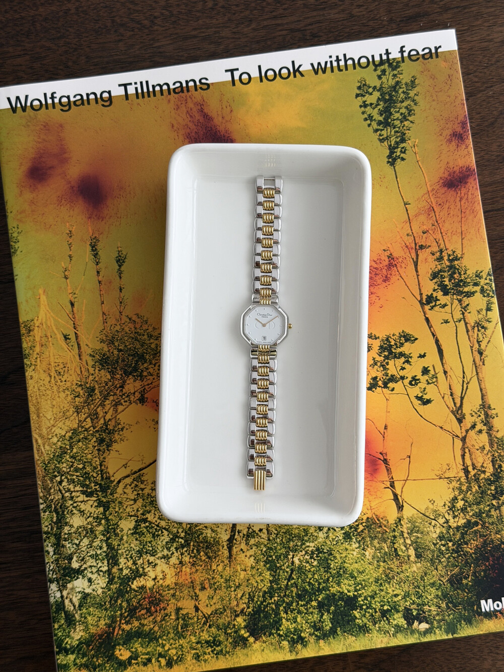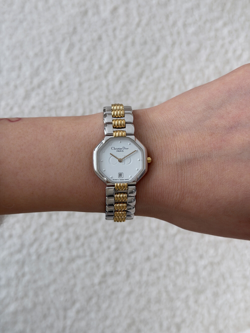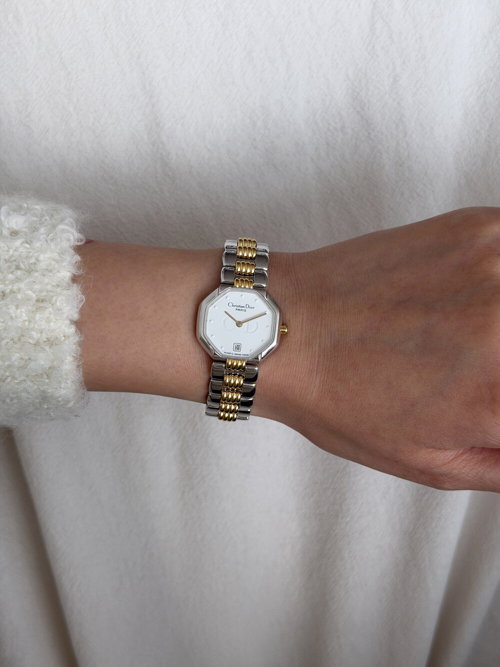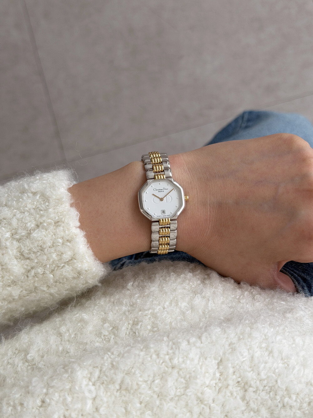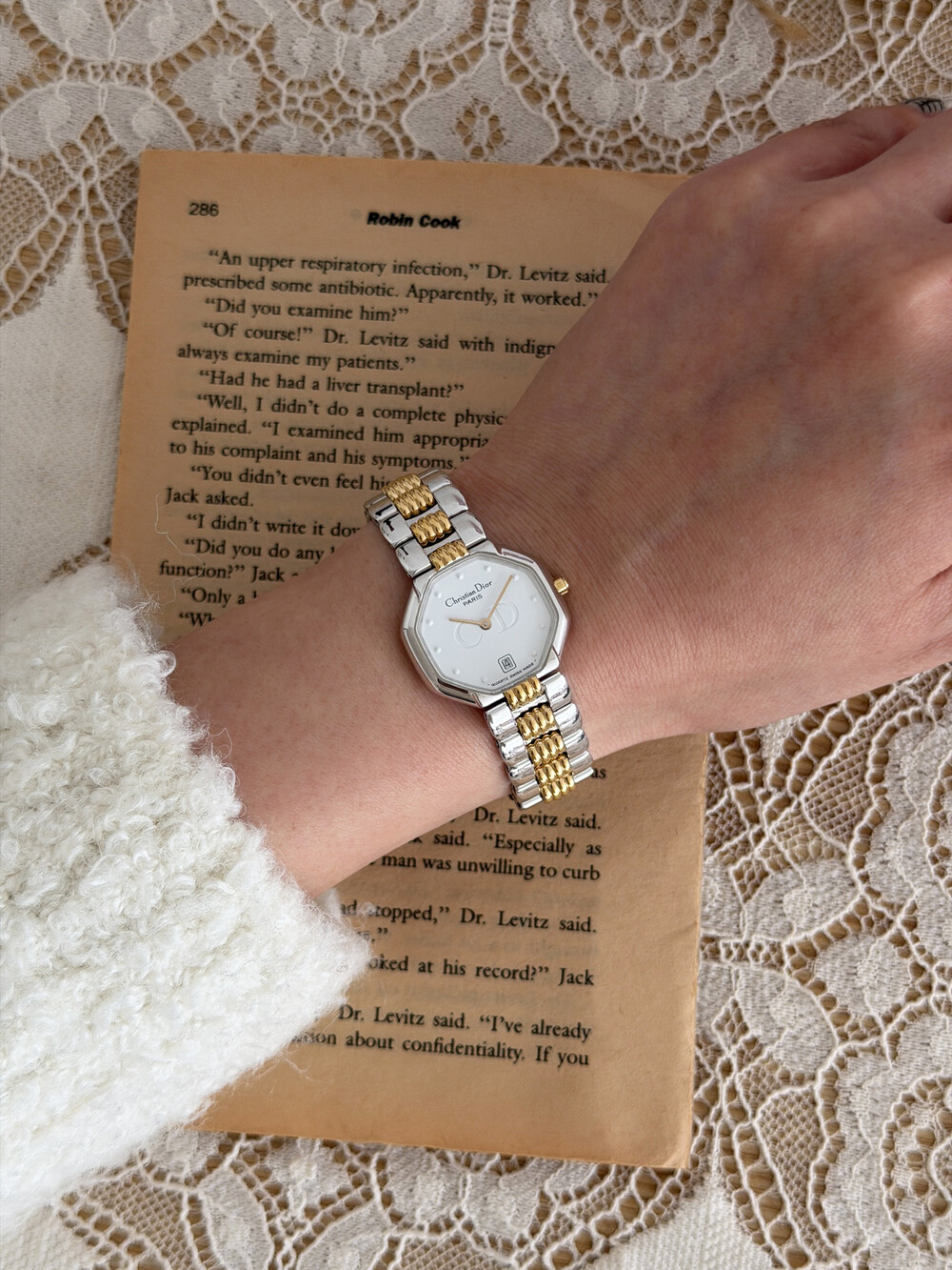 여성용으로 제작된 빈티지 디올 시계이며 스위스에서 생산된 쿼츠 무브먼트로 제작되었습니다.