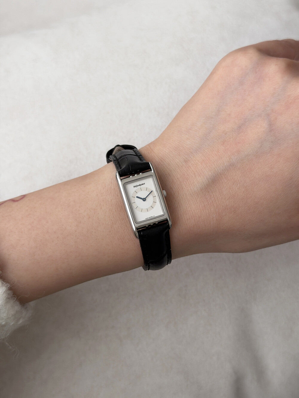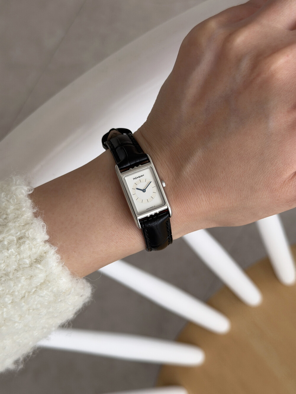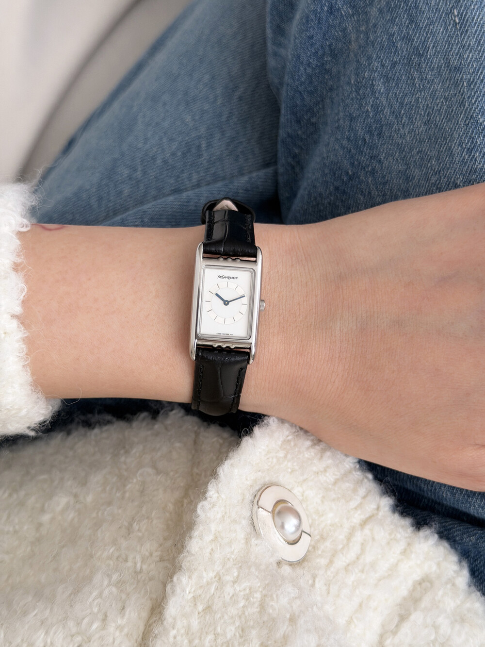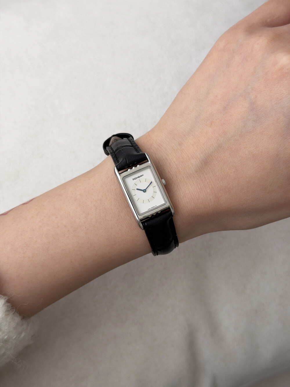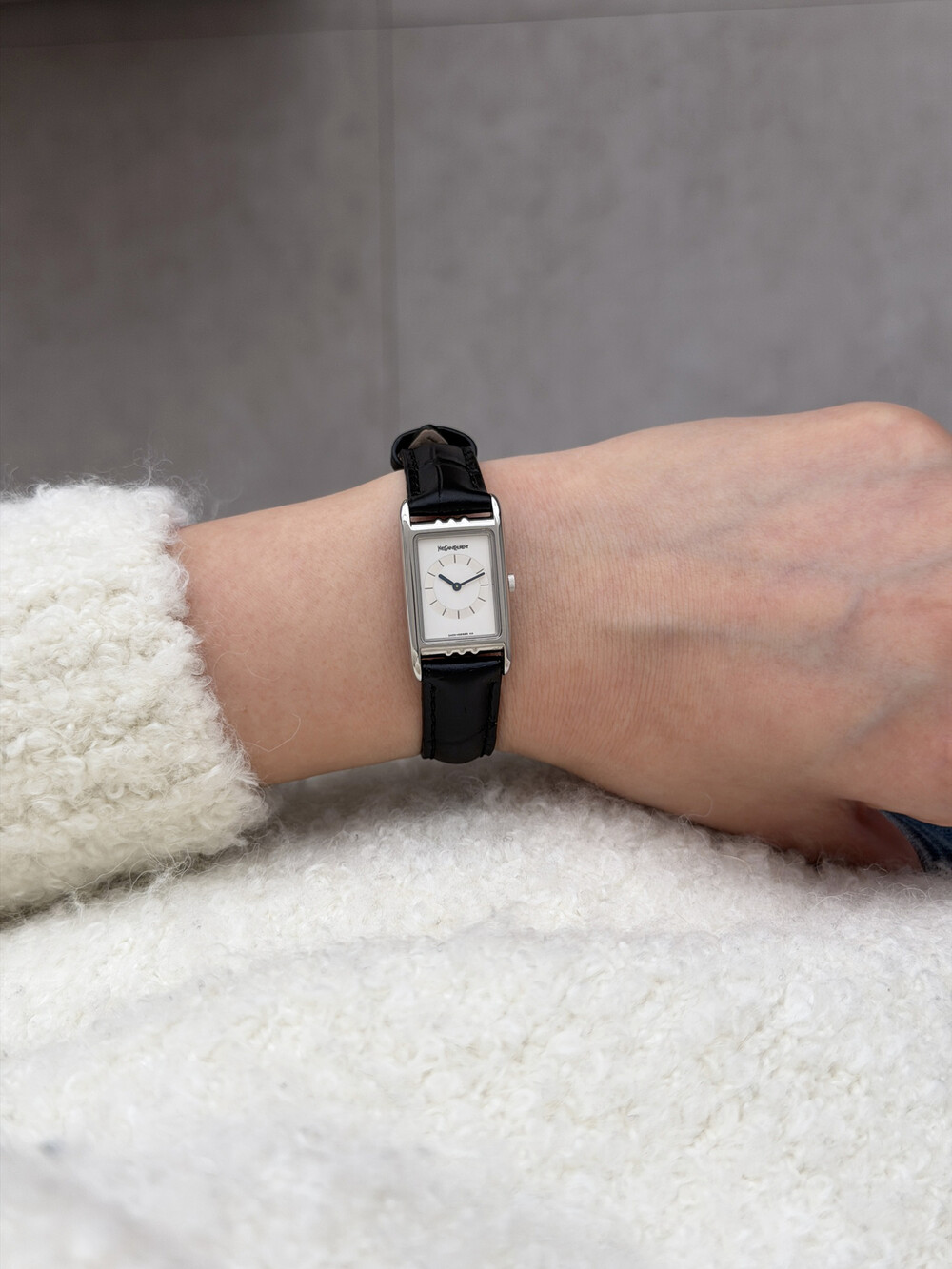 부드러운 곡선의 스퀘어 케이스와 화이트 다이얼 위를 장식하는 생로랑 로고가 매력적인 시계입니다.