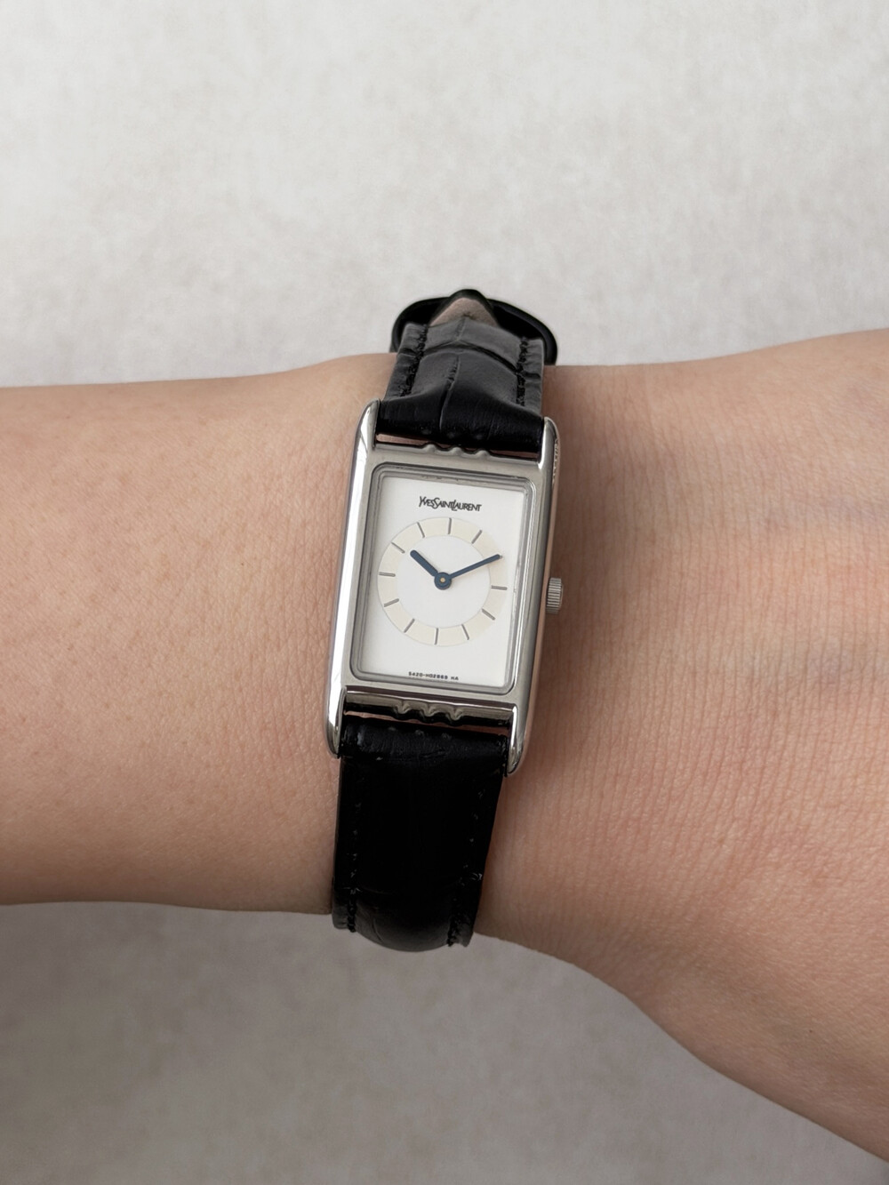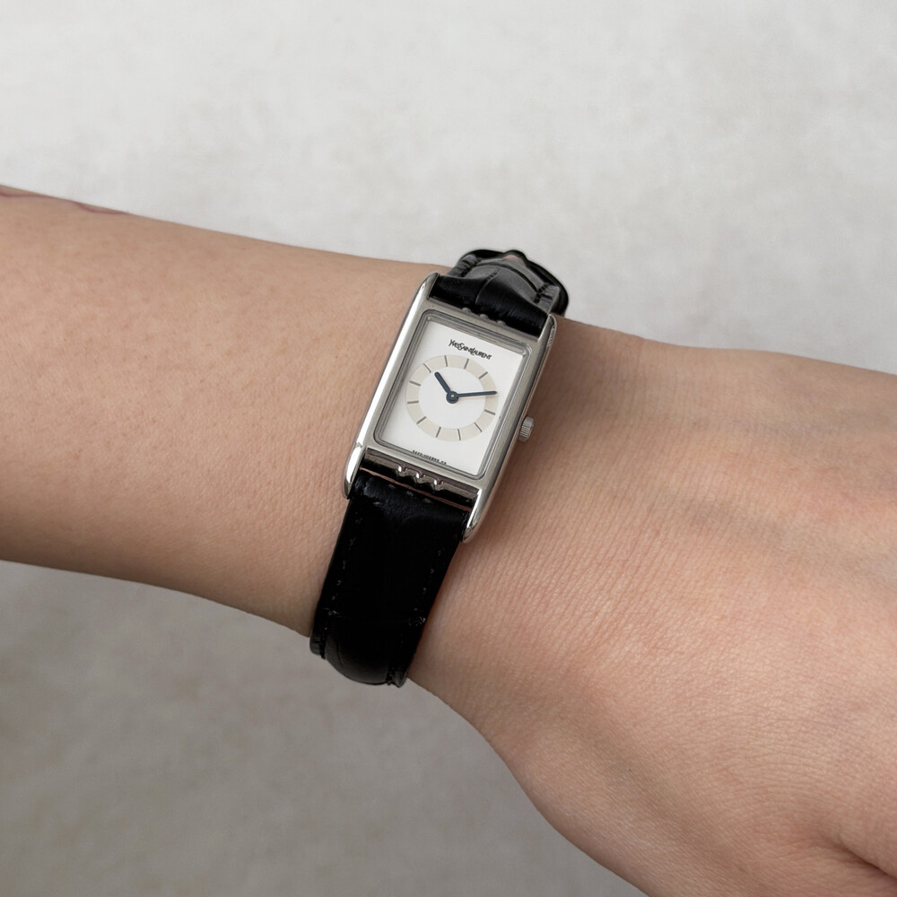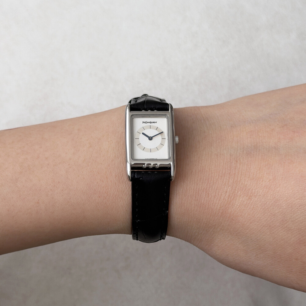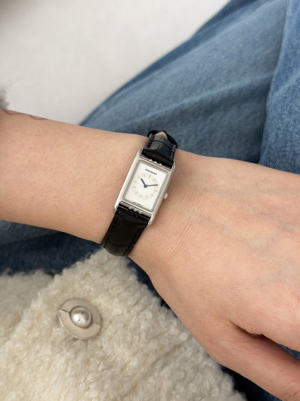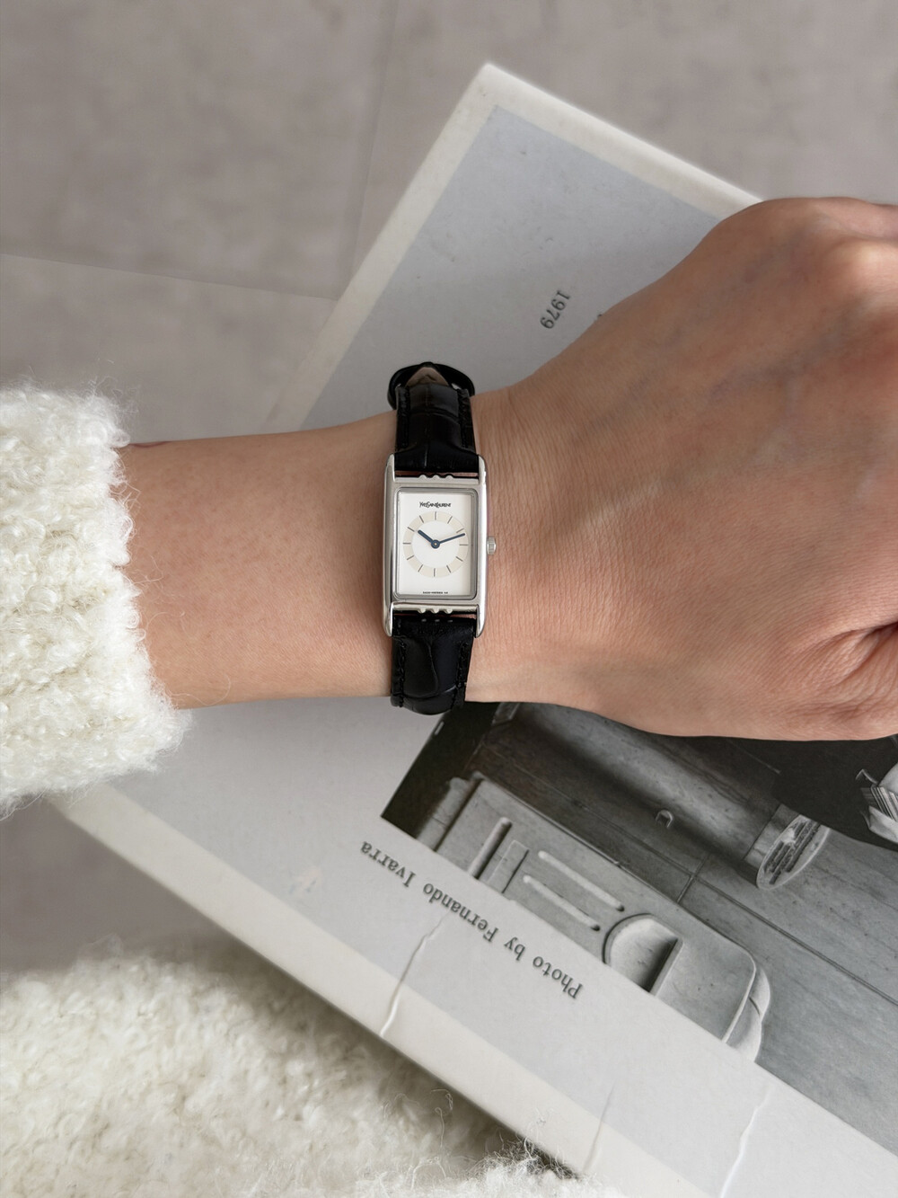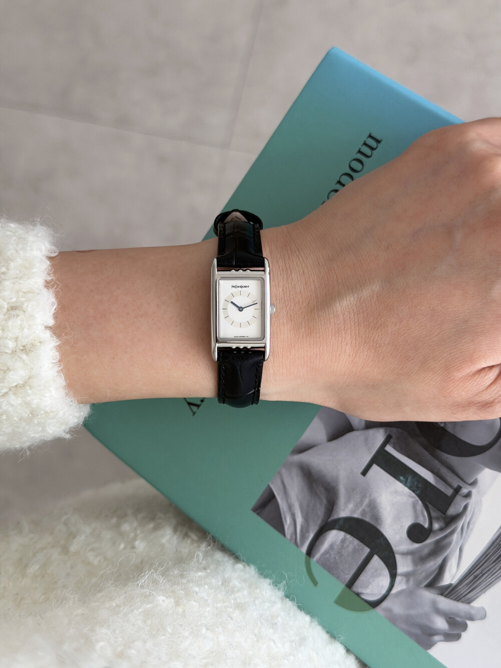 부드러운 곡선의 스퀘어 케이스와 화이트 다이얼 위를 장식하는 생로랑 로고가 매력적인 시계입니다.