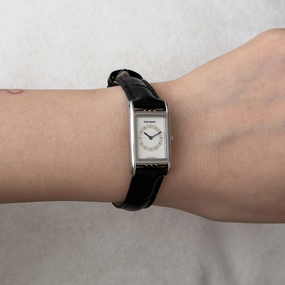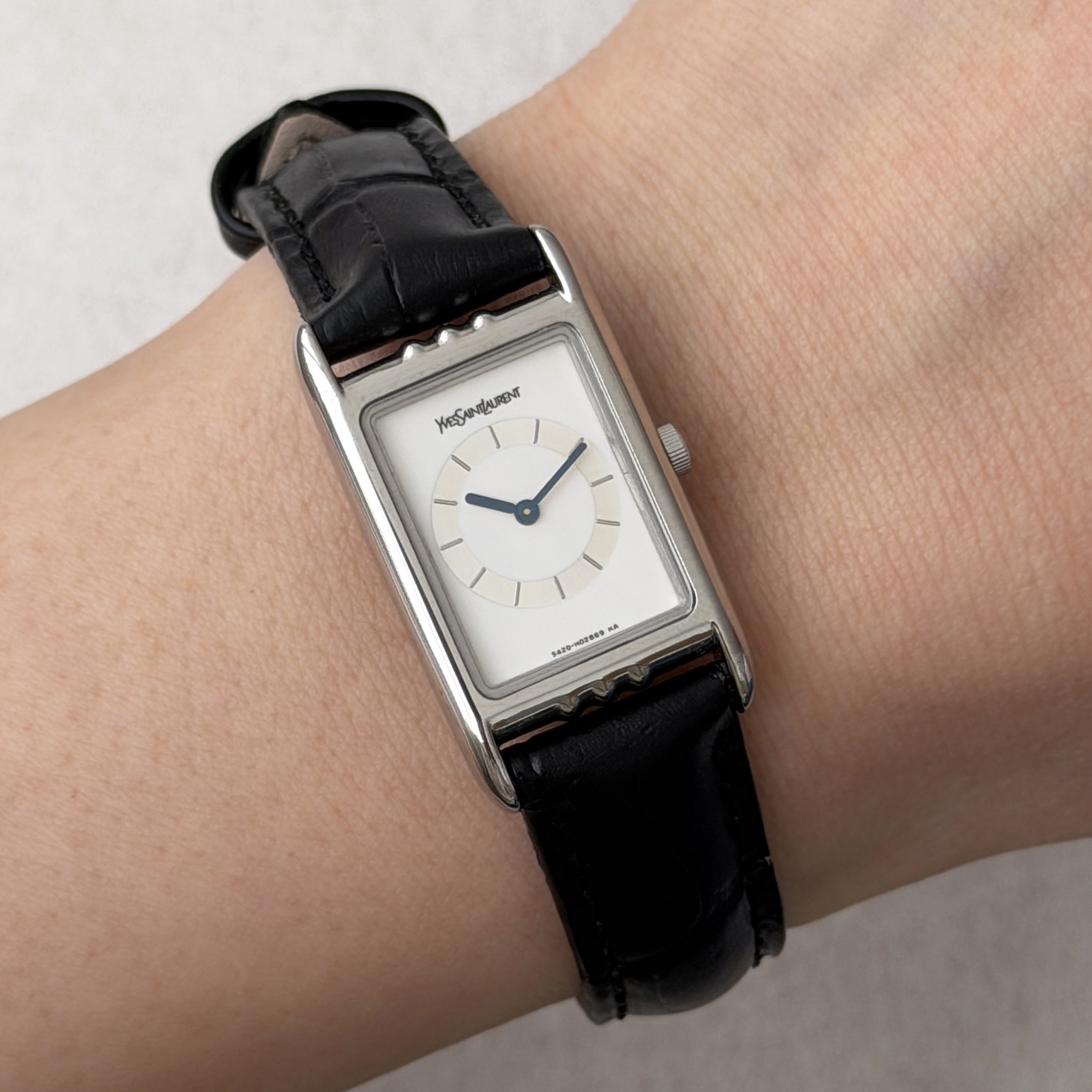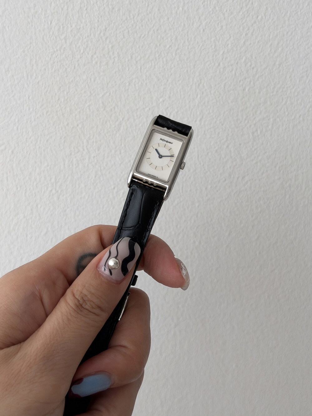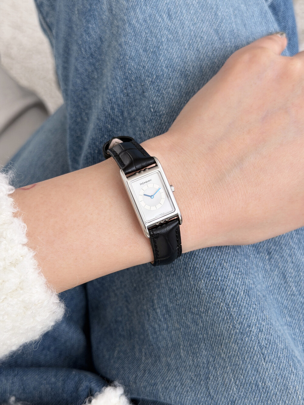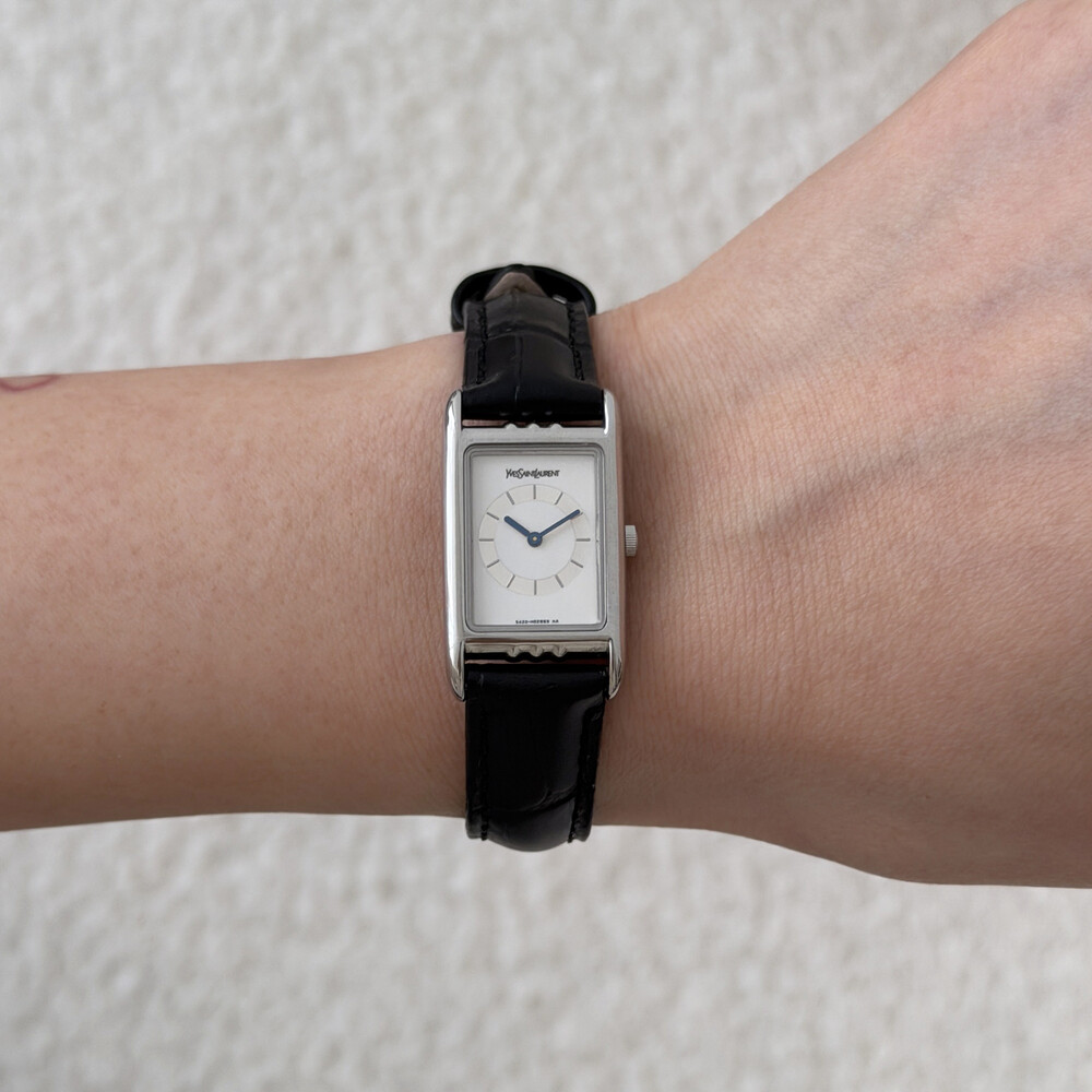 부드러운 곡선의 스퀘어 케이스와 화이트 다이얼 위를 장식하는 생로랑 로고가 매력적인 시계입니다.