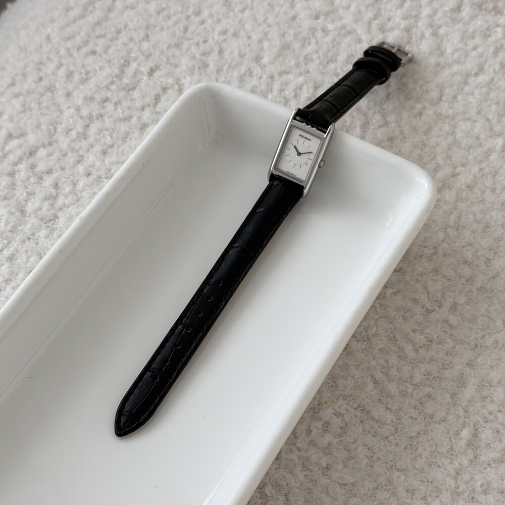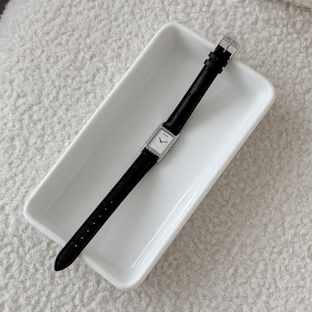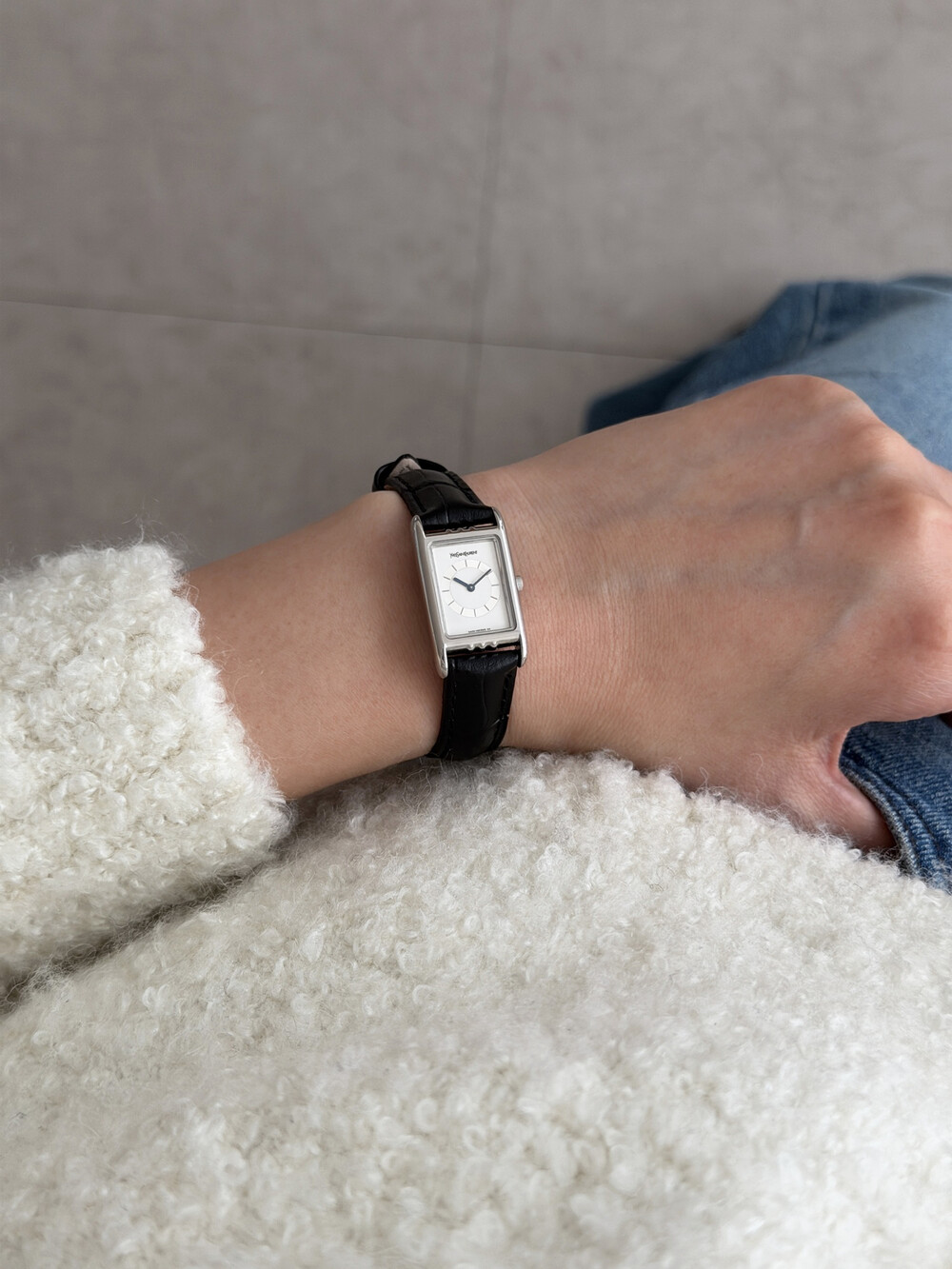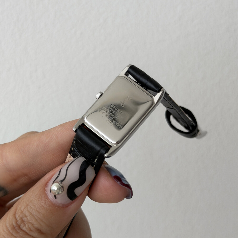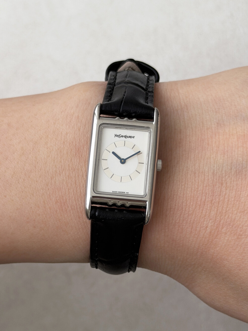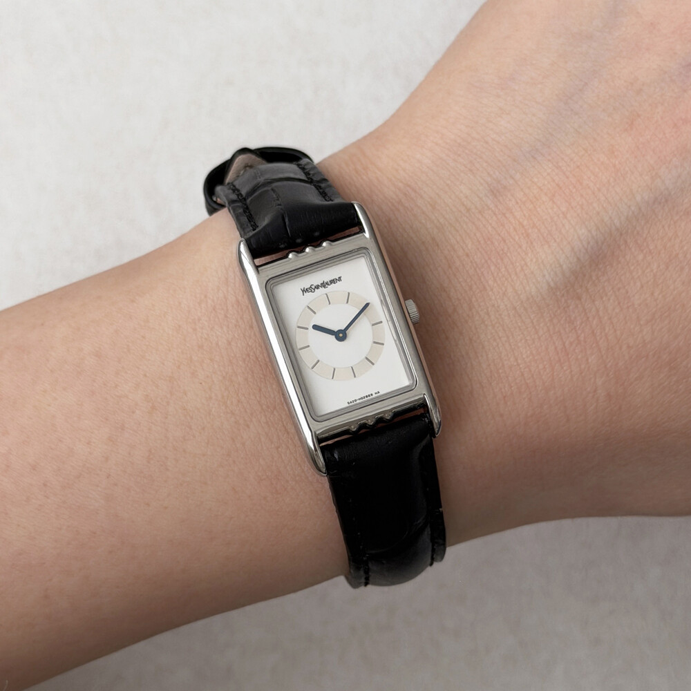 부드러운 곡선의 스퀘어 케이스와 화이트 다이얼 위를 장식하는 생로랑 로고가 매력적인 시계입니다.
