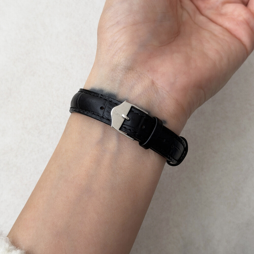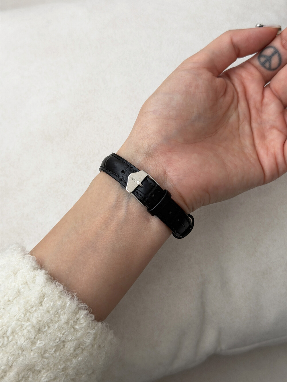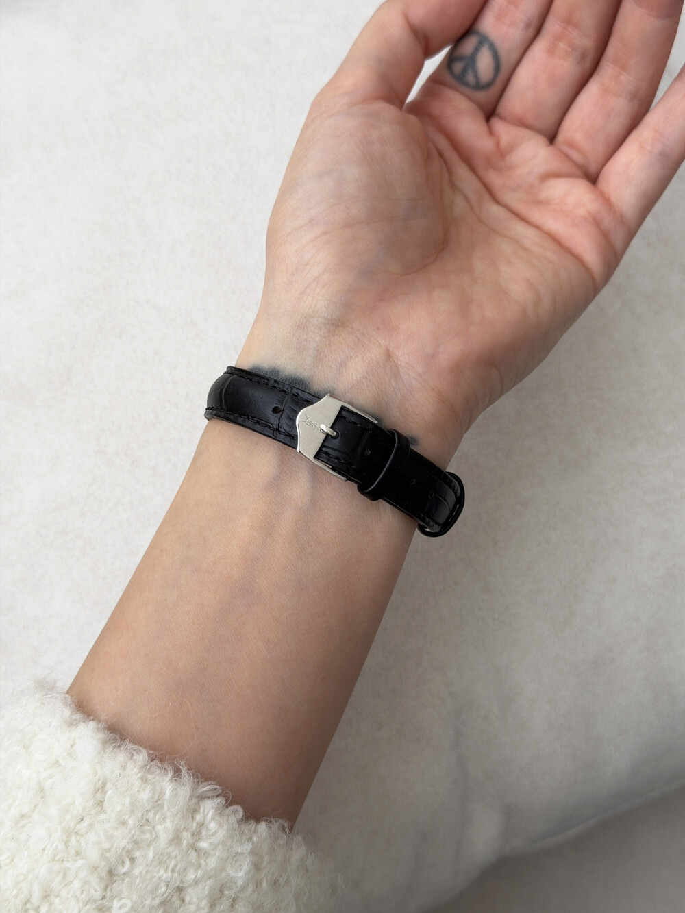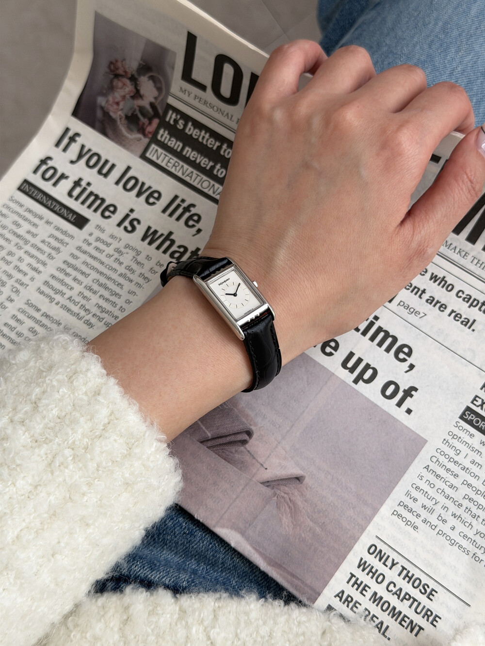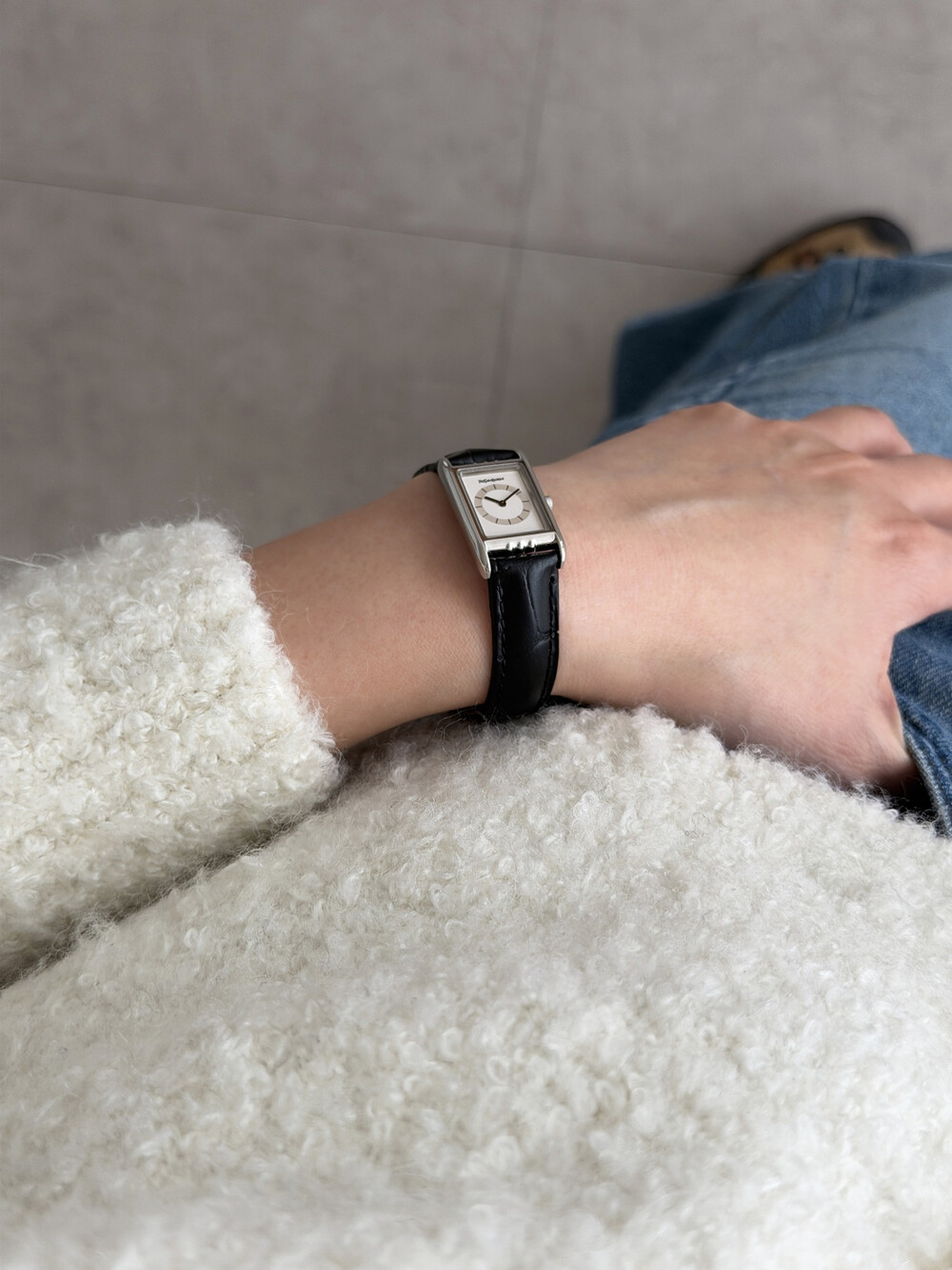 부드러운 곡선의 스퀘어 케이스와 화이트 다이얼 위를 장식하는 생로랑 로고가 매력적인 시계입니다.