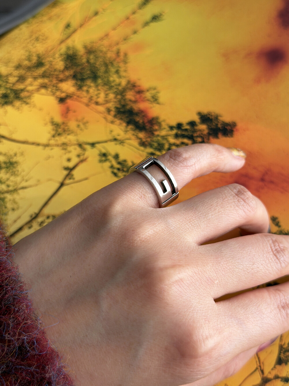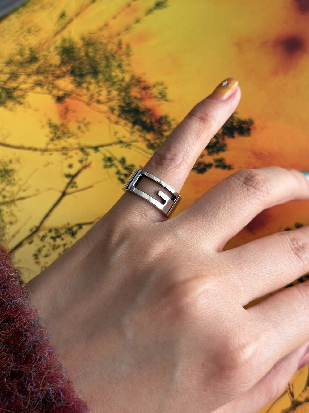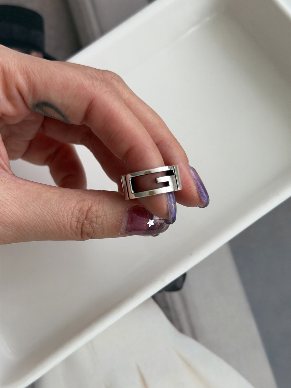 이 빈티지 구찌 반지는, 스털링 실버(Silver 925)로 제작되었습니다. 은은하게 번지는 실버의 광택이 과하지 않게 빛을 머금어, 데일리 착용에서도 자연스럽게 분위기를 만들어주는 모델입니다.