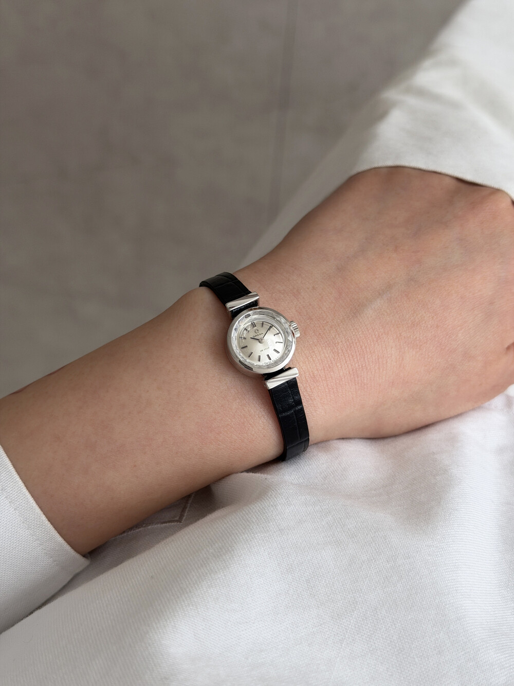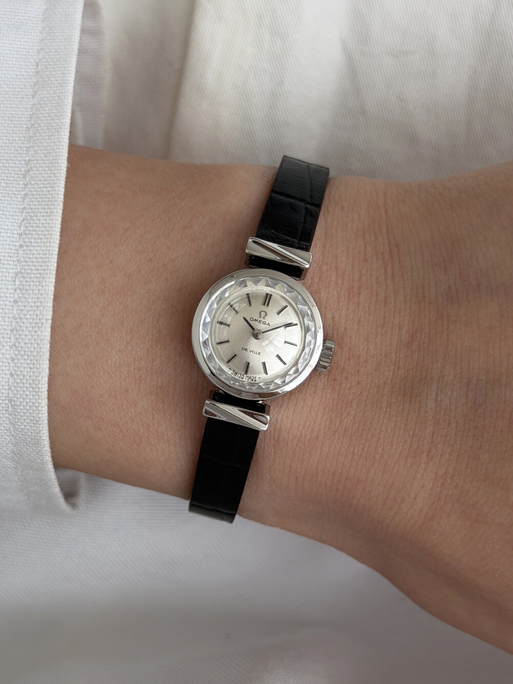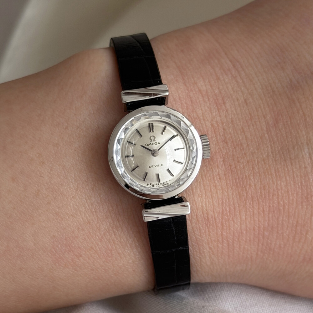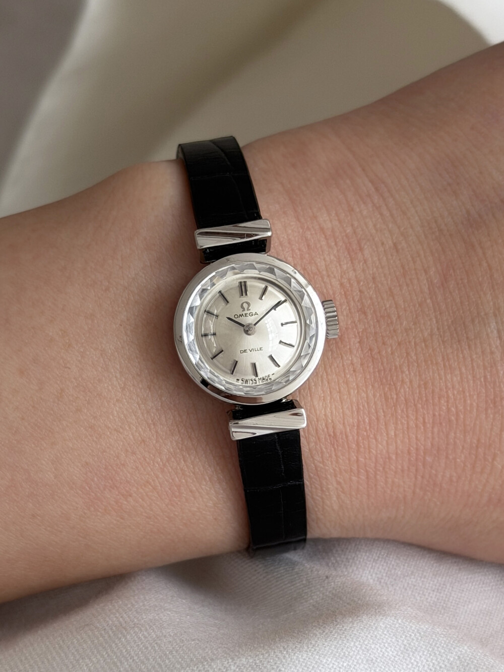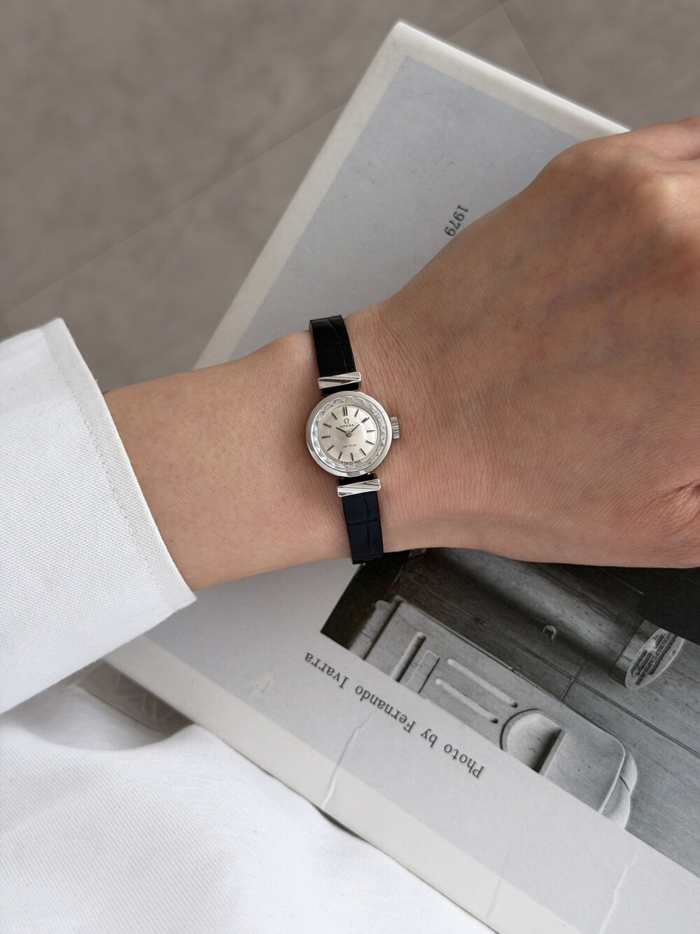 1969년도에 제작된 오메가 드빌 모델로 실버 다이얼 위를 장식하는