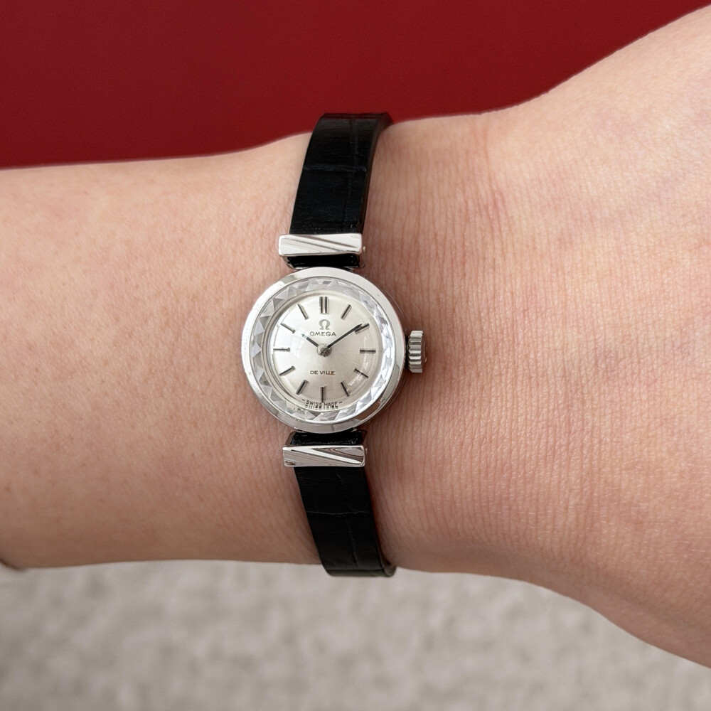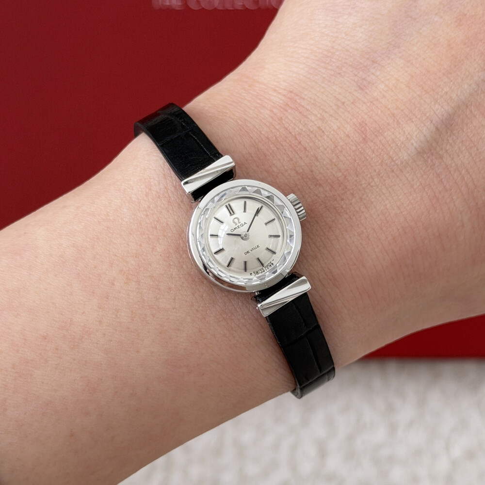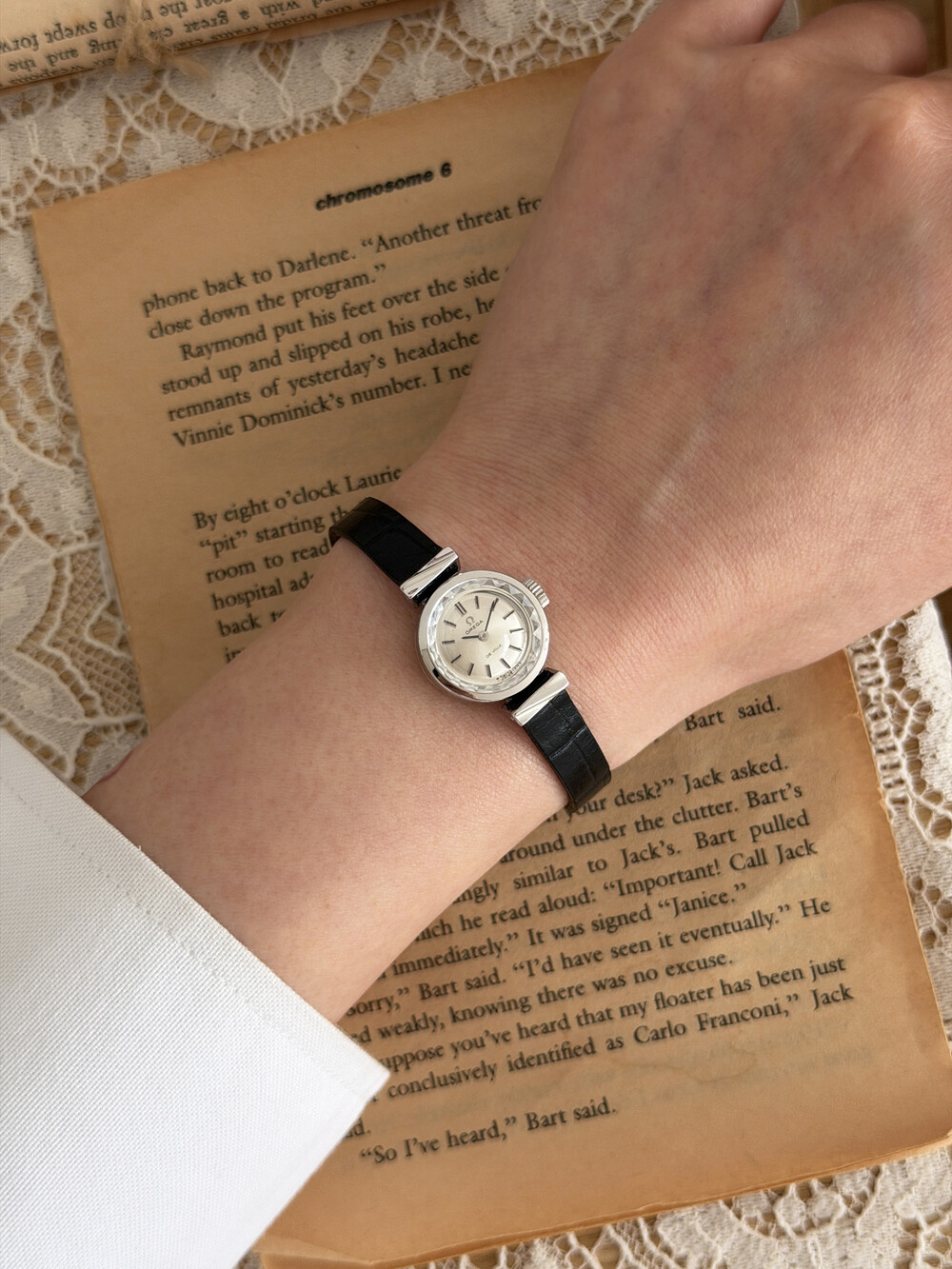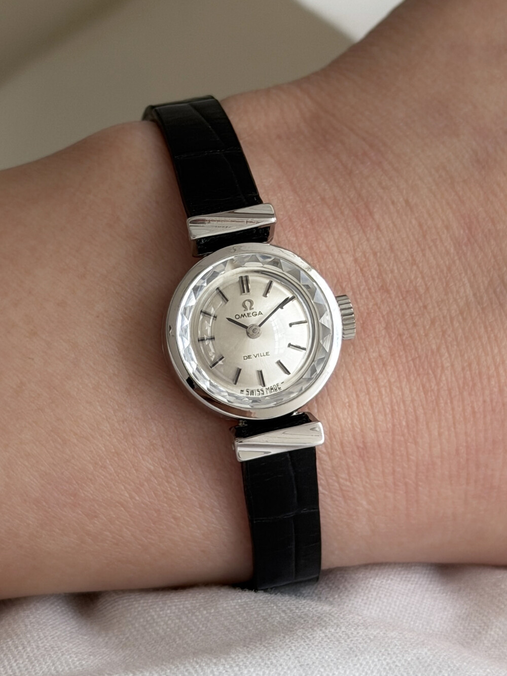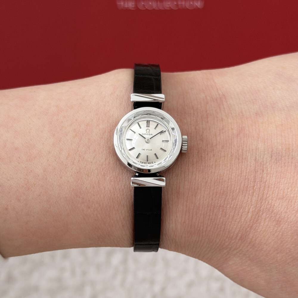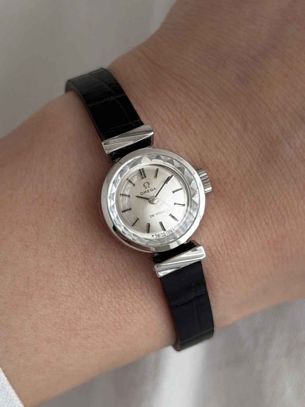 1969년도에 제작된 오메가 드빌 모델로 실버 다이얼 위를 장식하는
