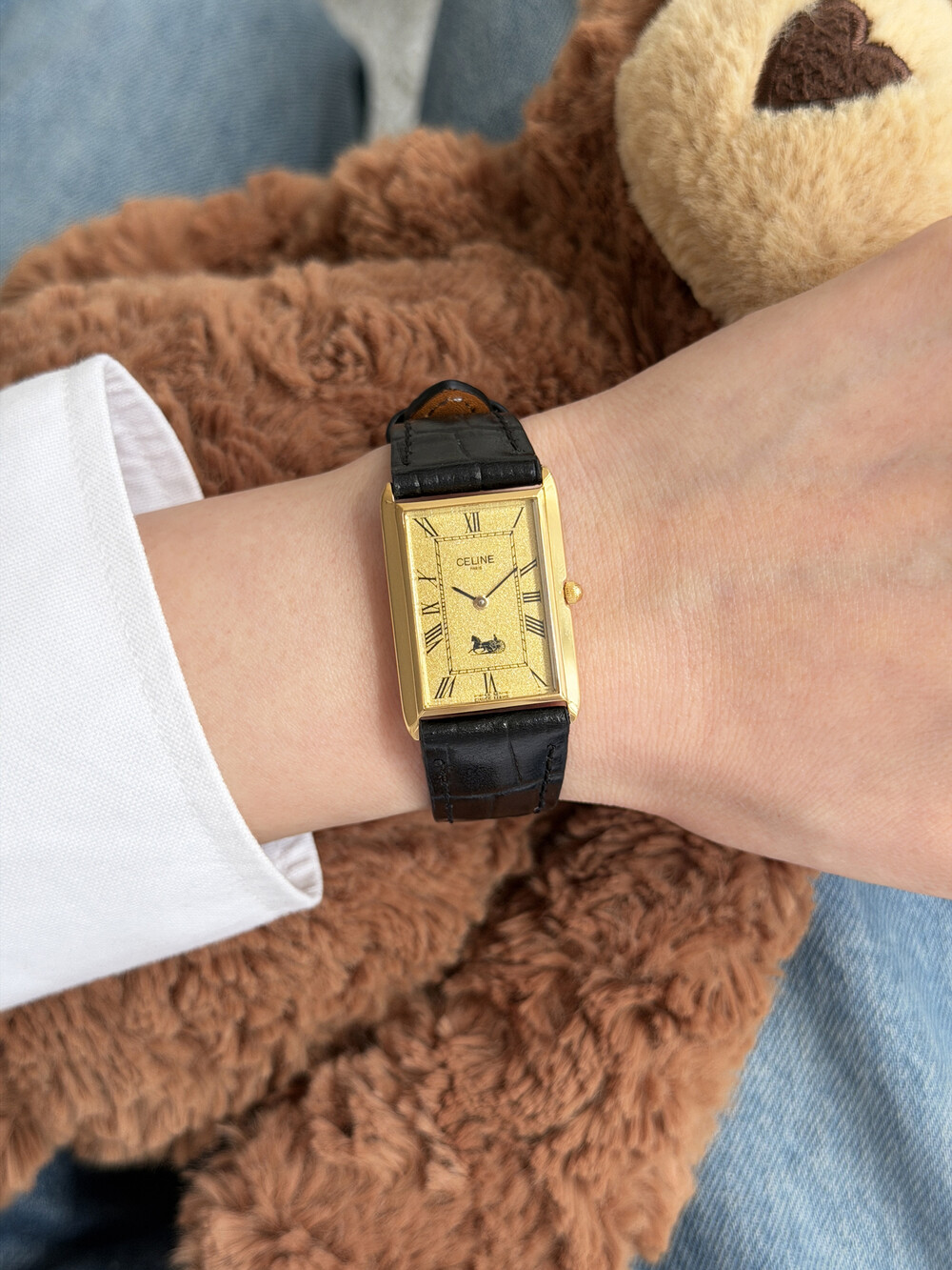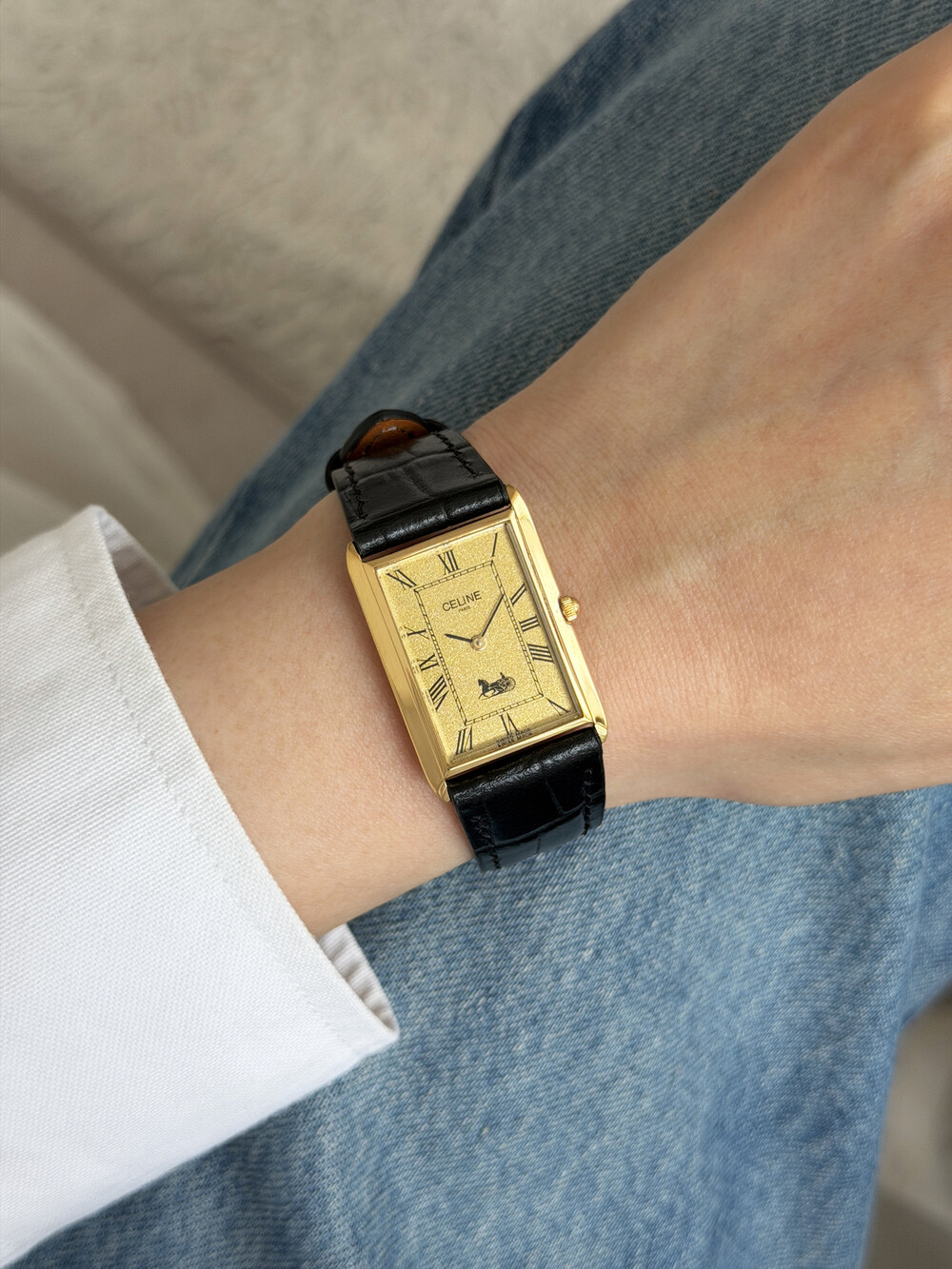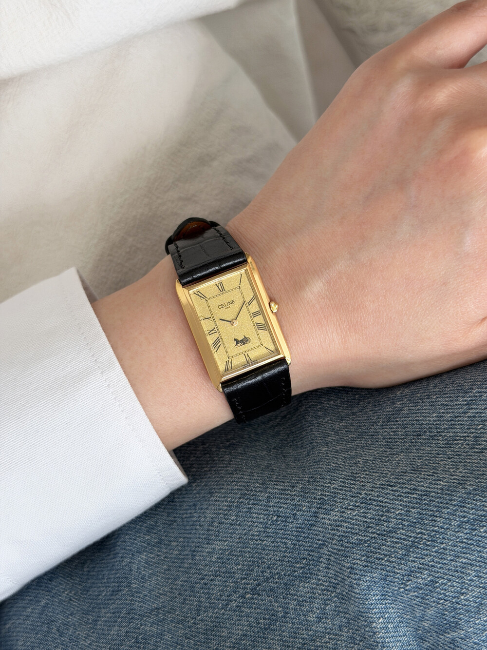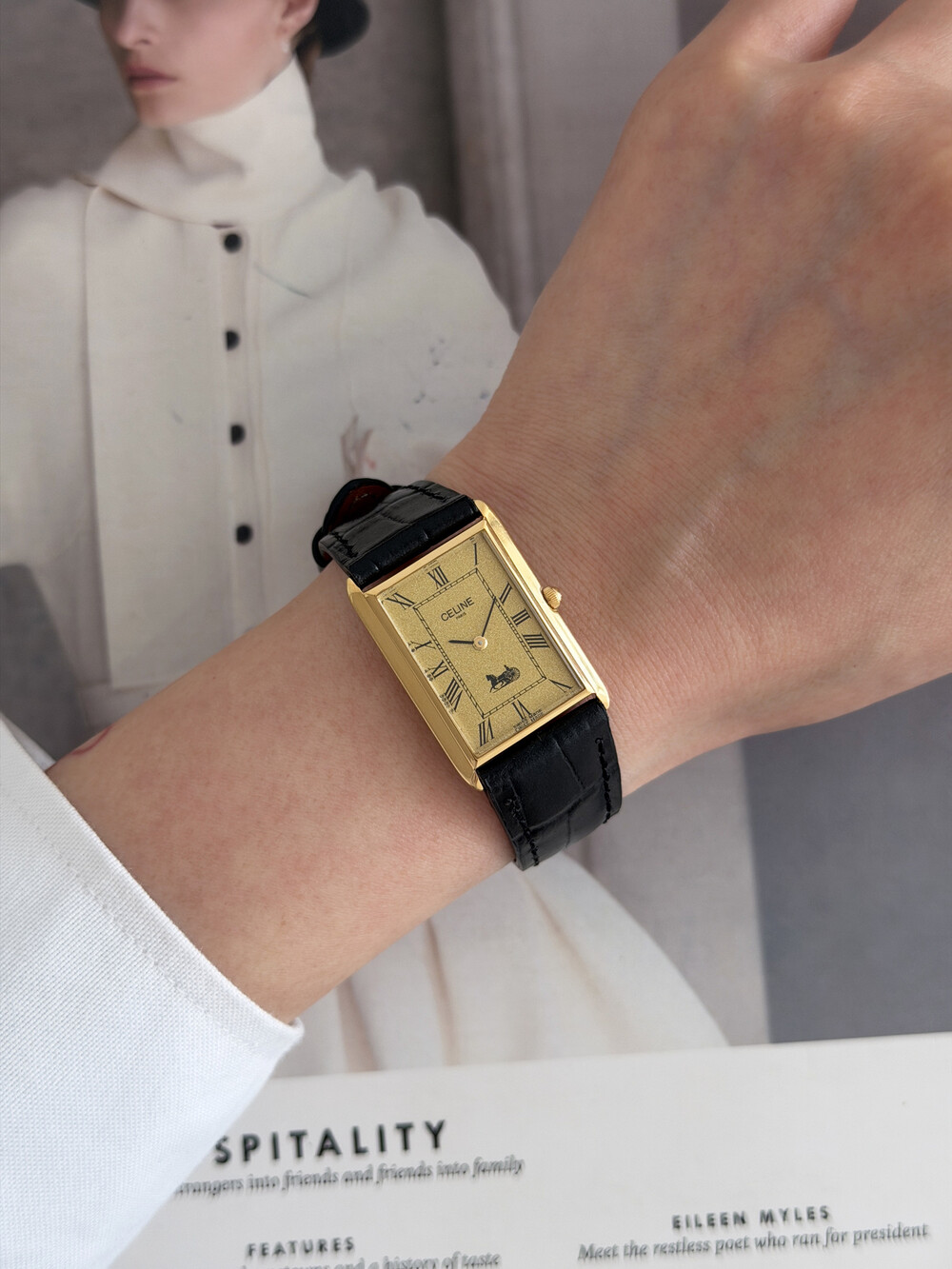 부드러운 골드 톤 케이스와 다이얼 위를 장식하는 셀린느 시그니처 마차 심볼이 매력적인 모델입니다.