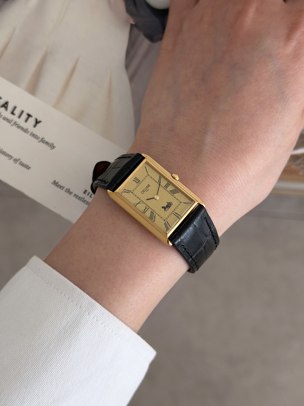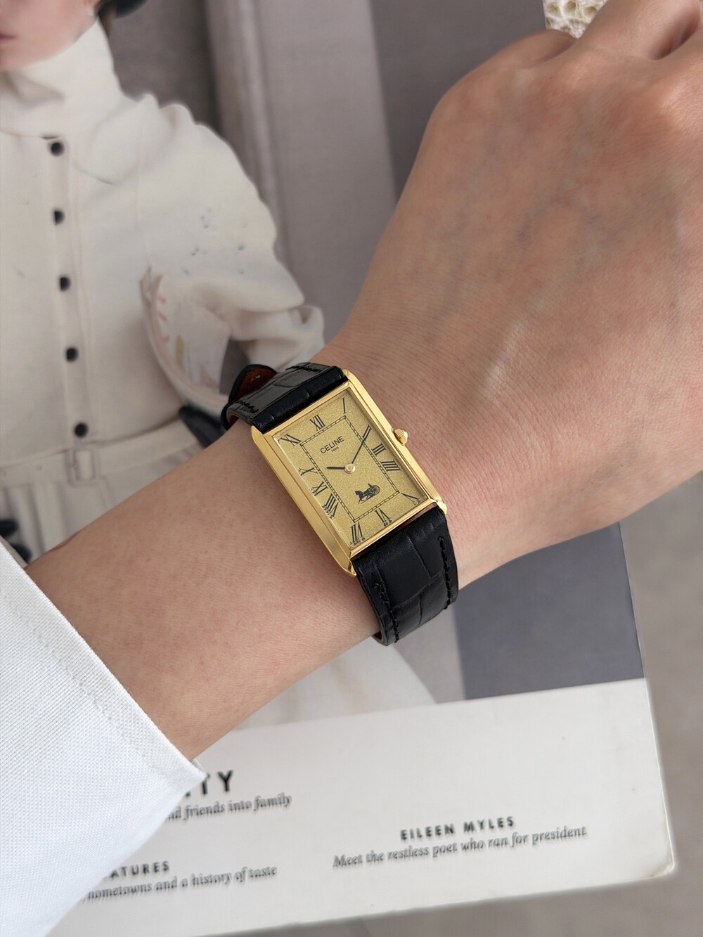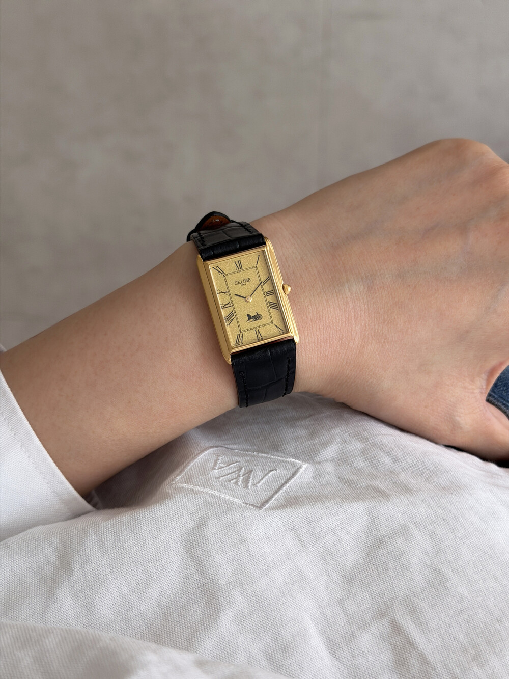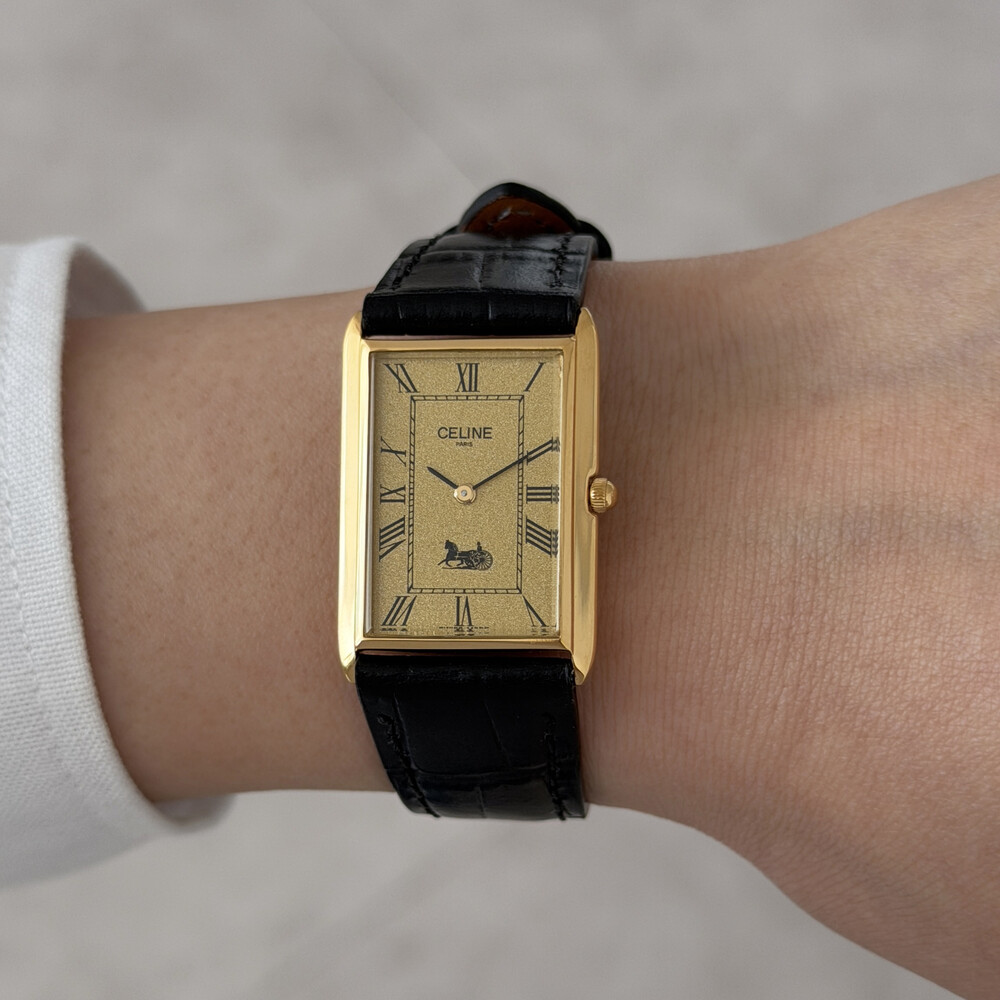 부드러운 골드 톤 케이스와 다이얼 위를 장식하는 셀린느 시그니처 마차 심볼이 매력적인 모델입니다.