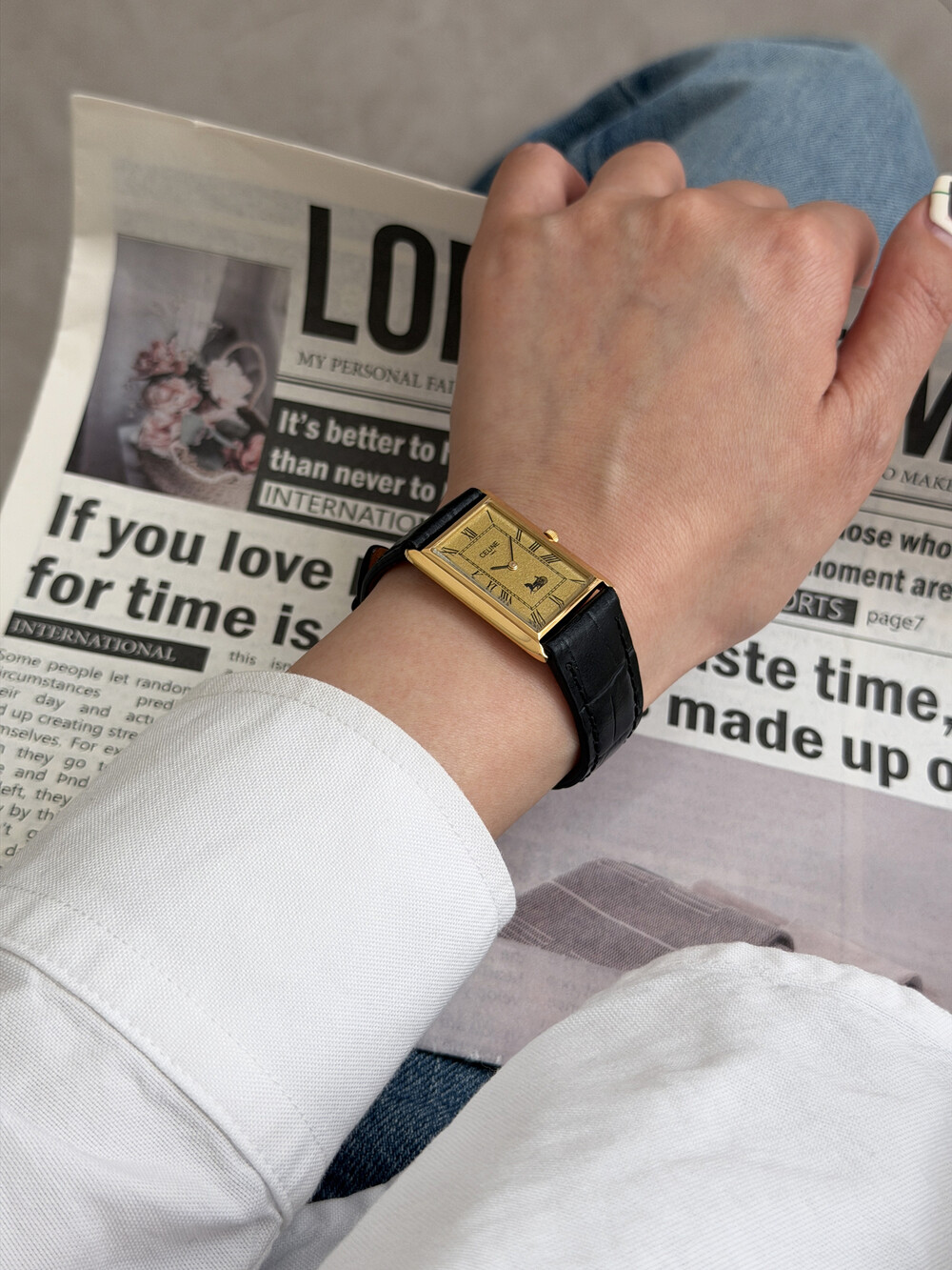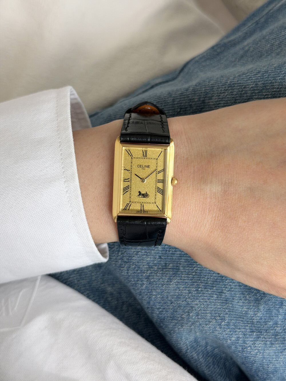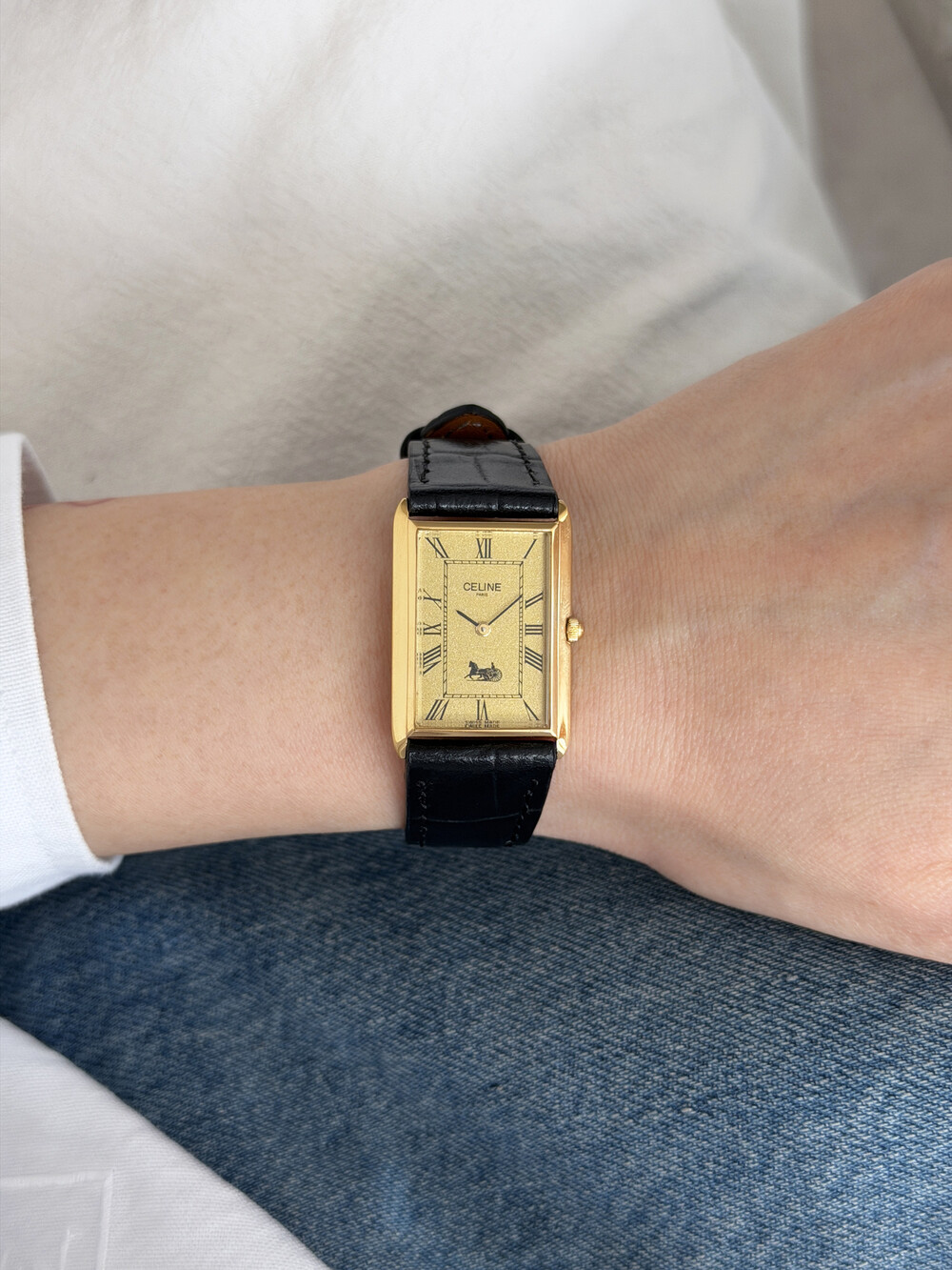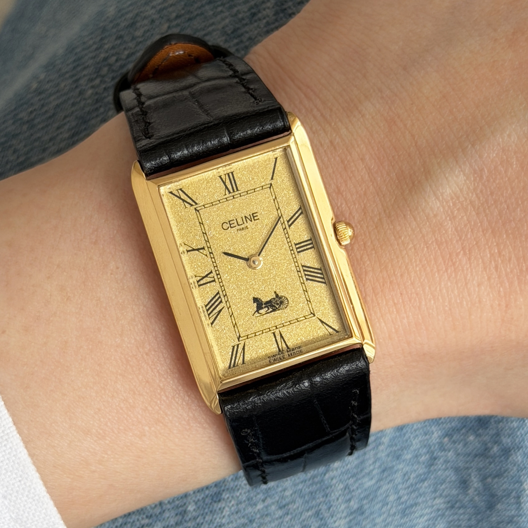 부드러운 골드 톤 케이스와 다이얼 위를 장식하는 셀린느 시그니처 마차 심볼이 매력적인 모델입니다.
