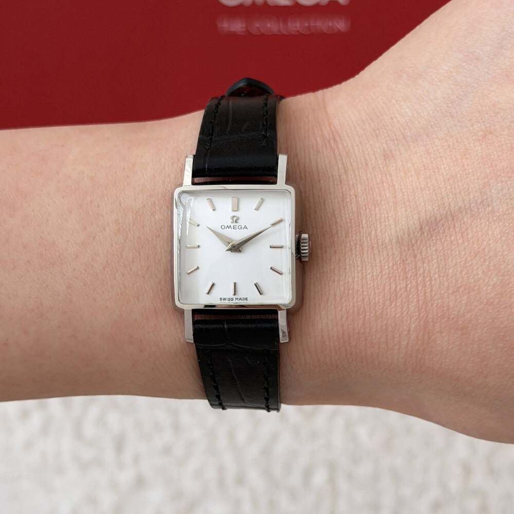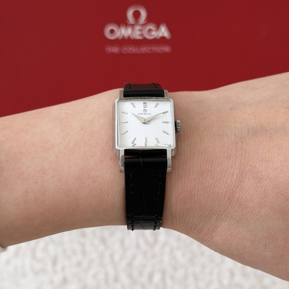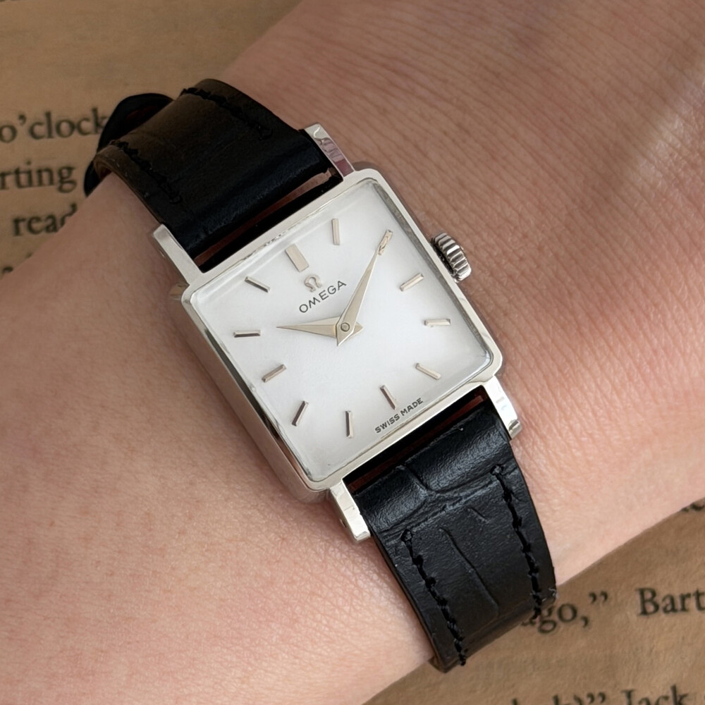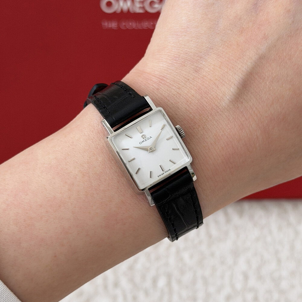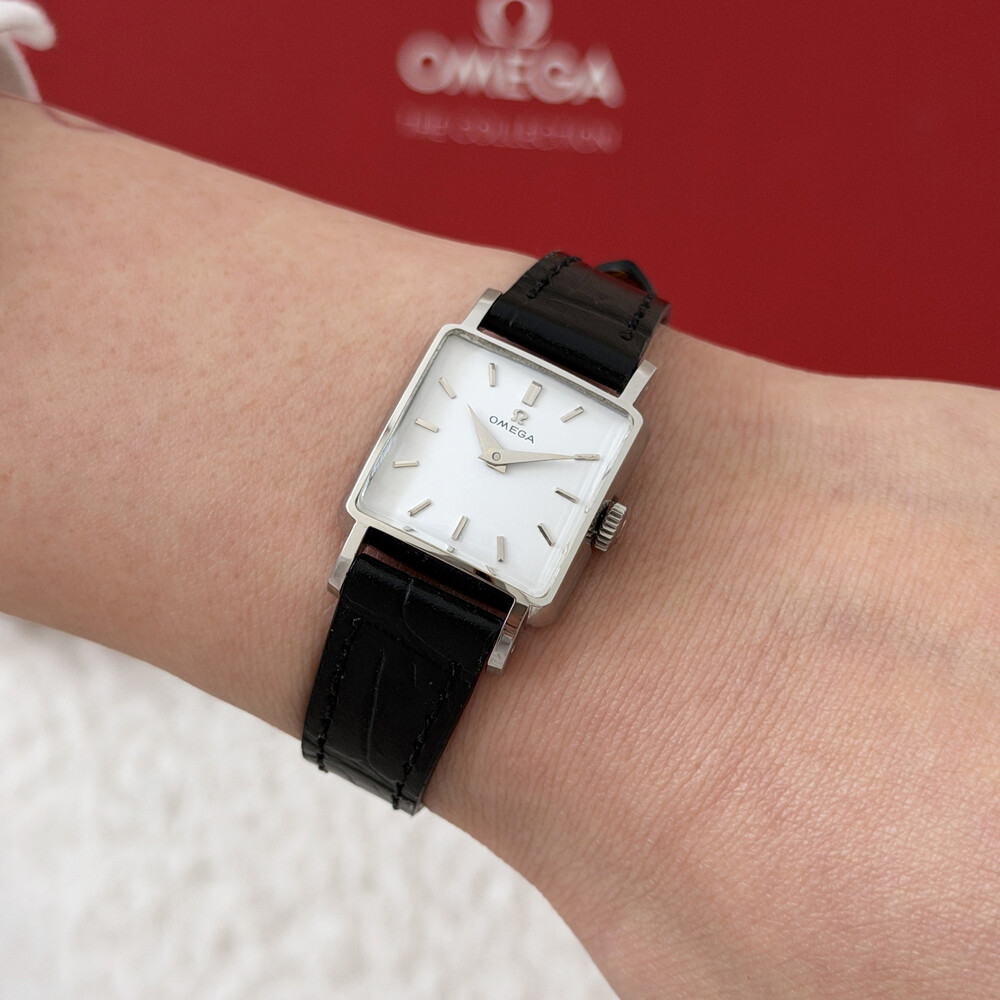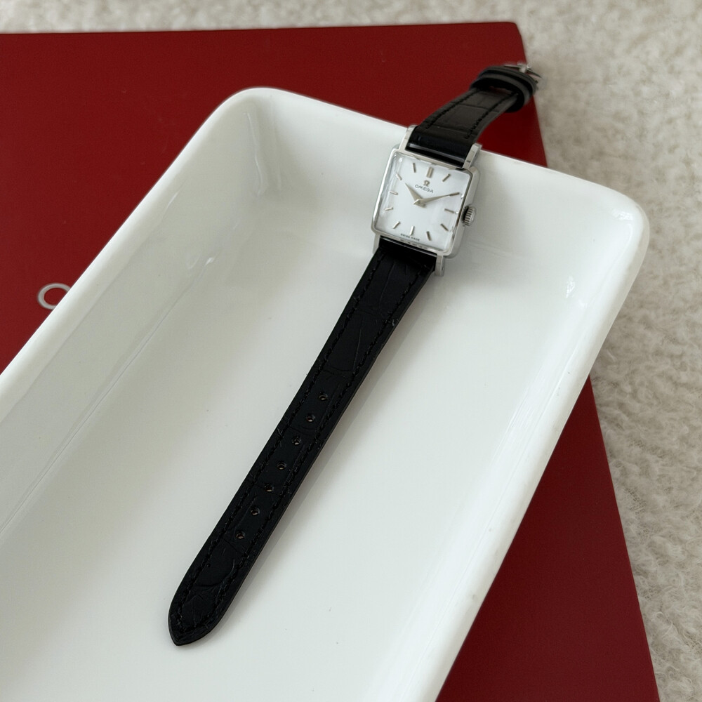 1959년도에 제작된 오메가 드빌 모델로 깔끔한 화이트 다이얼 위를 장식하는