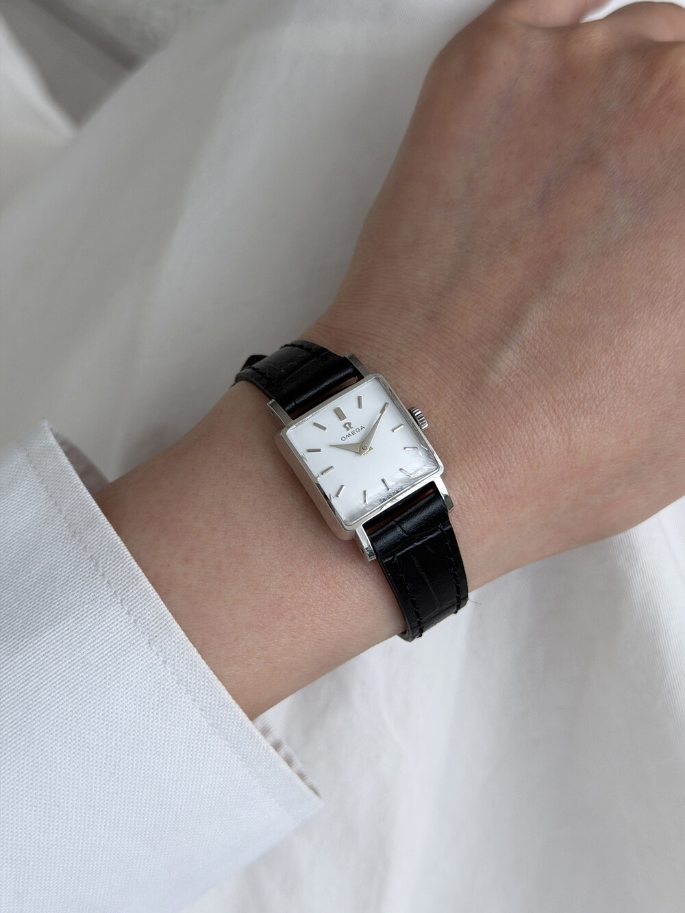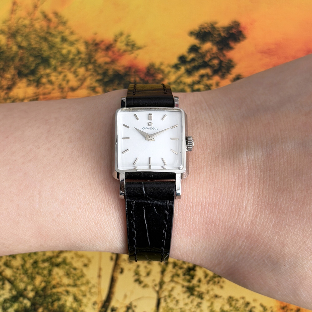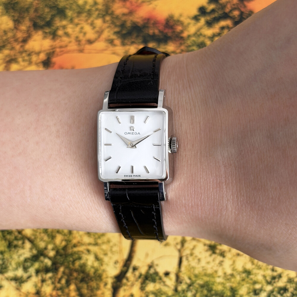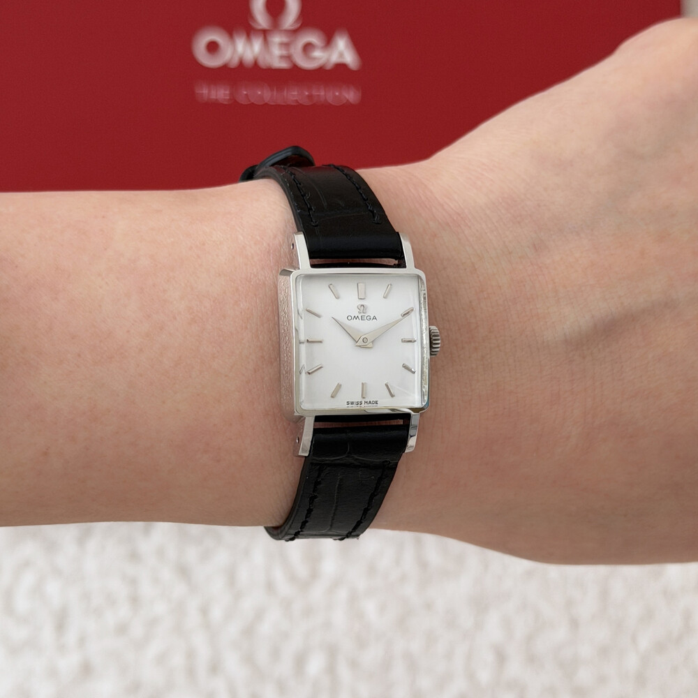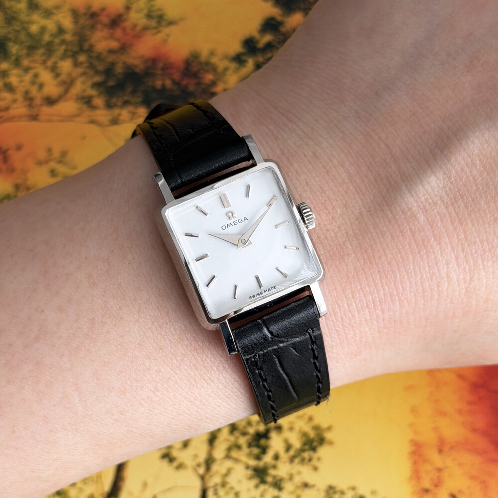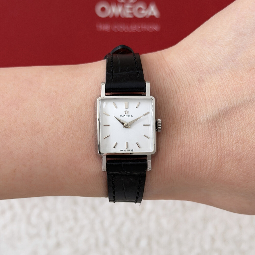 1959년도에 제작된 오메가 드빌 모델로 깔끔한 화이트 다이얼 위를 장식하는