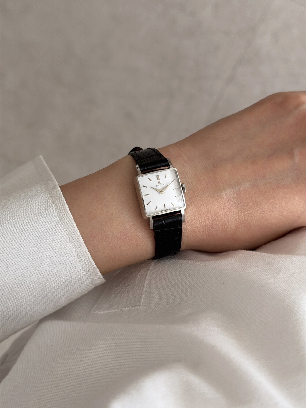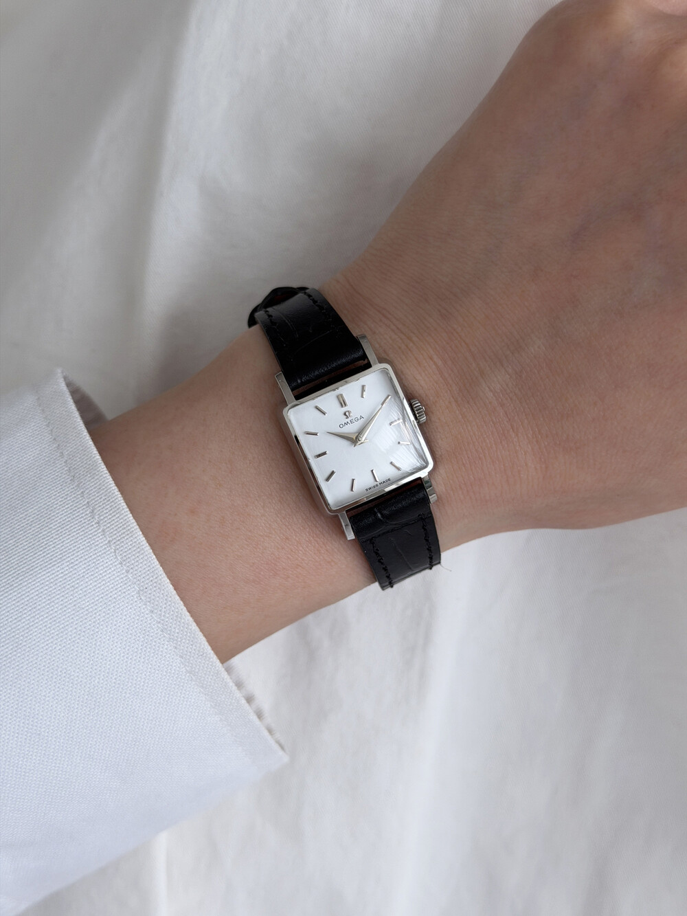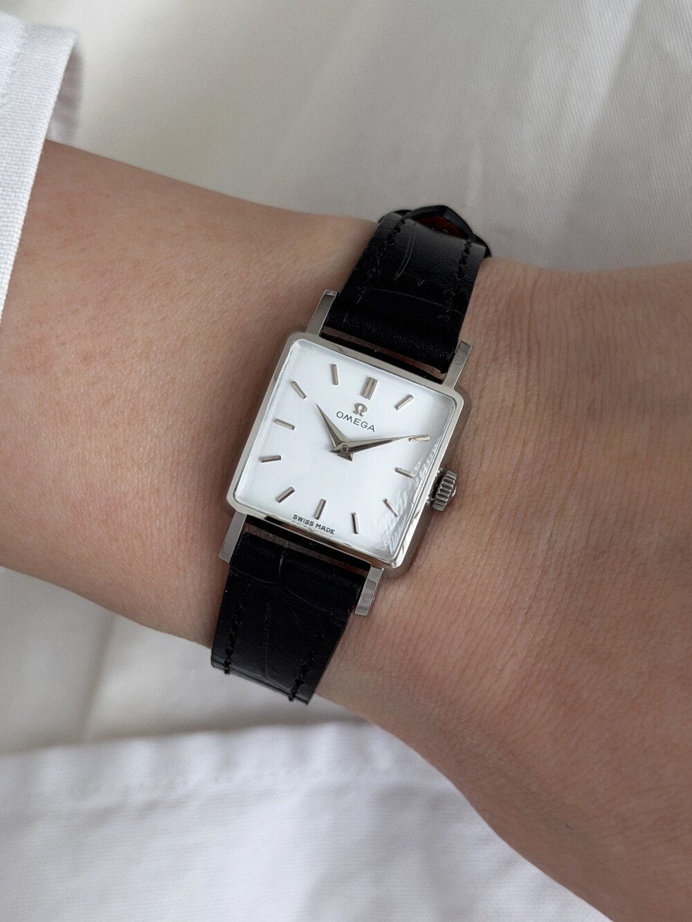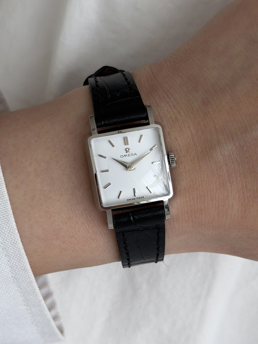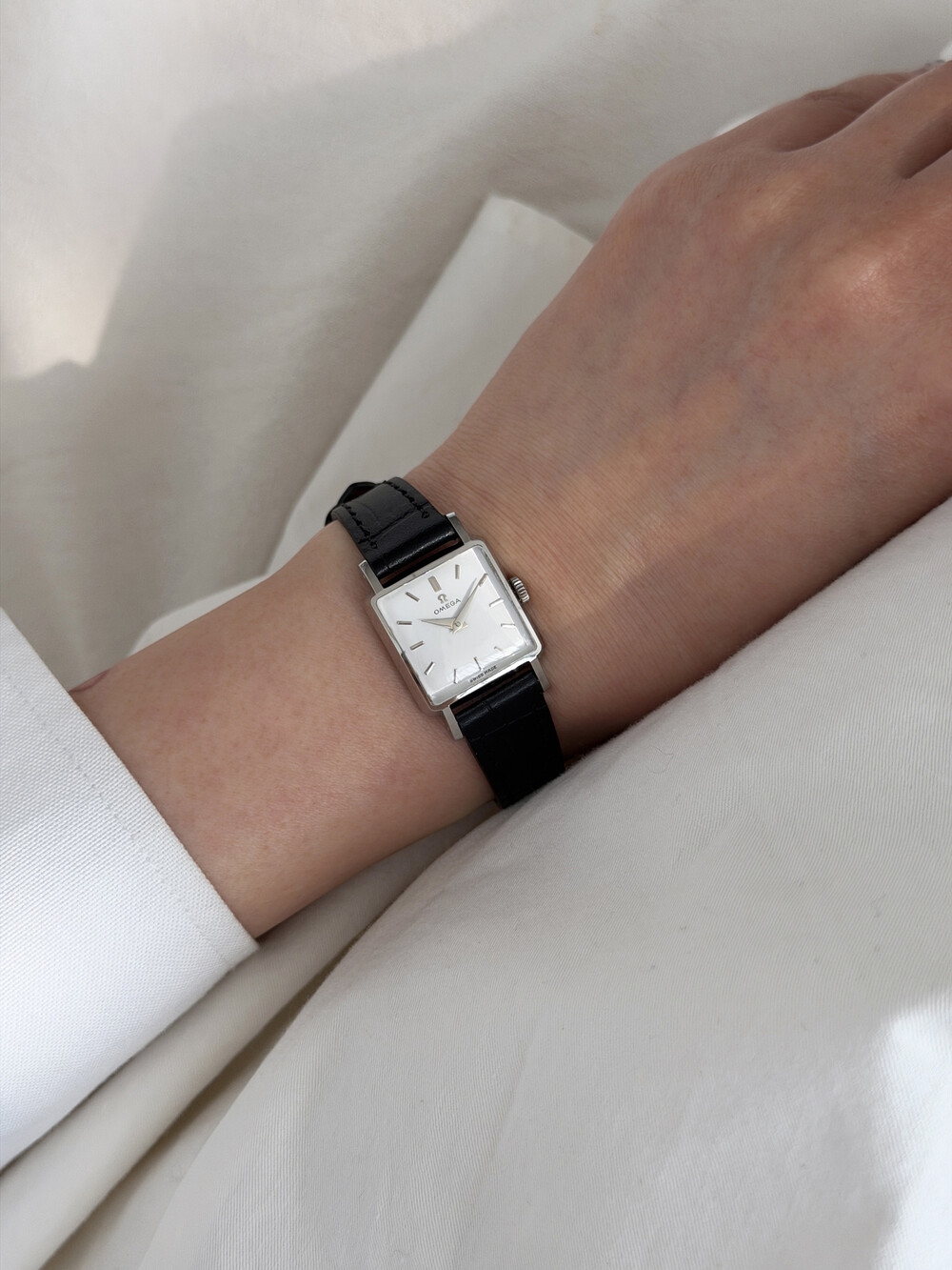 1959년도에 제작된 오메가 드빌 모델로 깔끔한 화이트 다이얼 위를 장식하는