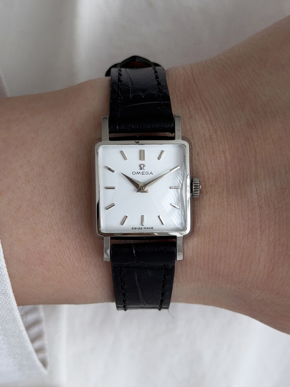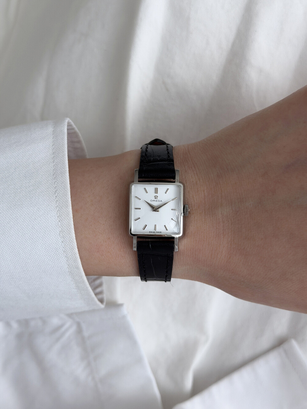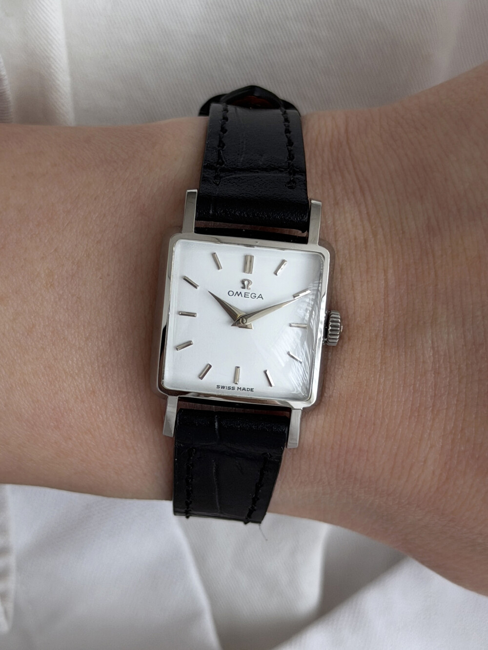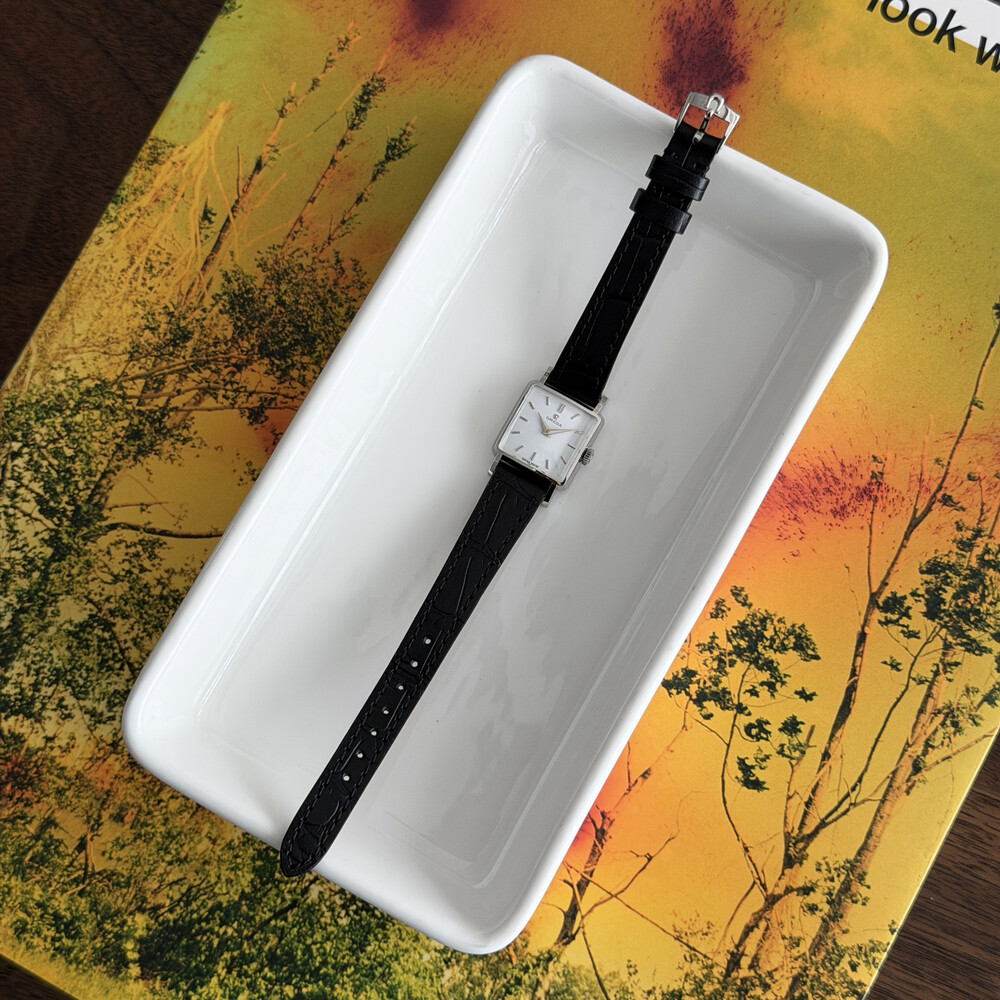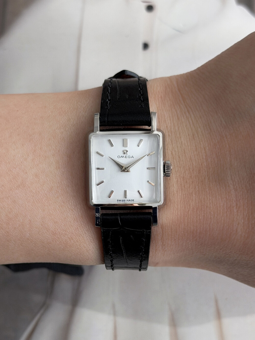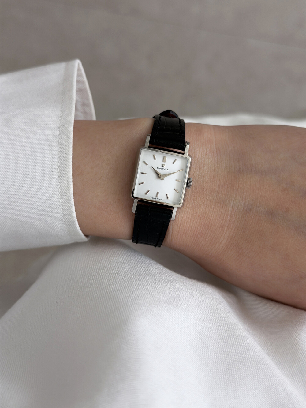 1959년도에 제작된 오메가 드빌 모델로 깔끔한 화이트 다이얼 위를 장식하는
