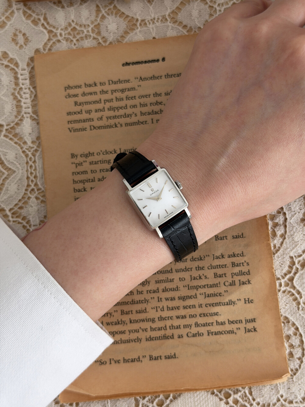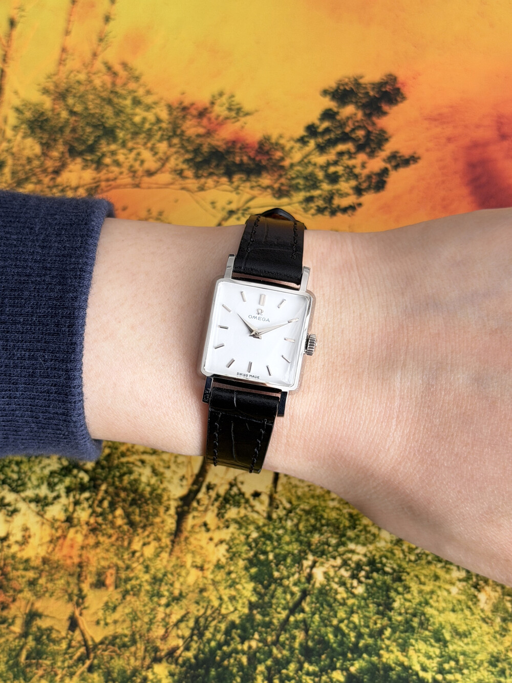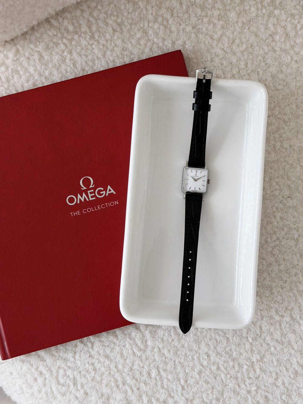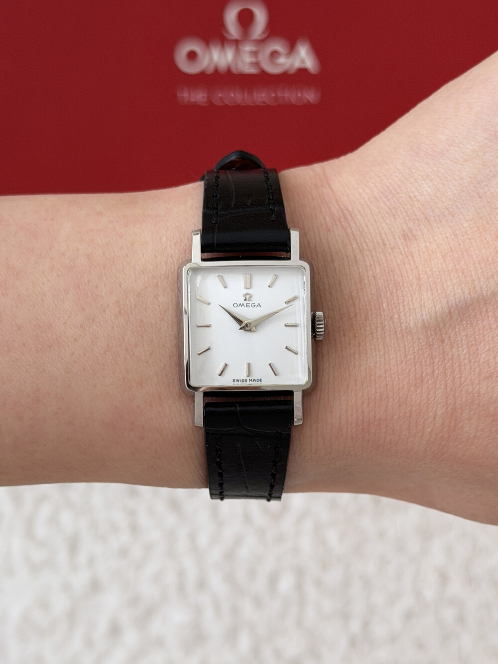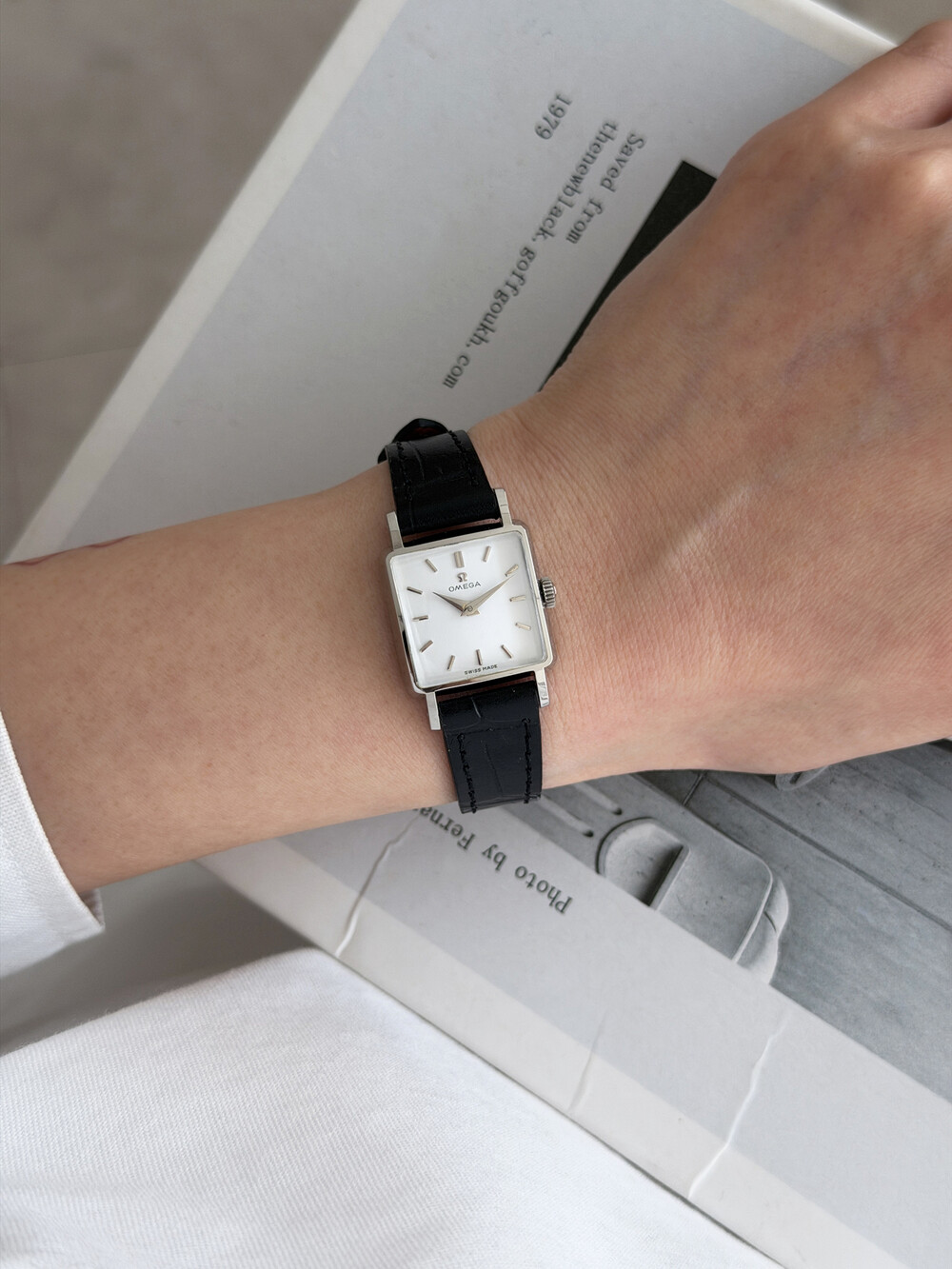1959년도에 제작된 오메가 드빌 모델로 깔끔한 화이트 다이얼 위를 장식하는