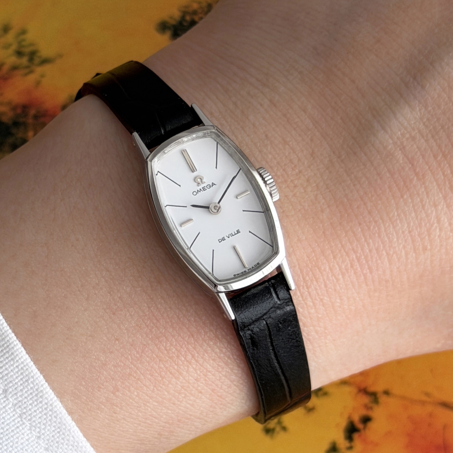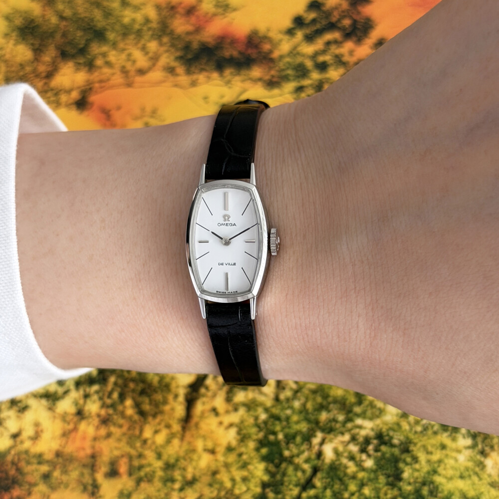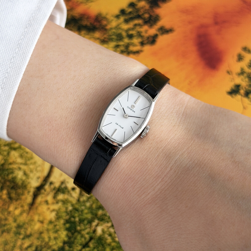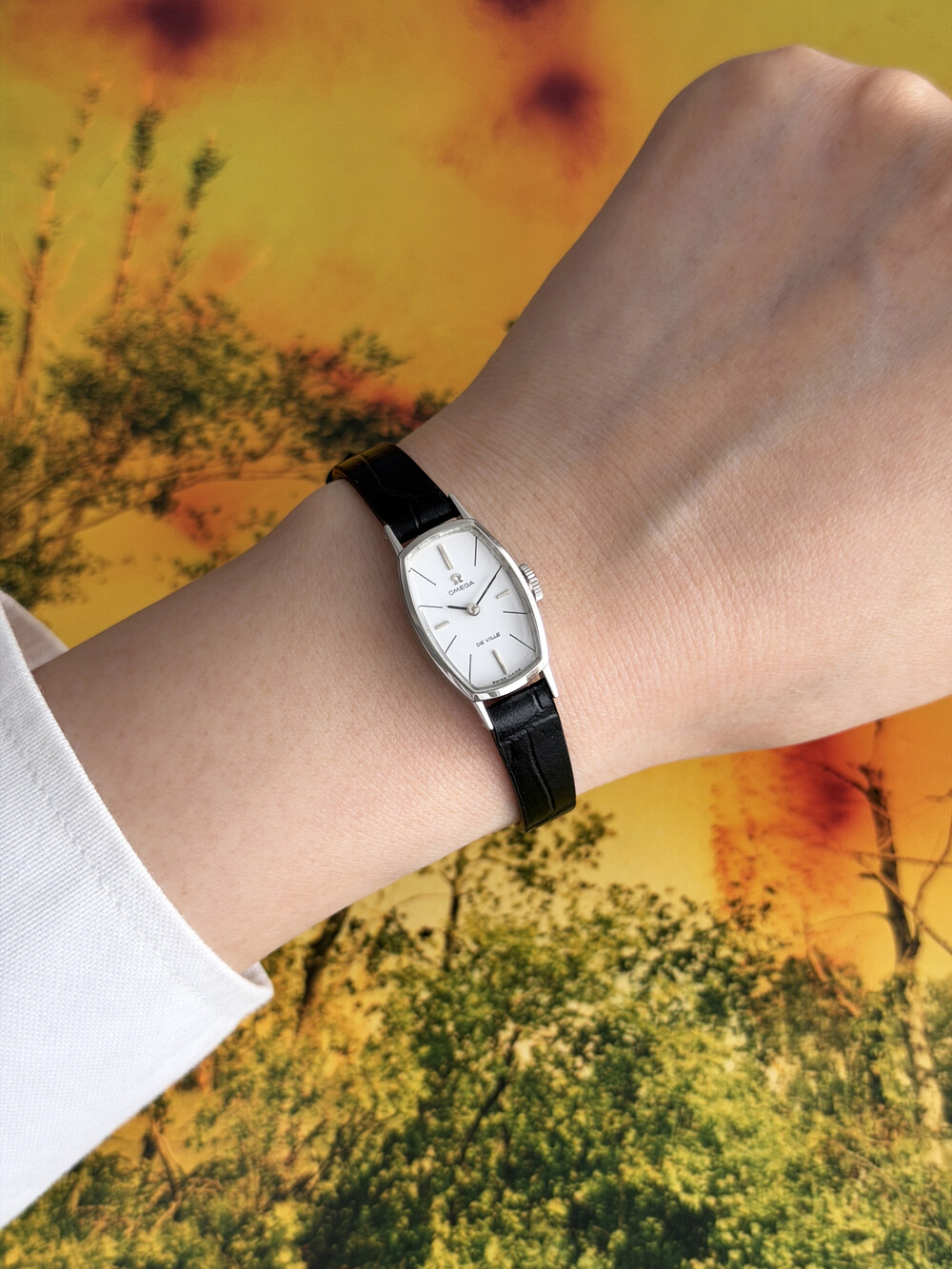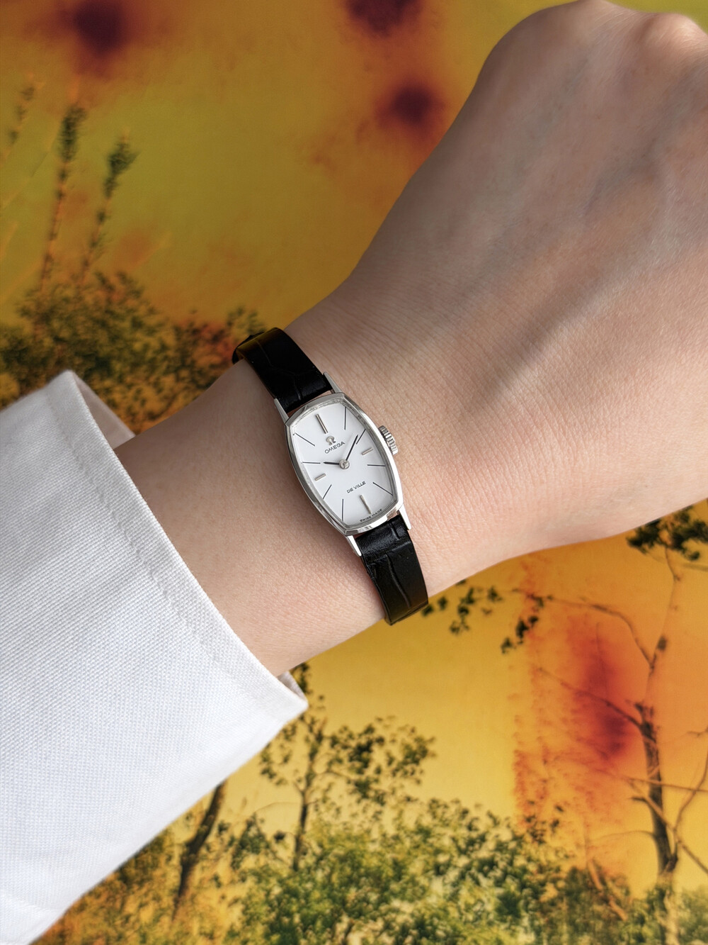 1971년도에 제작된 오메가 드빌 모델로 깔끔한 화이트 다이얼 위를 장식하는