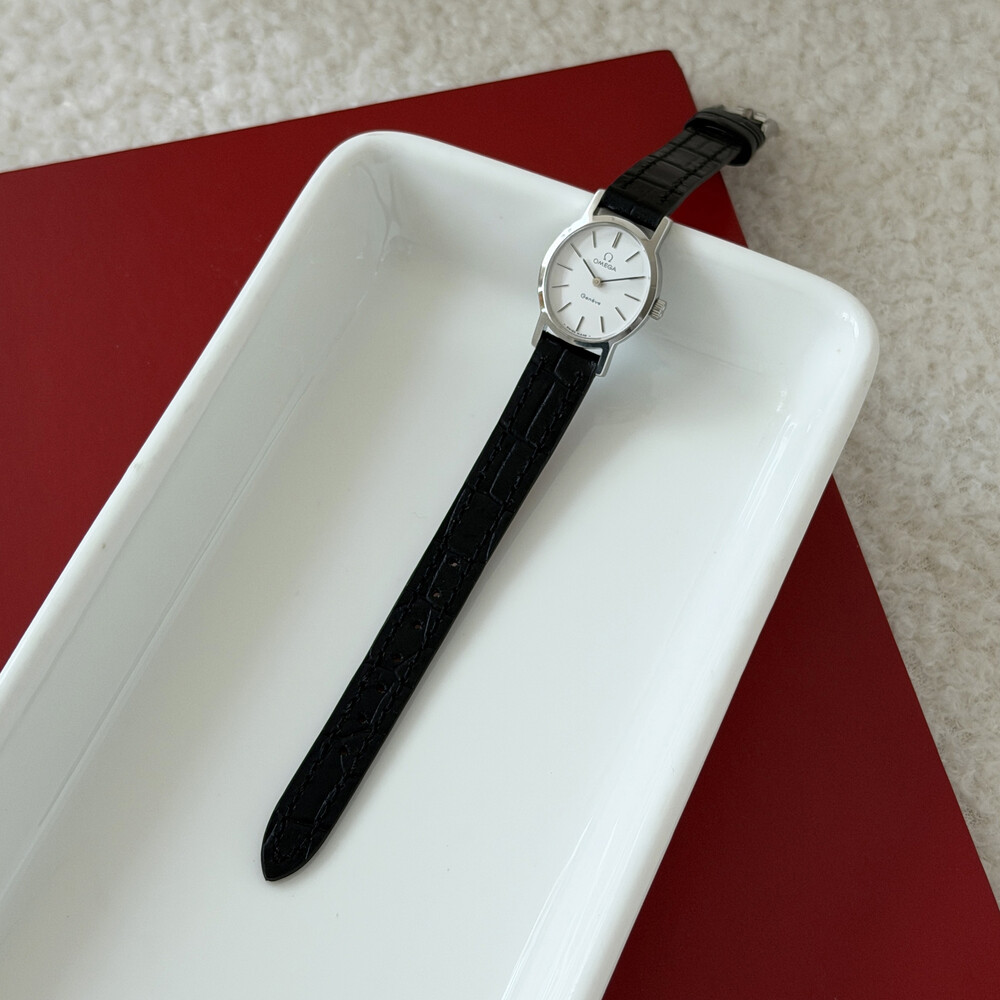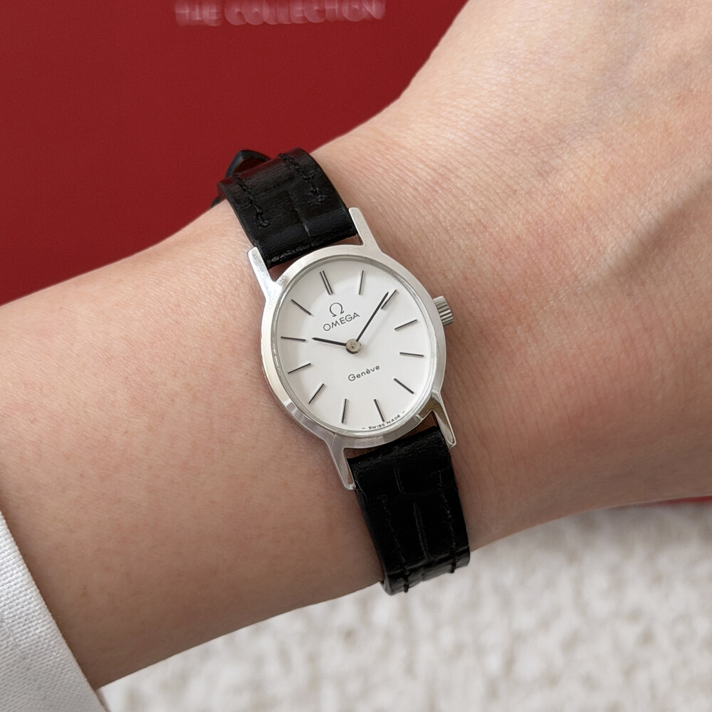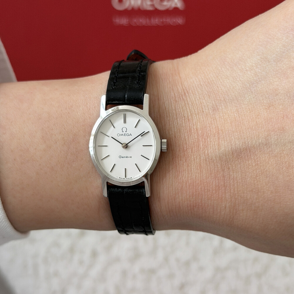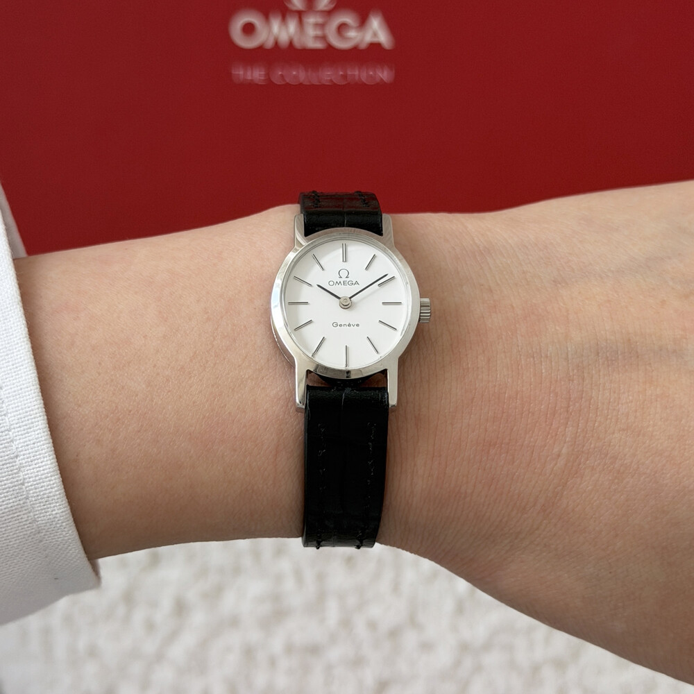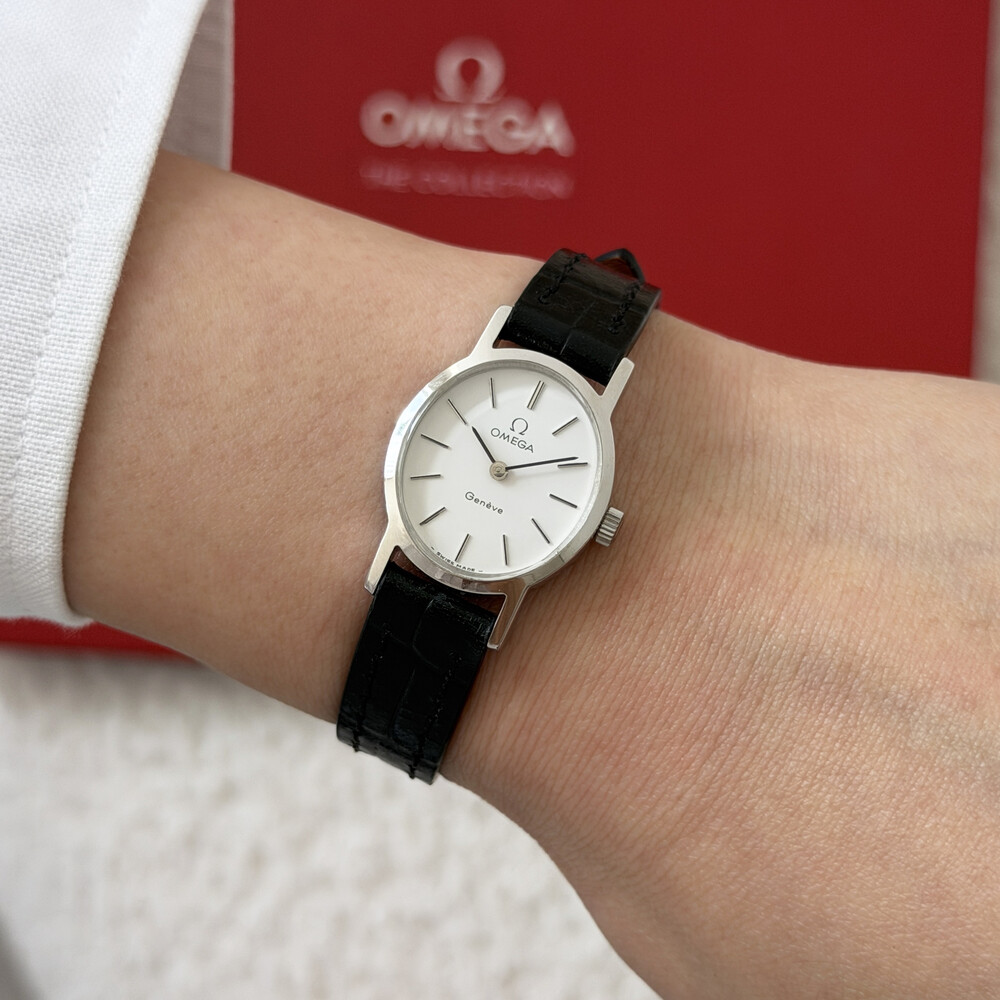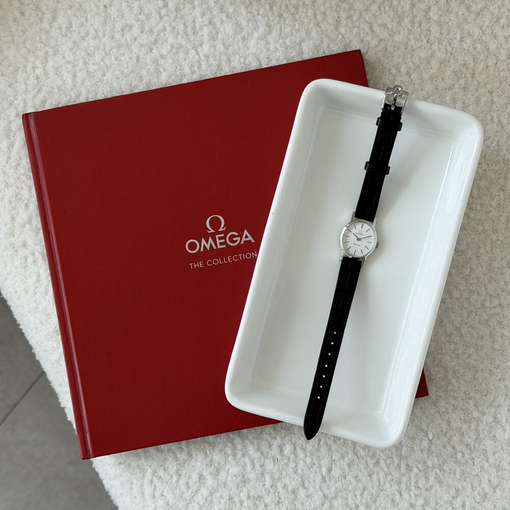 1974년도에 제작된 오메가 드빌 모델로 깔끔한 화이트 다이얼 위를 장식하는