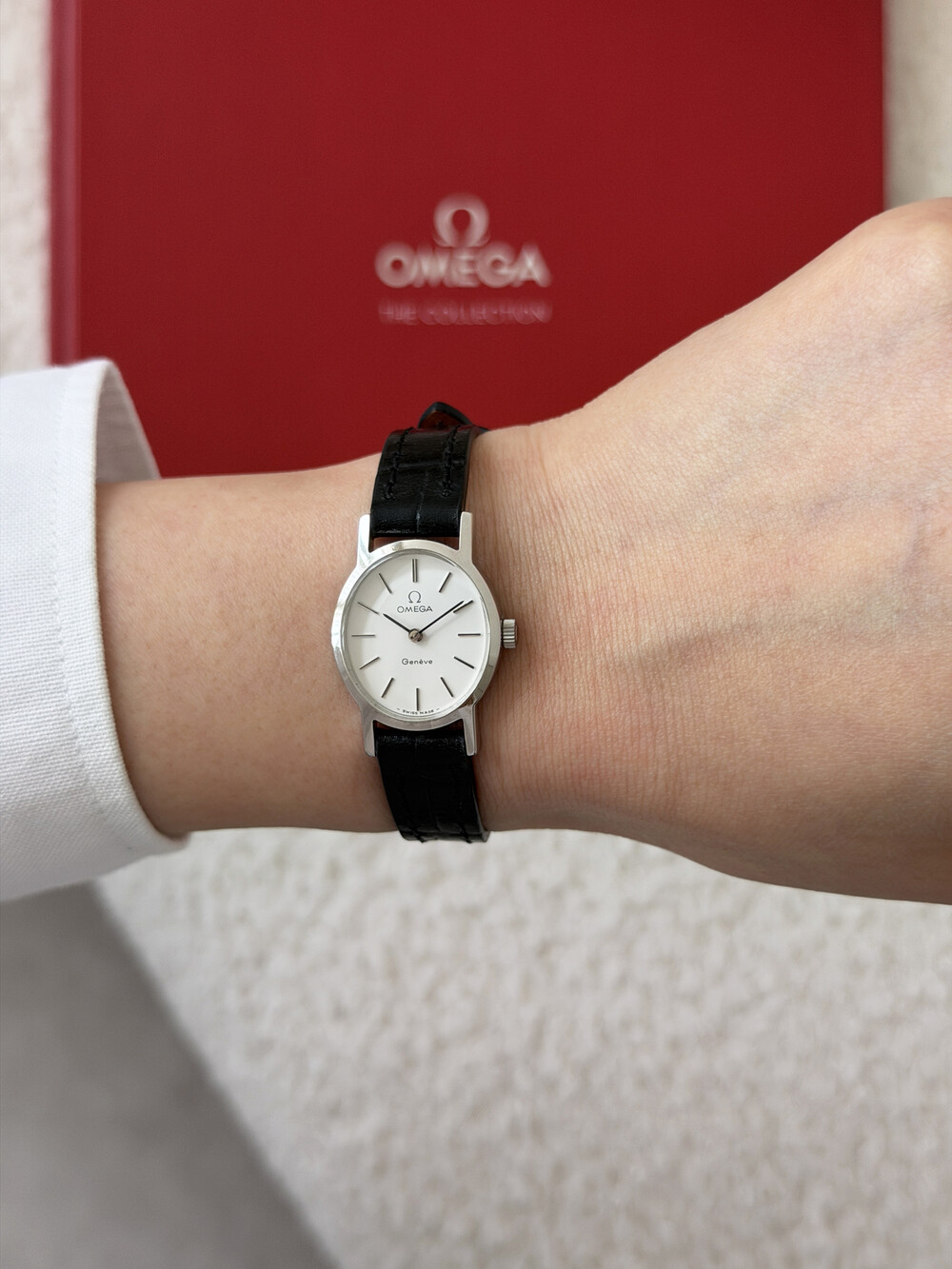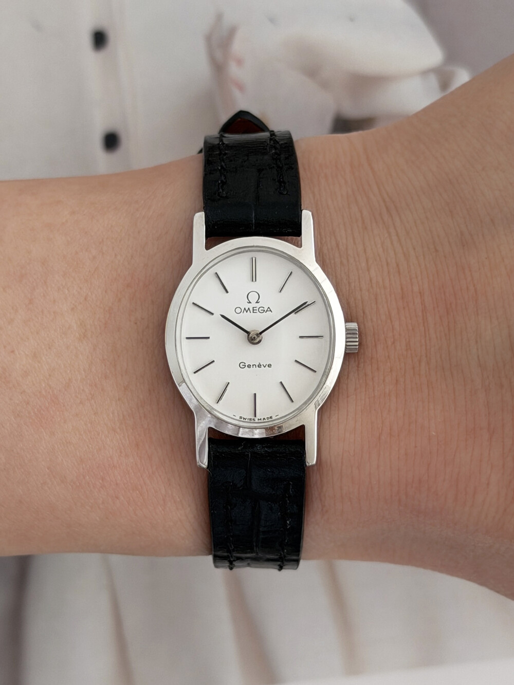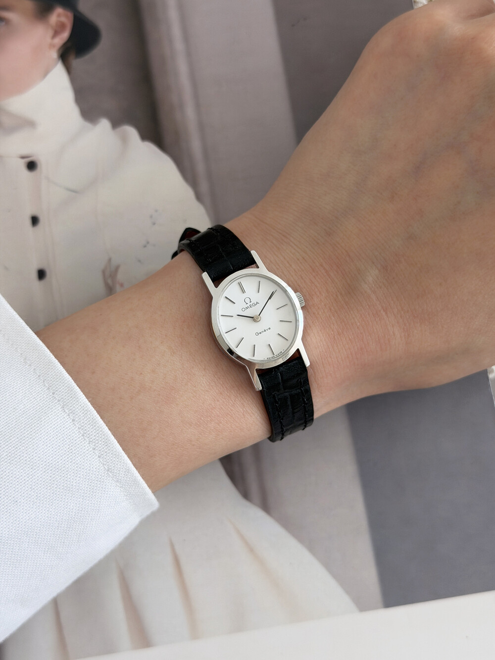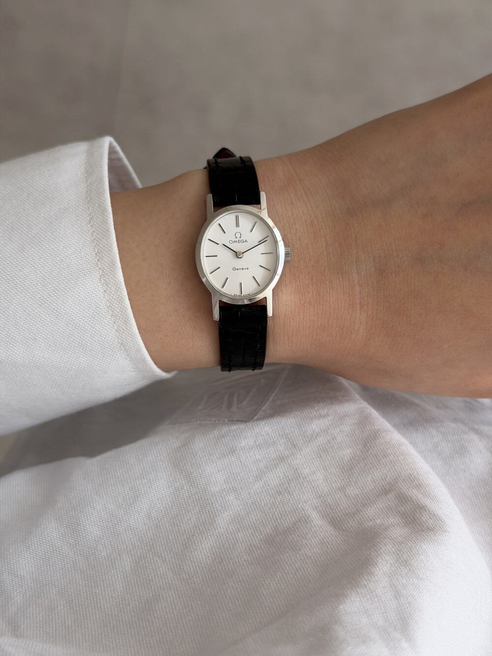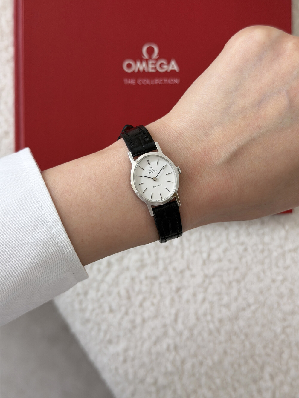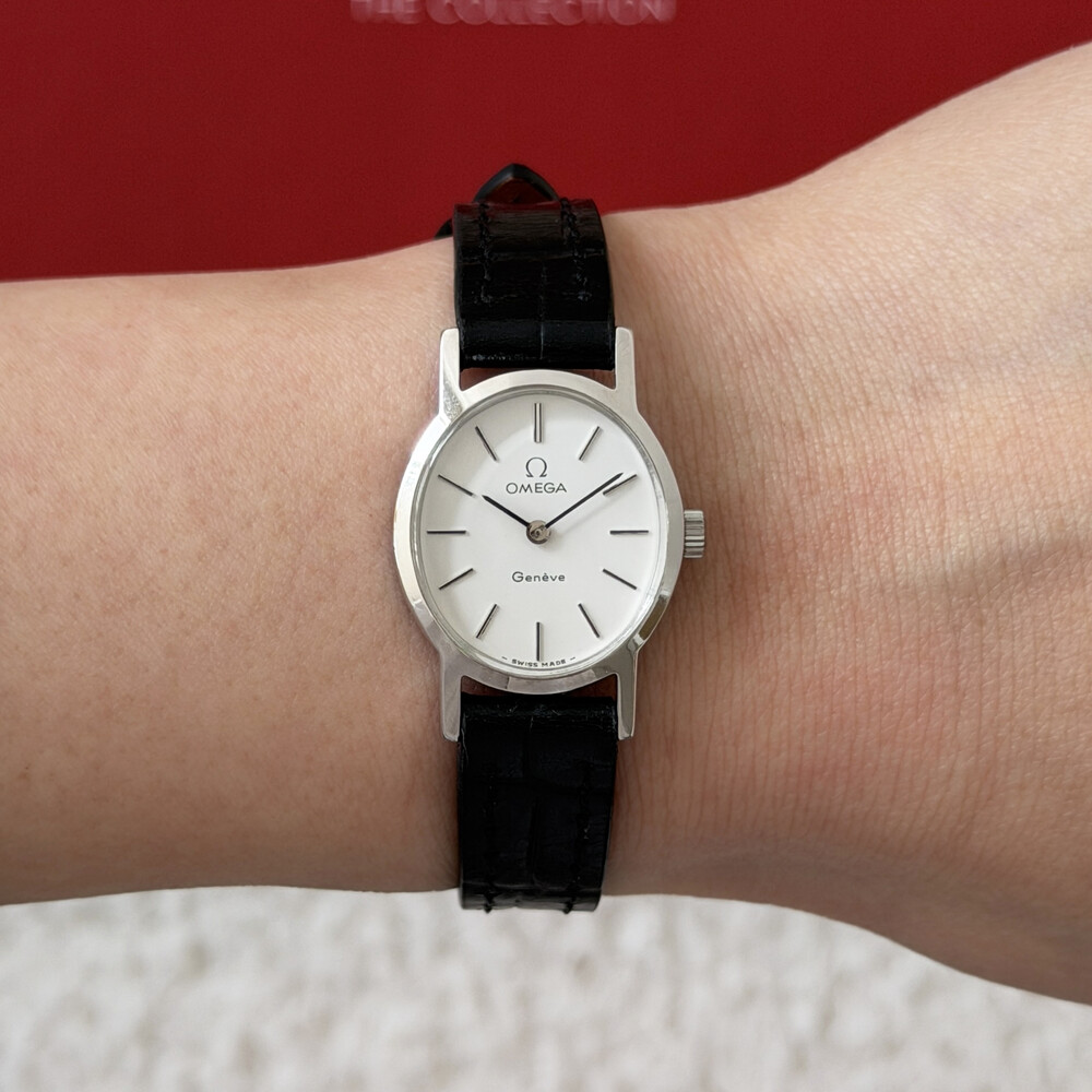 1974년도에 제작된 오메가 드빌 모델로 깔끔한 화이트 다이얼 위를 장식하는