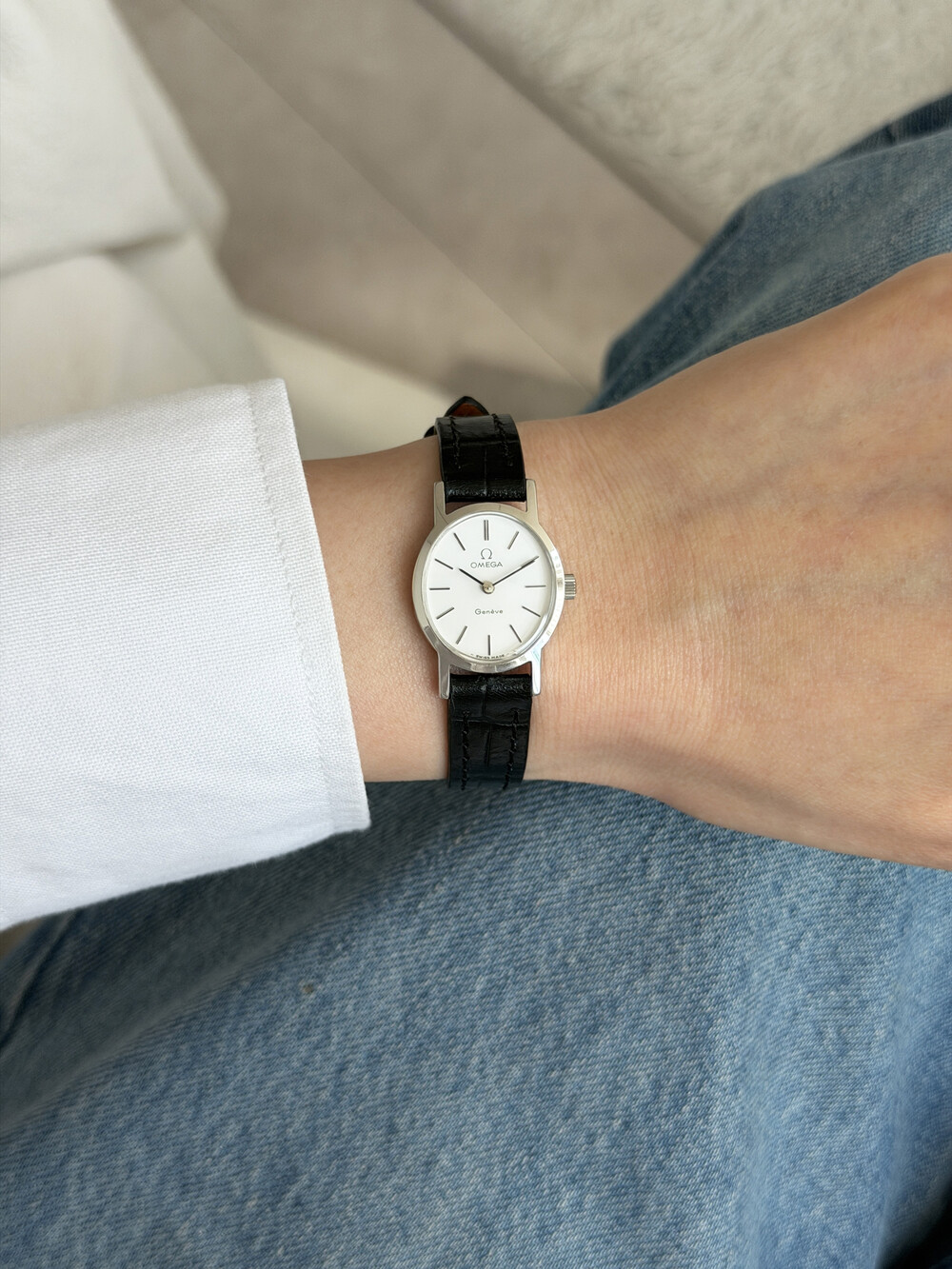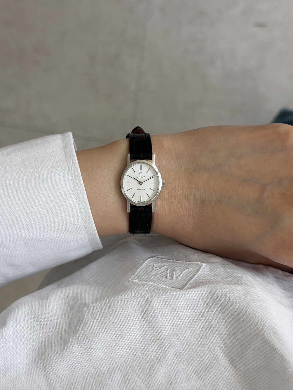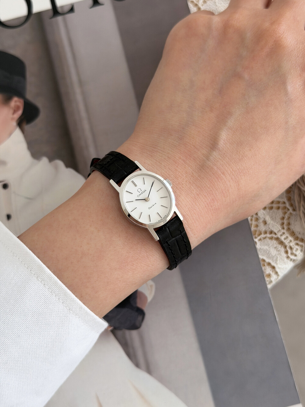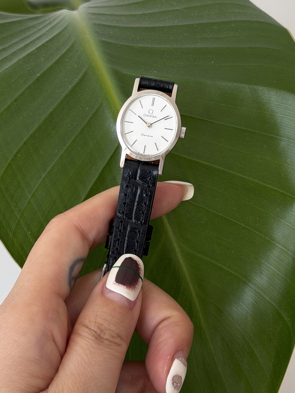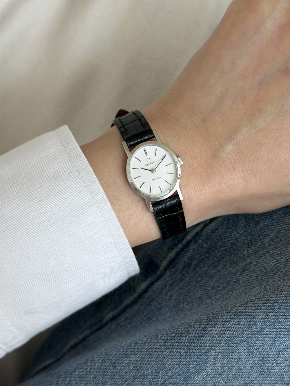 1974년도에 제작된 오메가 드빌 모델로 깔끔한 화이트 다이얼 위를 장식하는