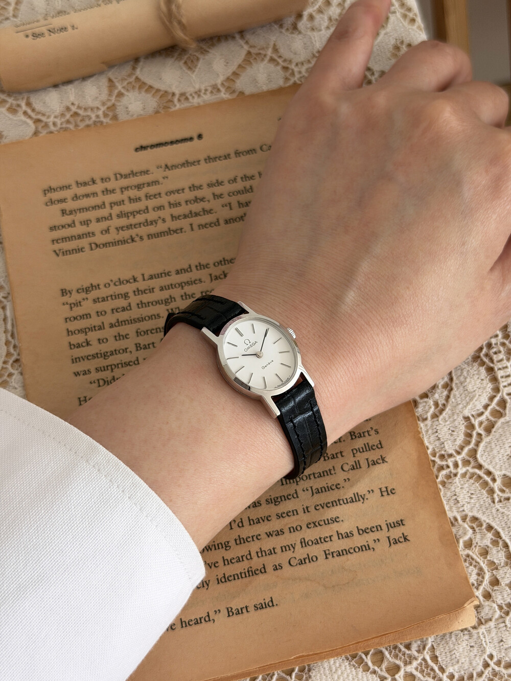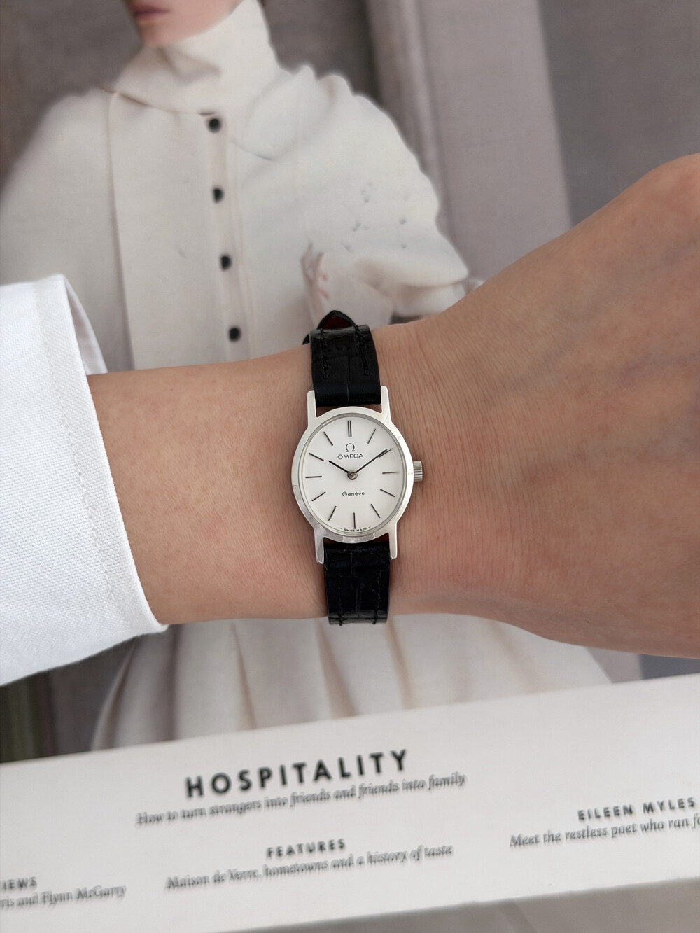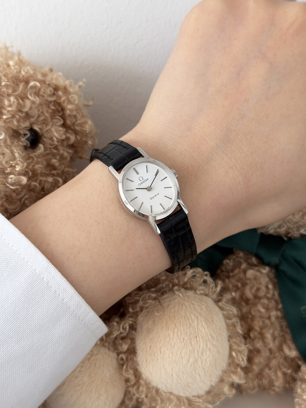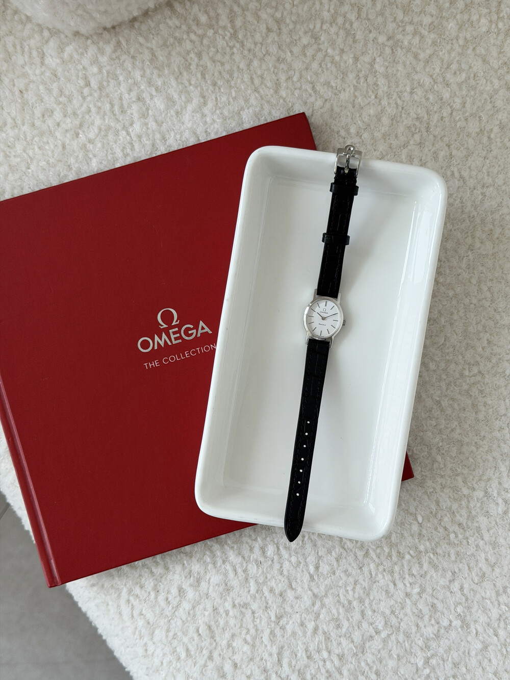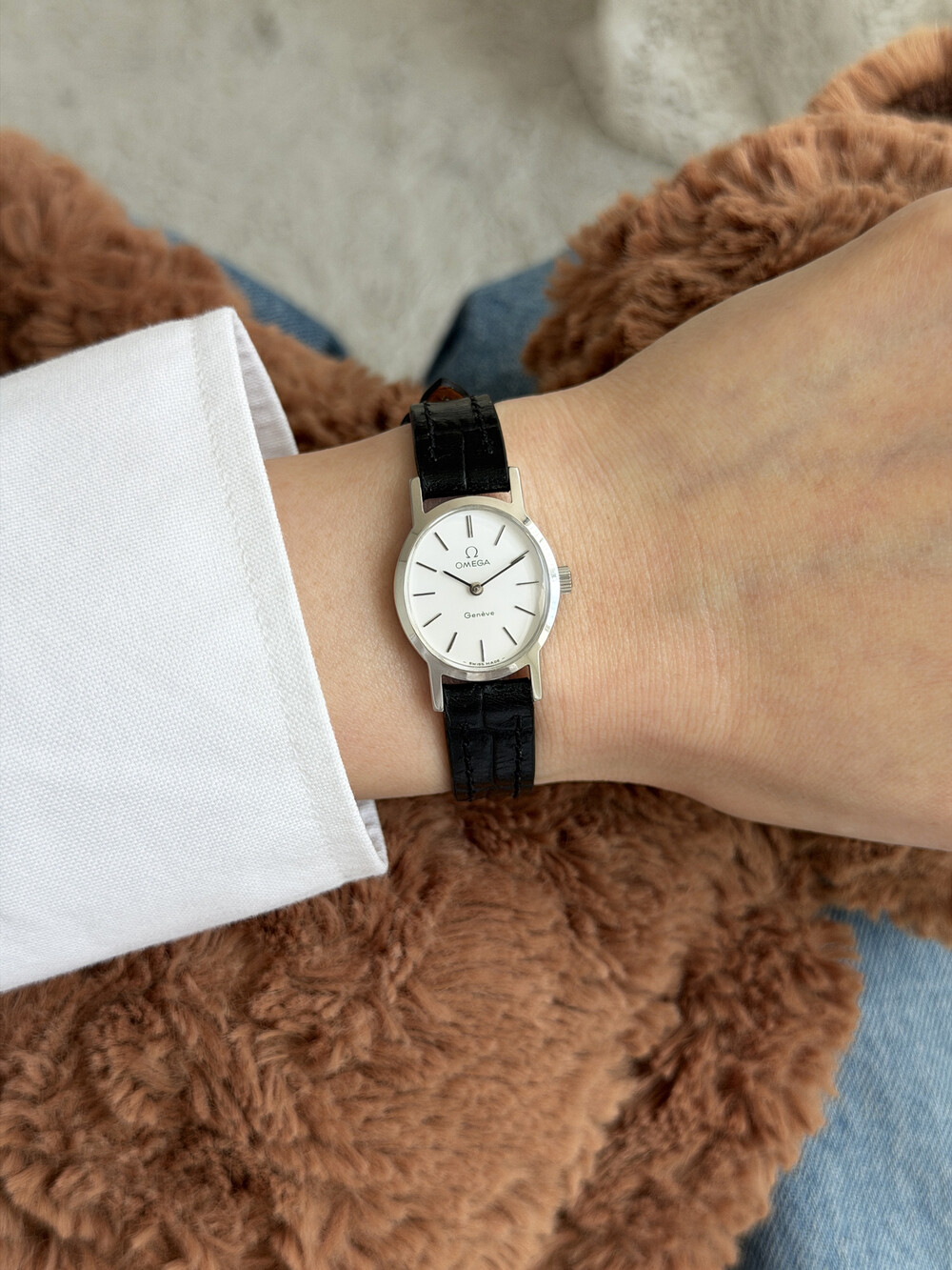 1974년도에 제작된 오메가 드빌 모델로 깔끔한 화이트 다이얼 위를 장식하는