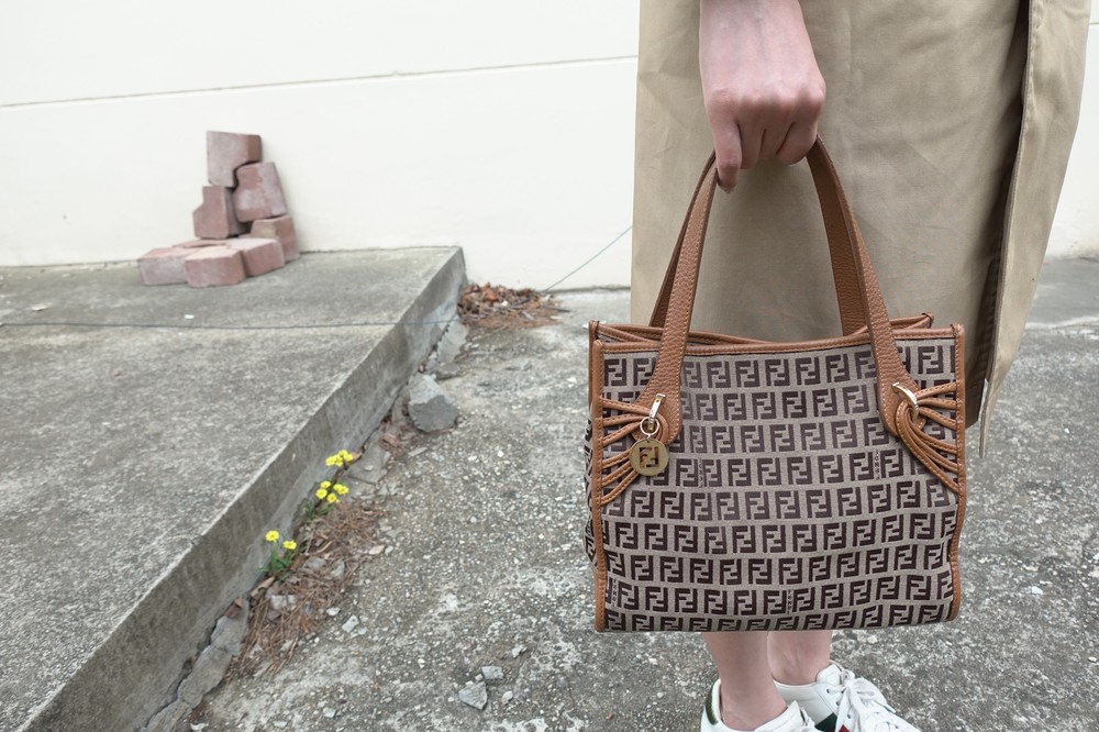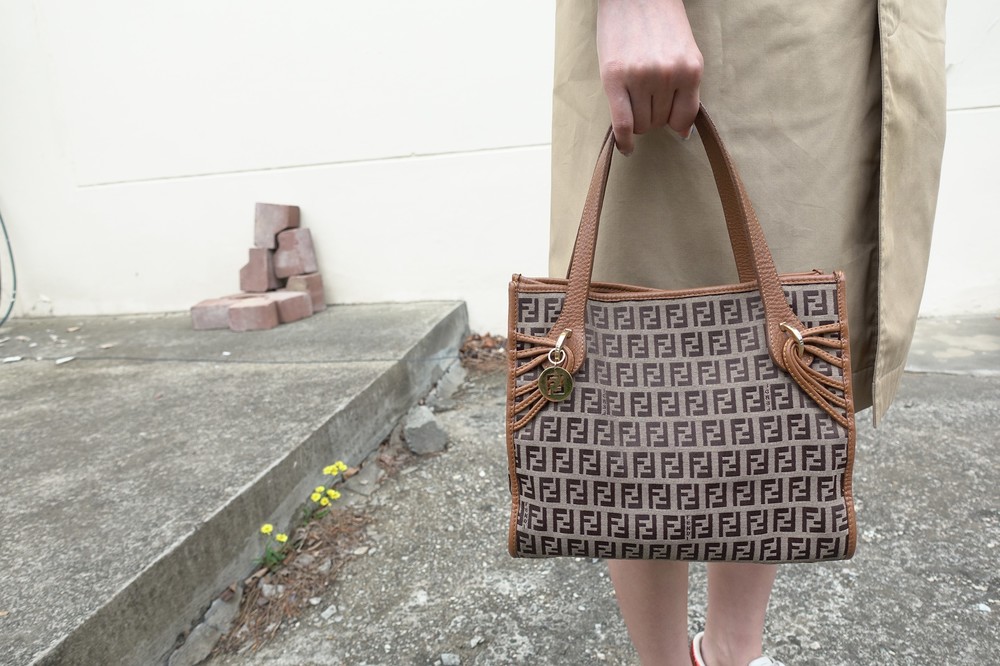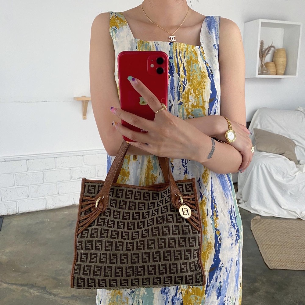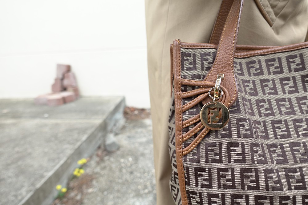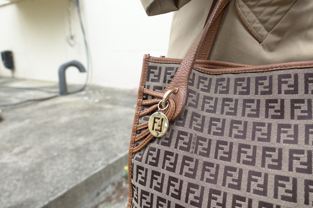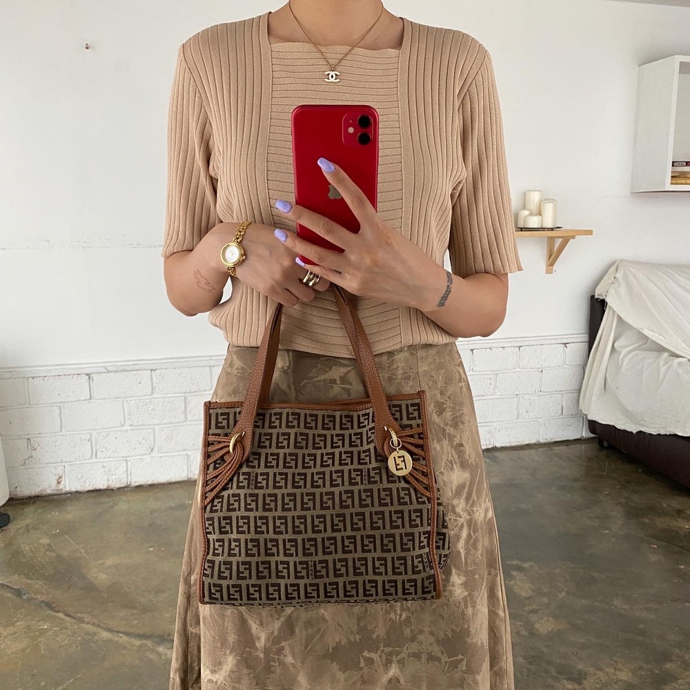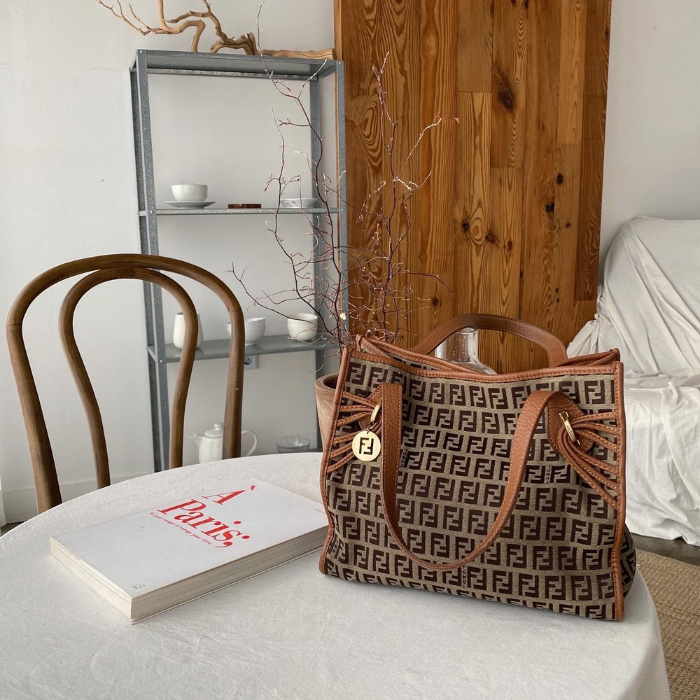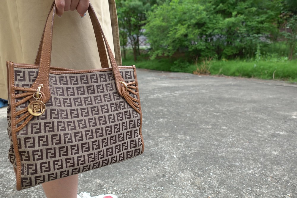미니멀한 주키노 패턴과 브라운 톤의 테두리 가죽과도 조합이 아름다운 펜디 가방입니다.