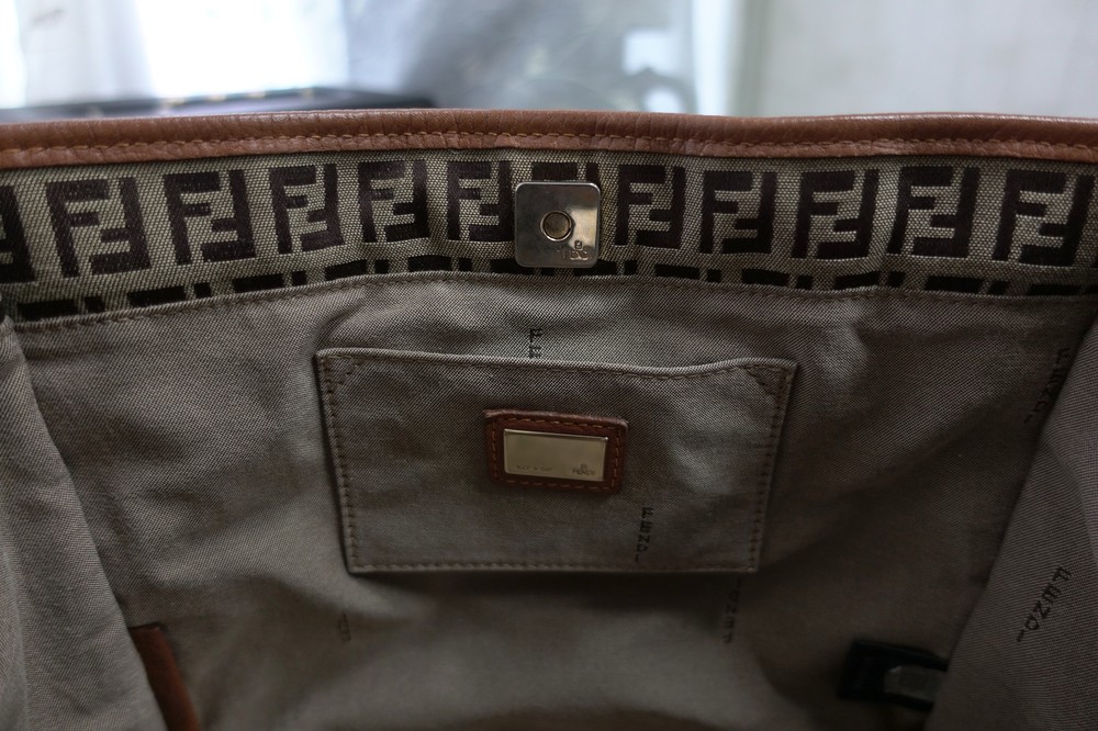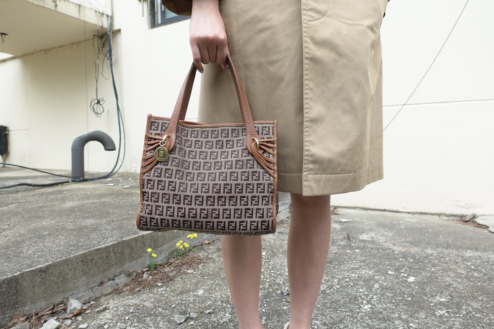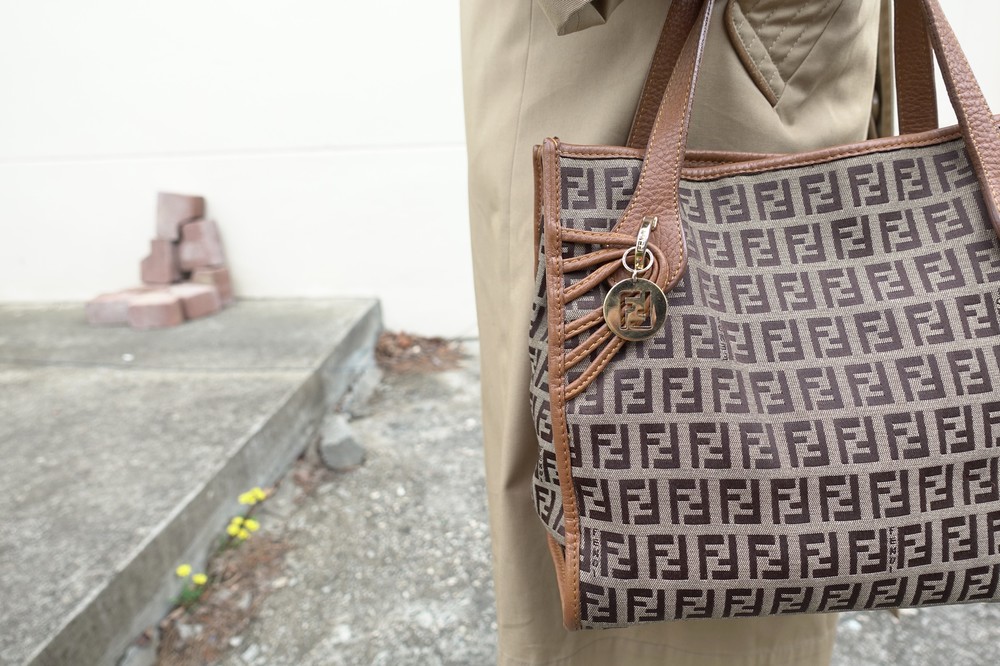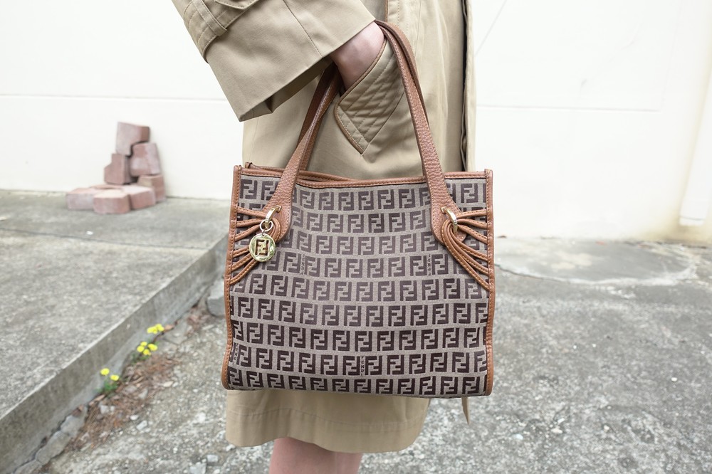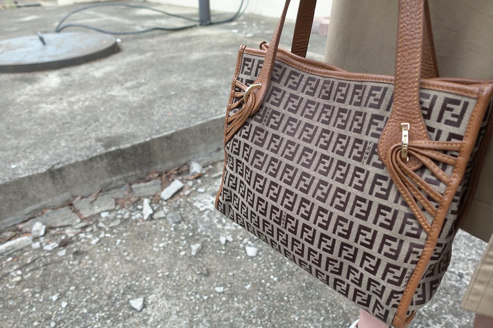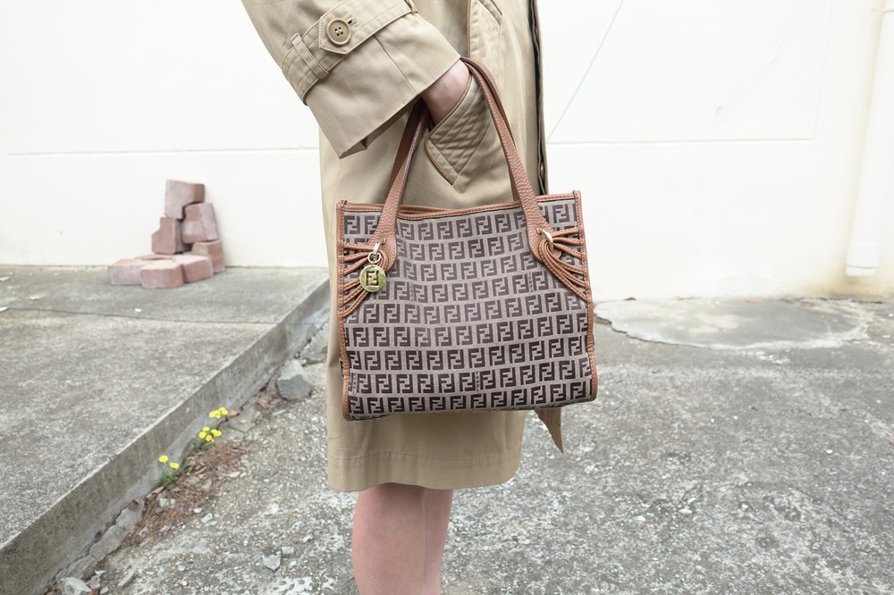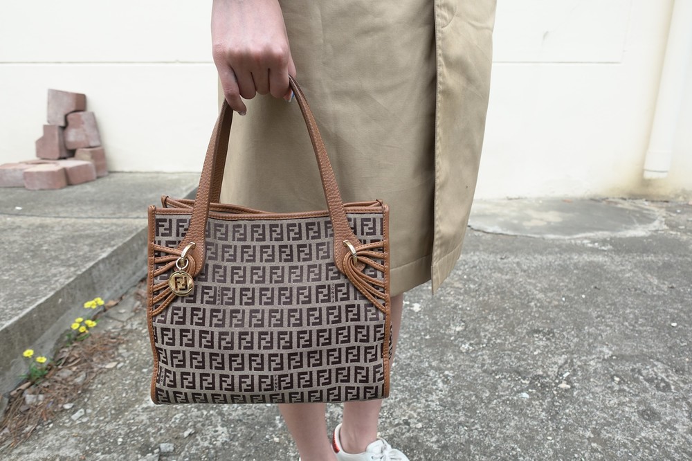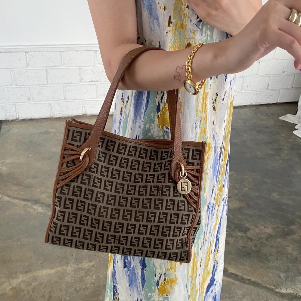미니멀한 주키노 패턴과 브라운 톤의 테두리 가죽과도 조합이 아름다운 펜디 가방입니다.